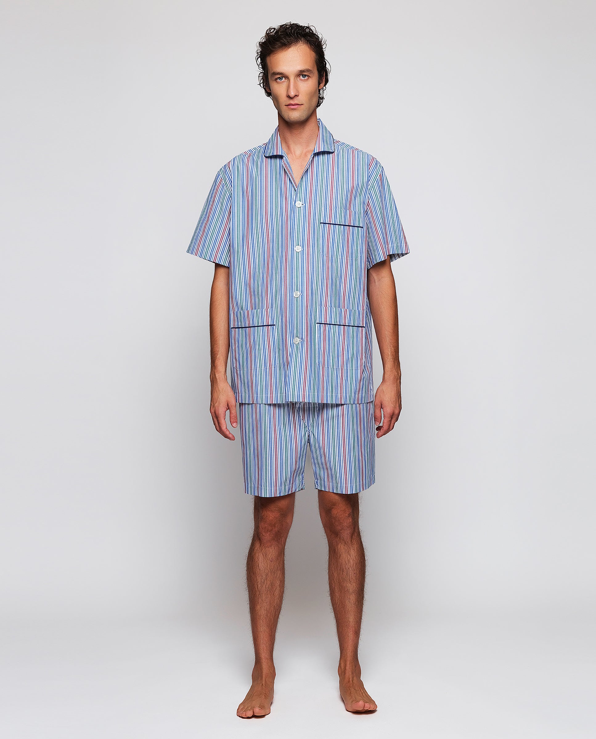 Pijama corto de rayas, 100% algodón popelin. Chaqueta con cuello camisero, manga corta contres bolsillos. Pantalón corto con cintura elástica, por encima de la rodilla, sin bolsillos. Ideal para estar en casa o para dormir.