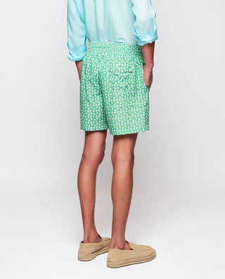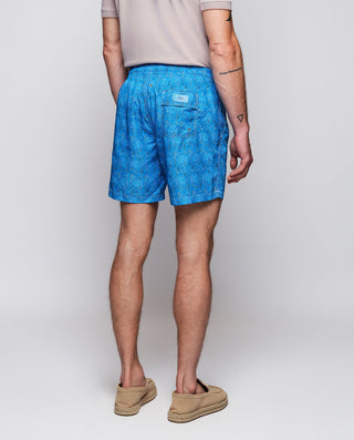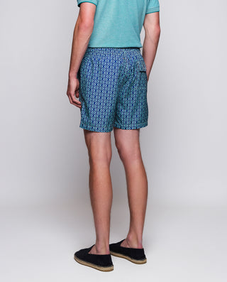 Bañador bermuda, secado rápido, combina con camisas y polos de MIRTO para estilos de piscina y playa. Tejido seersucker reciclado, tacto suave. Dos bolsillos laterales, bolsillo trasero solapa. Cintura elástica con cordón. Forrado con malla sin costuras.