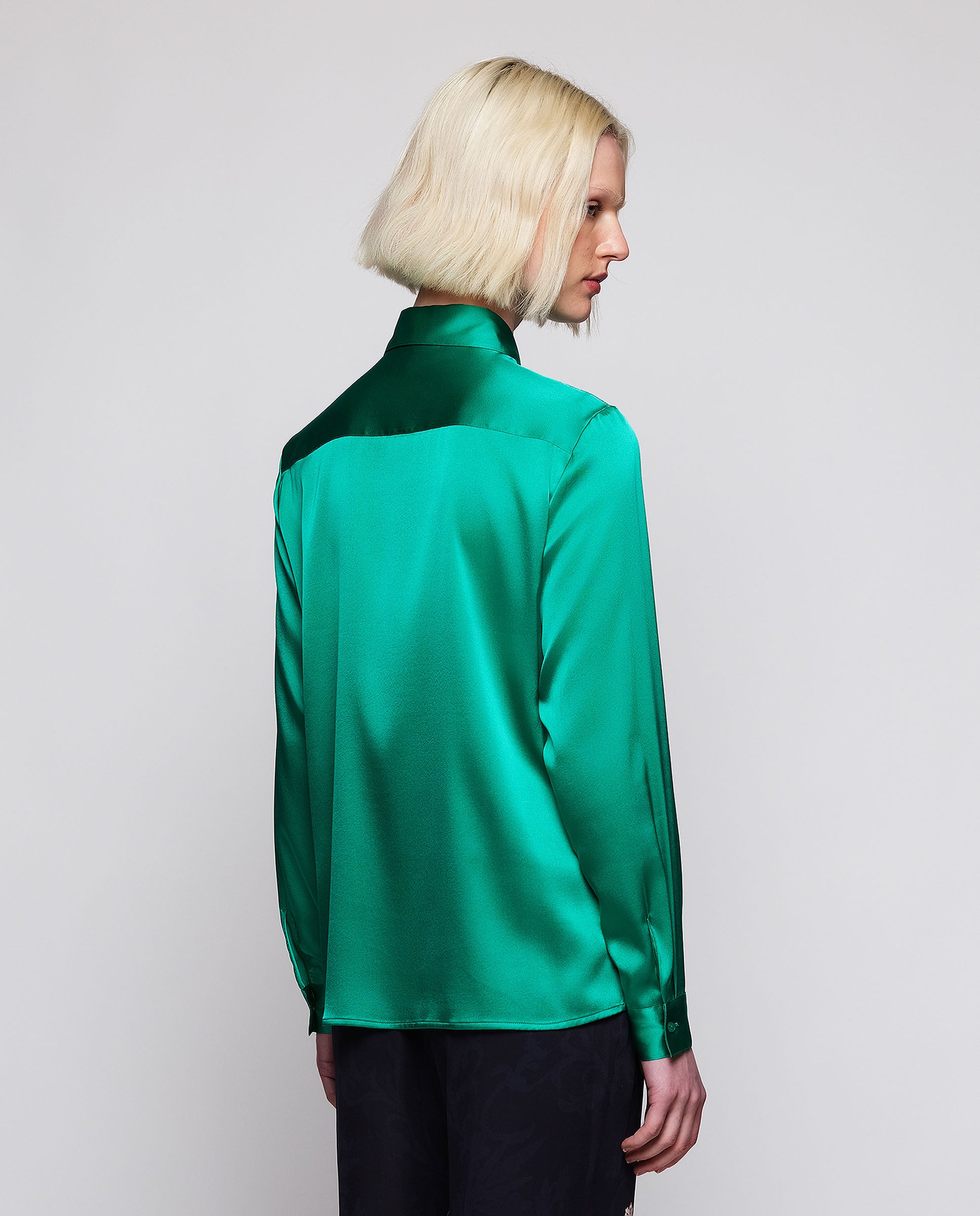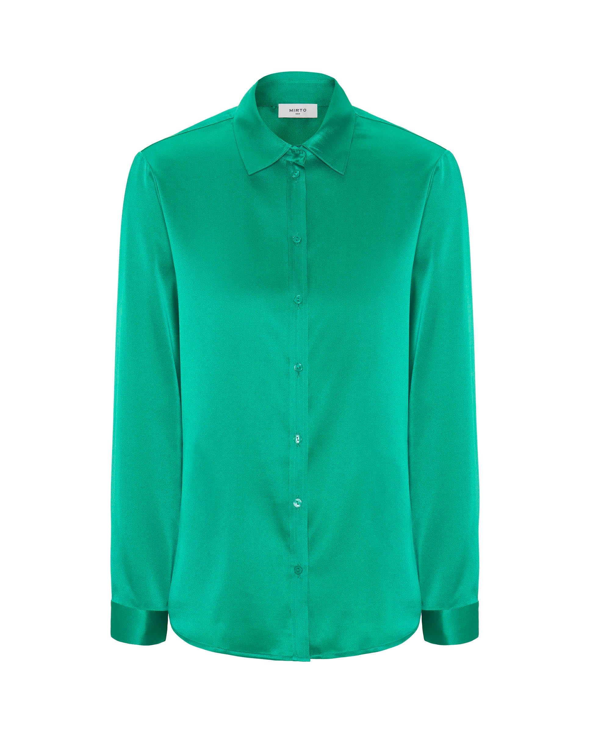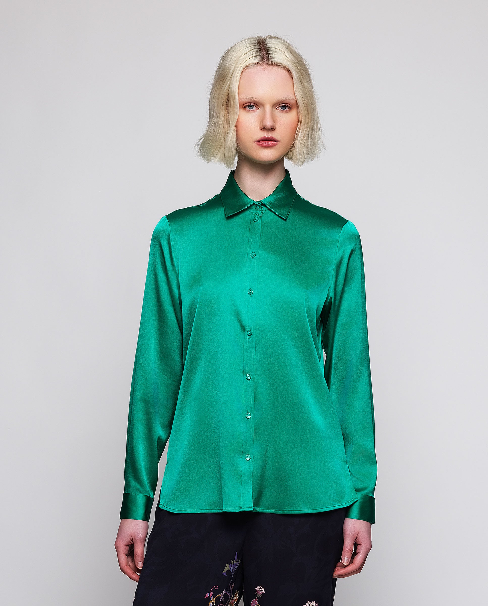 Blusa verde de seda elástica. Cuello camisero, cierre central con botones, manga larga con puño. Fit recto. Un color elegante, un tejido de lujo naturalmente cómodo, un estilo propio. Para tus looks de día y de noche.