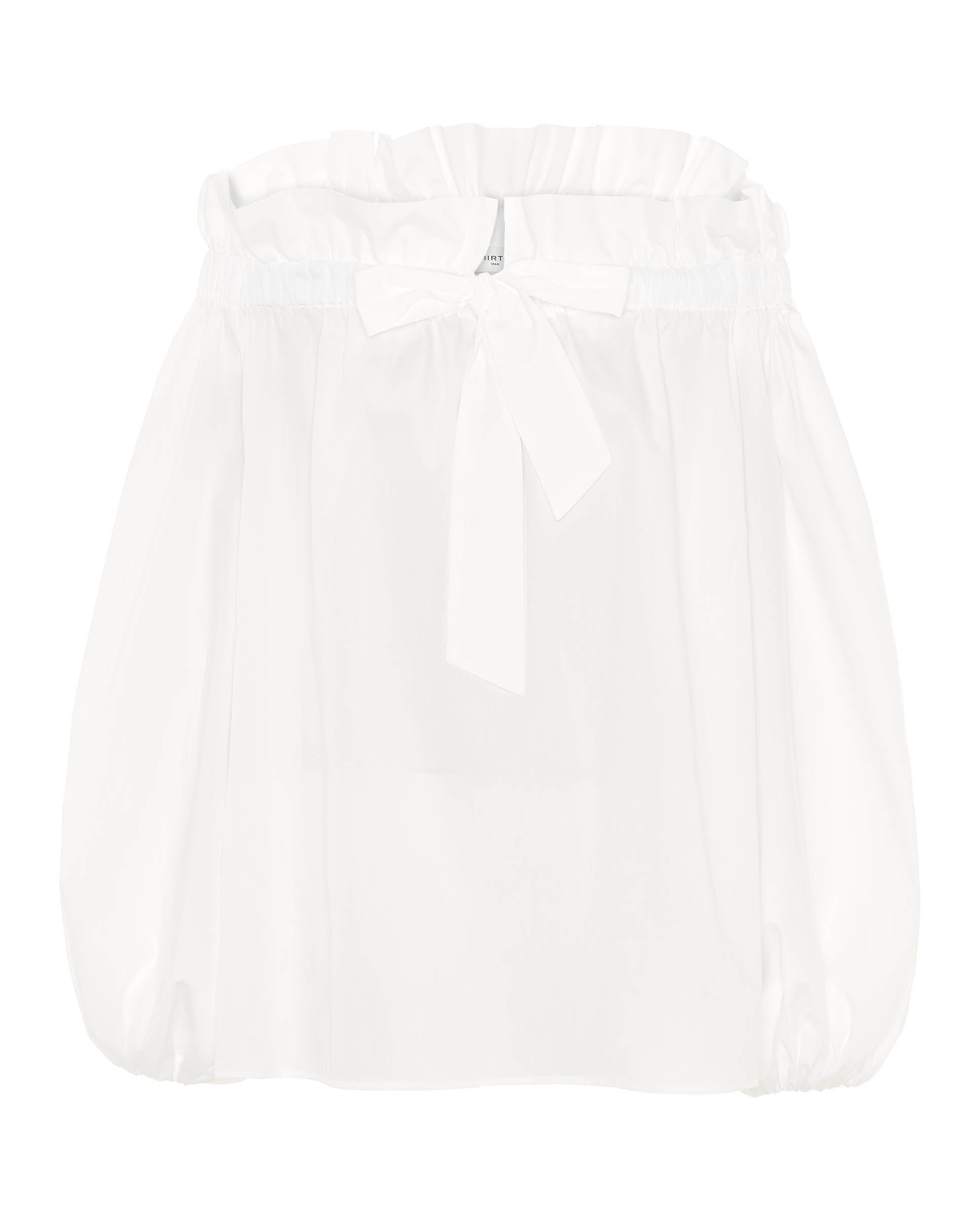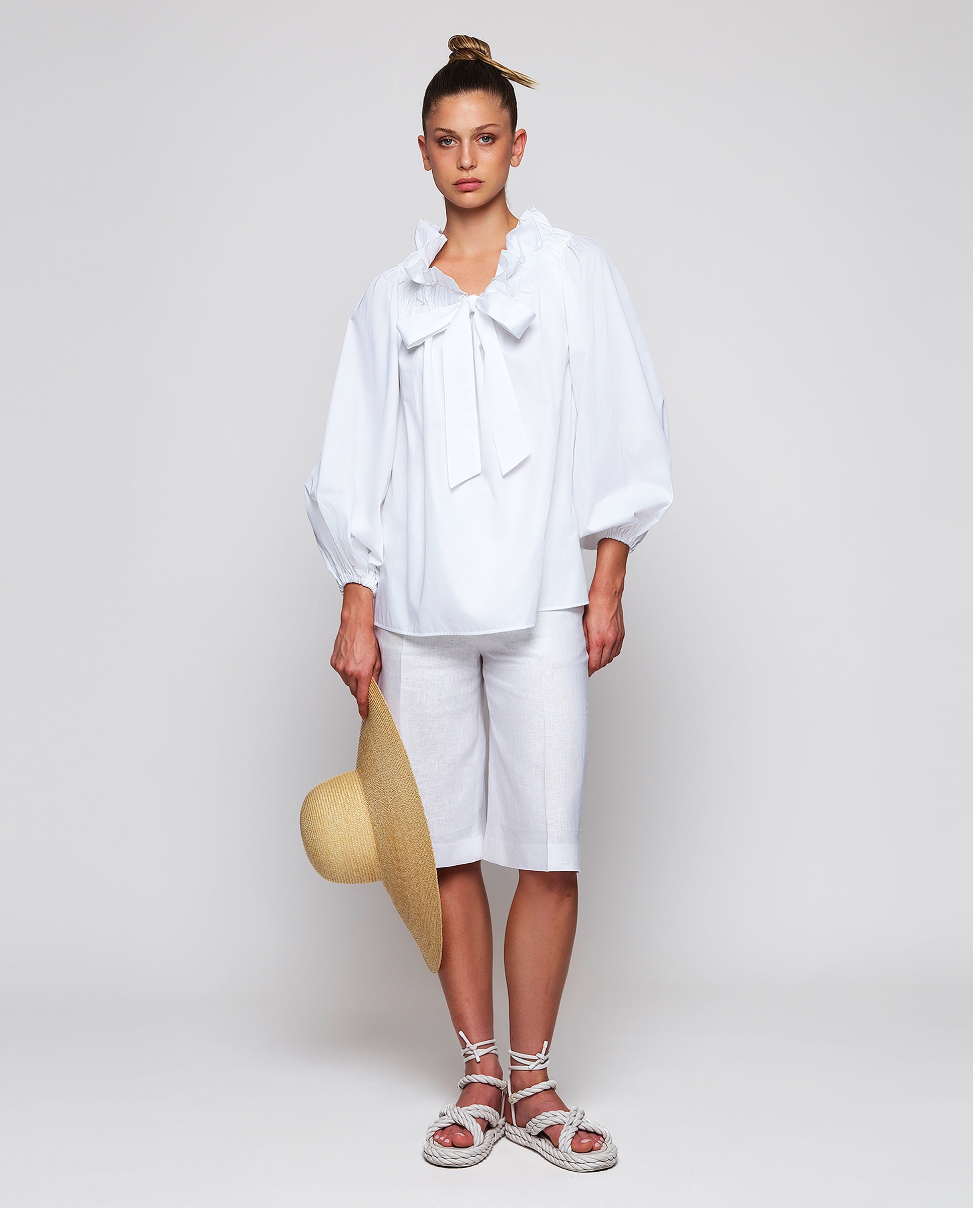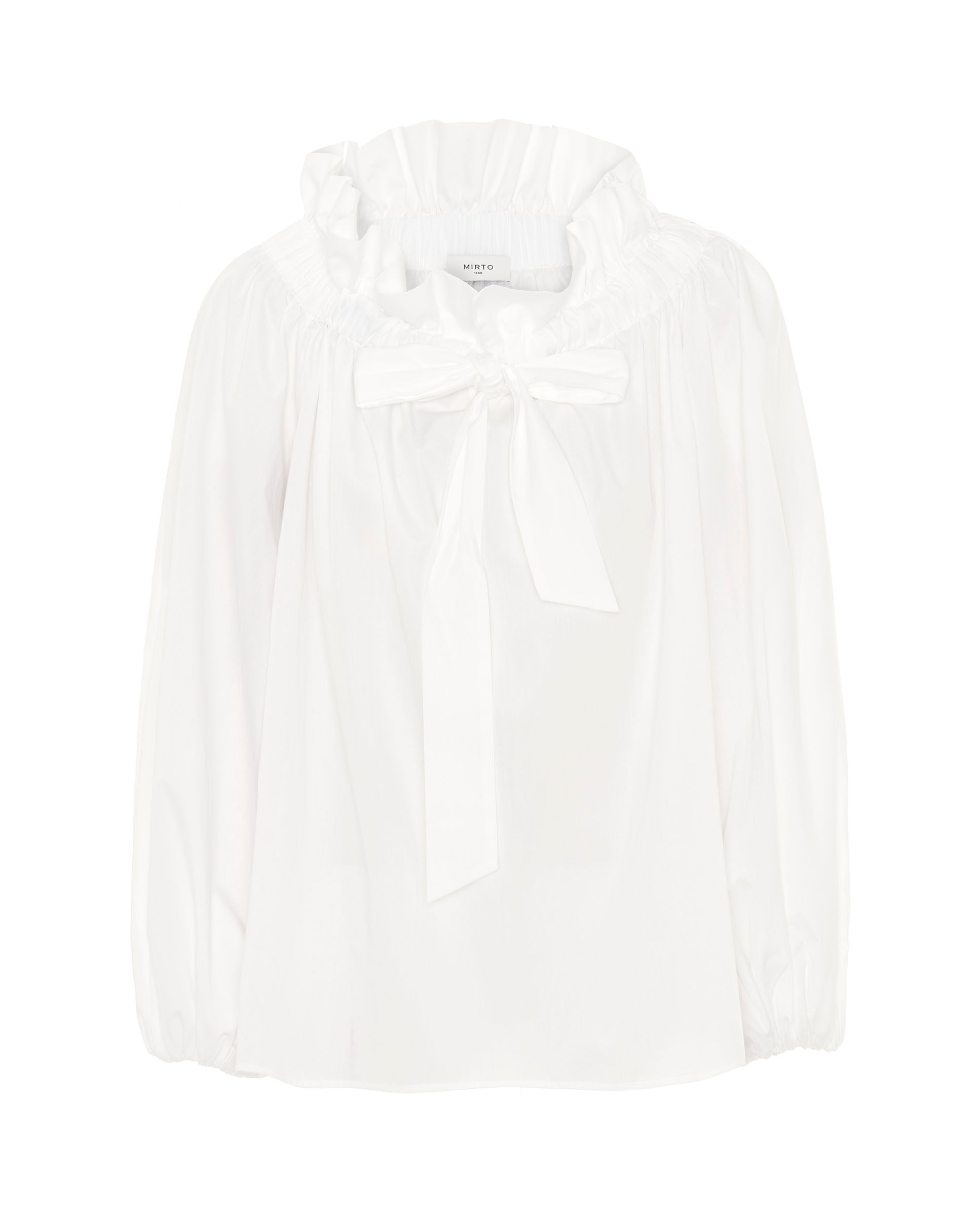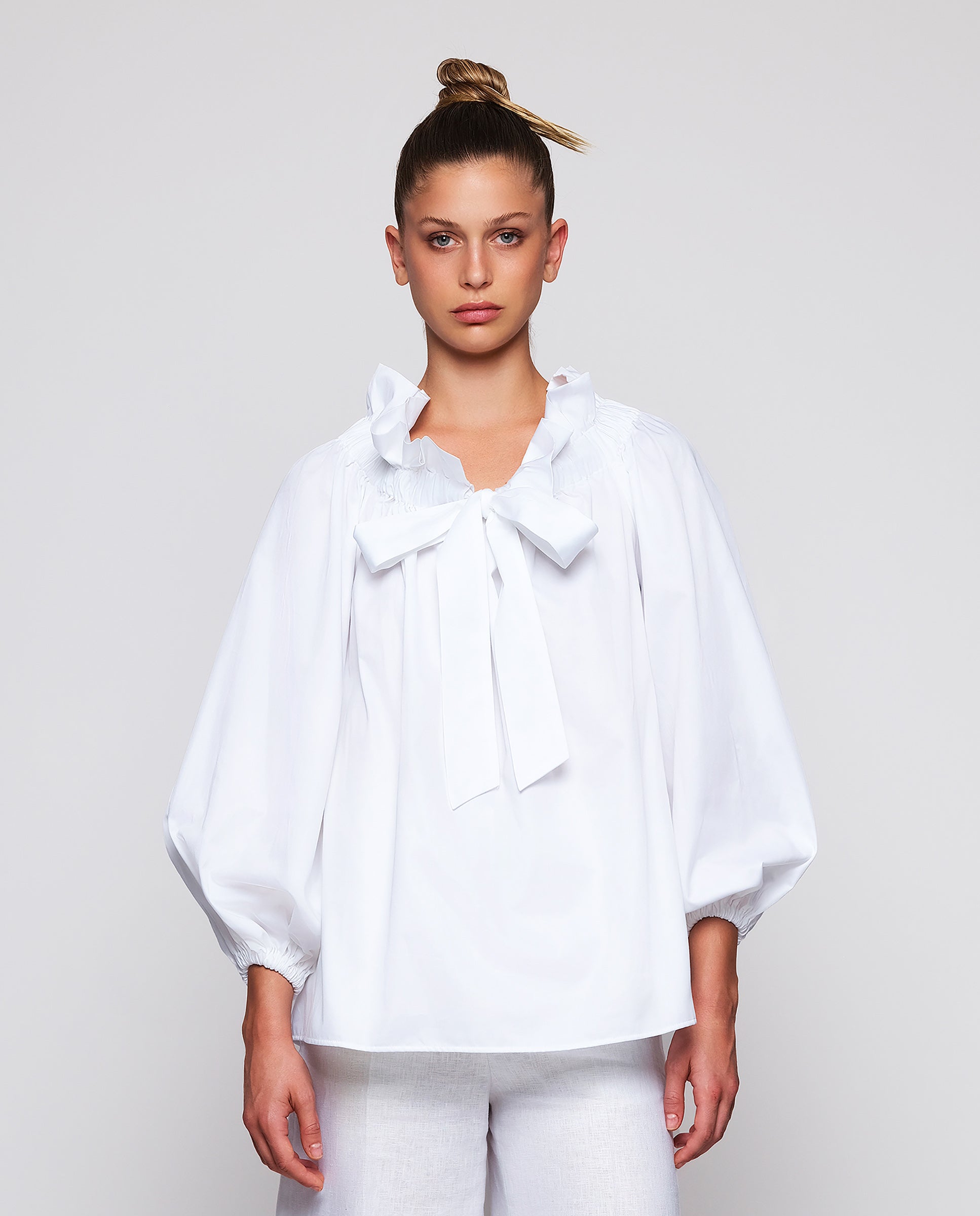 Top blanco manga larga de 100% algodón. Escote con volante ajustable con lazada y manga larga abullonada. Fit amplio con vuelo.