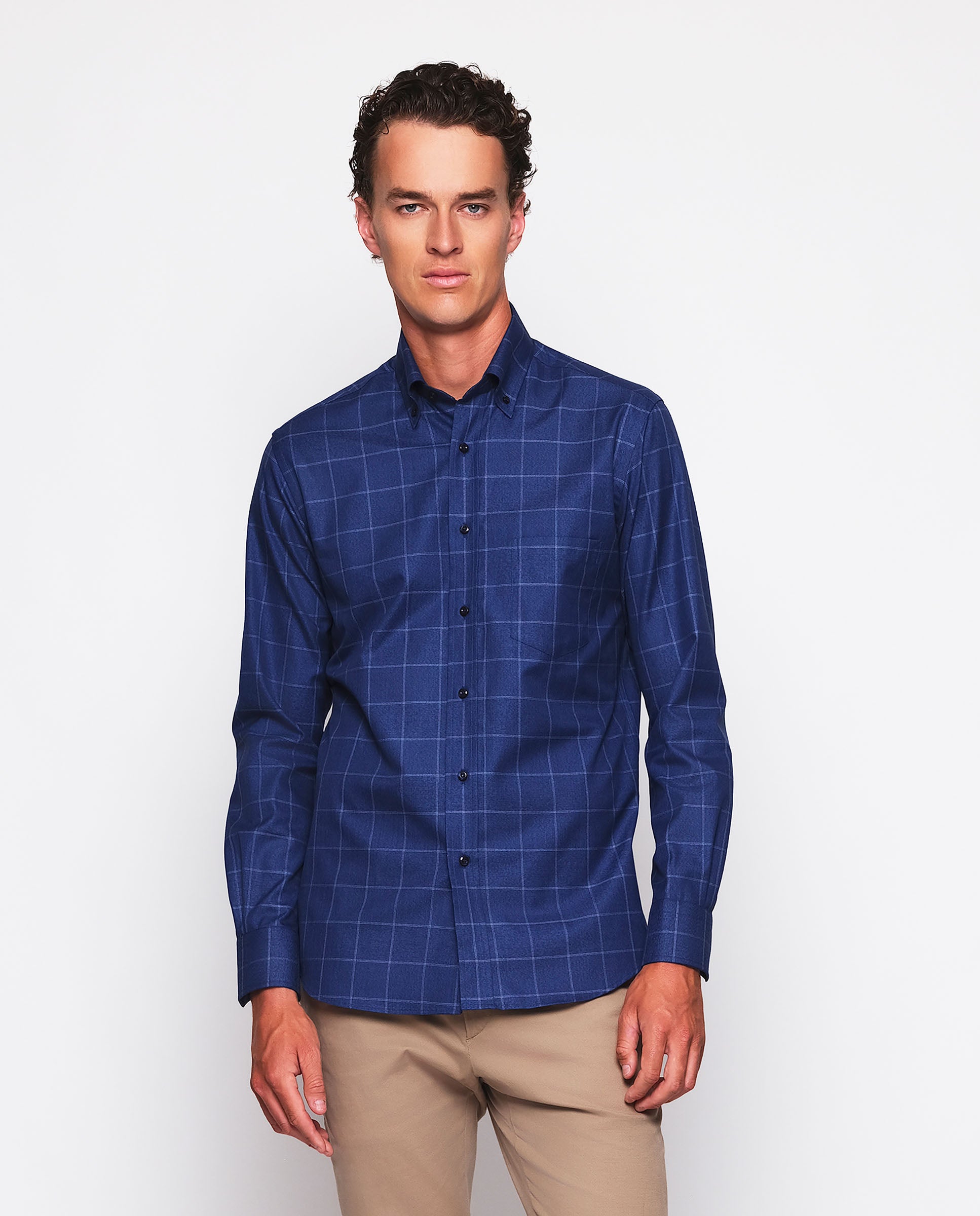Camisa casual de cuadros 100% algodón con estructura twill e hilatura melange, cuello con botones, bolsillo en pecho, manga larga, puño con doble botón, classic fit. Para estilos clásicos, atemporales y contemporáneos.