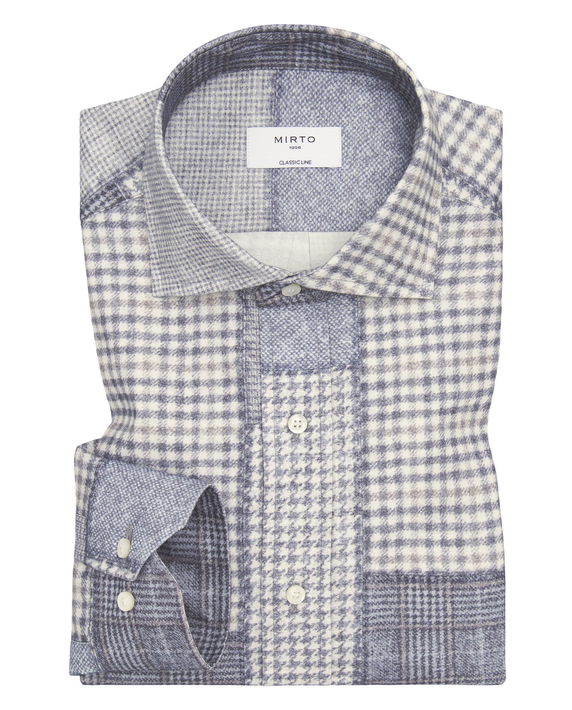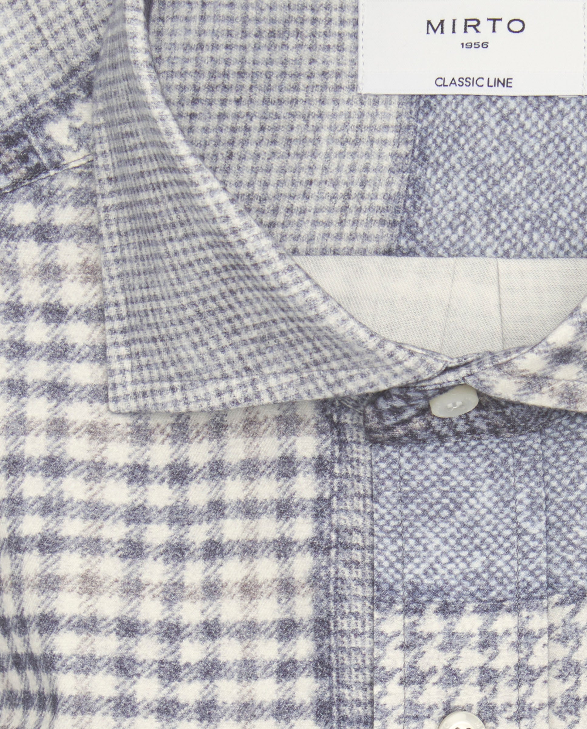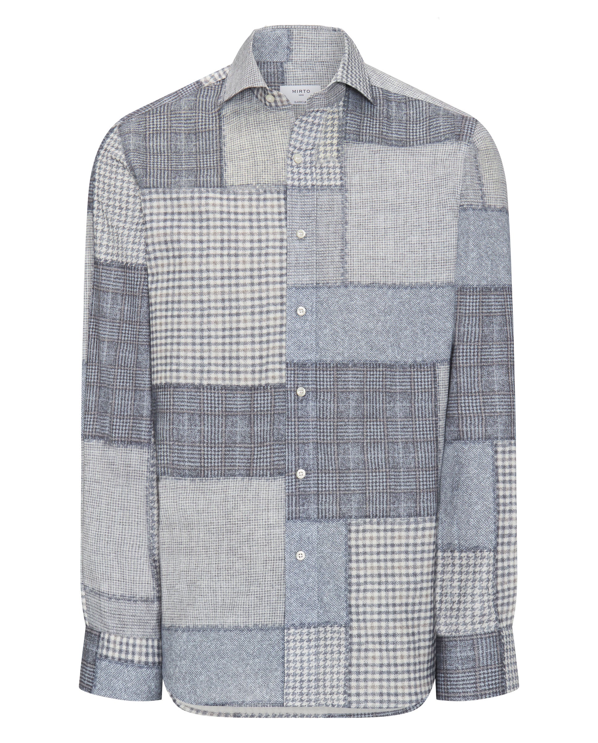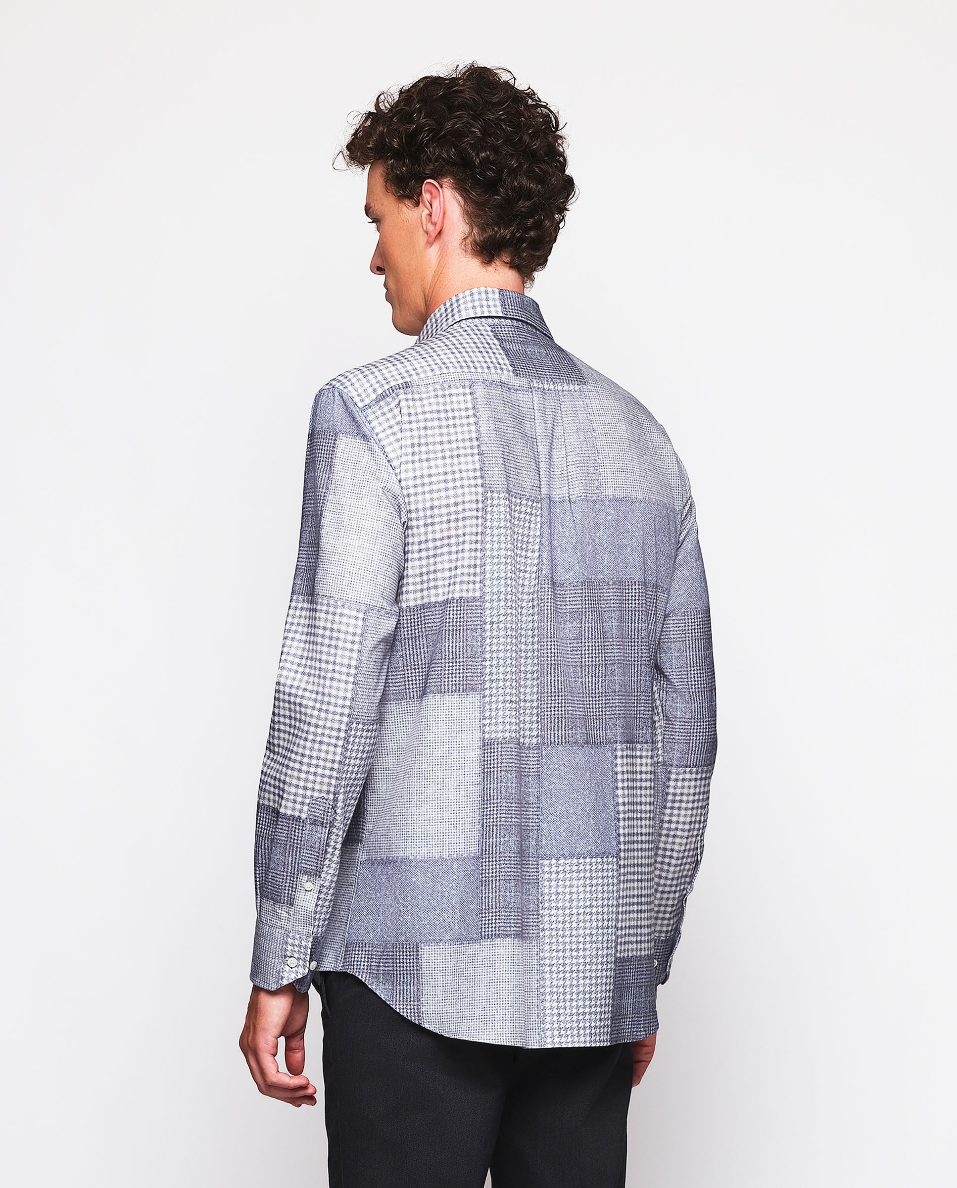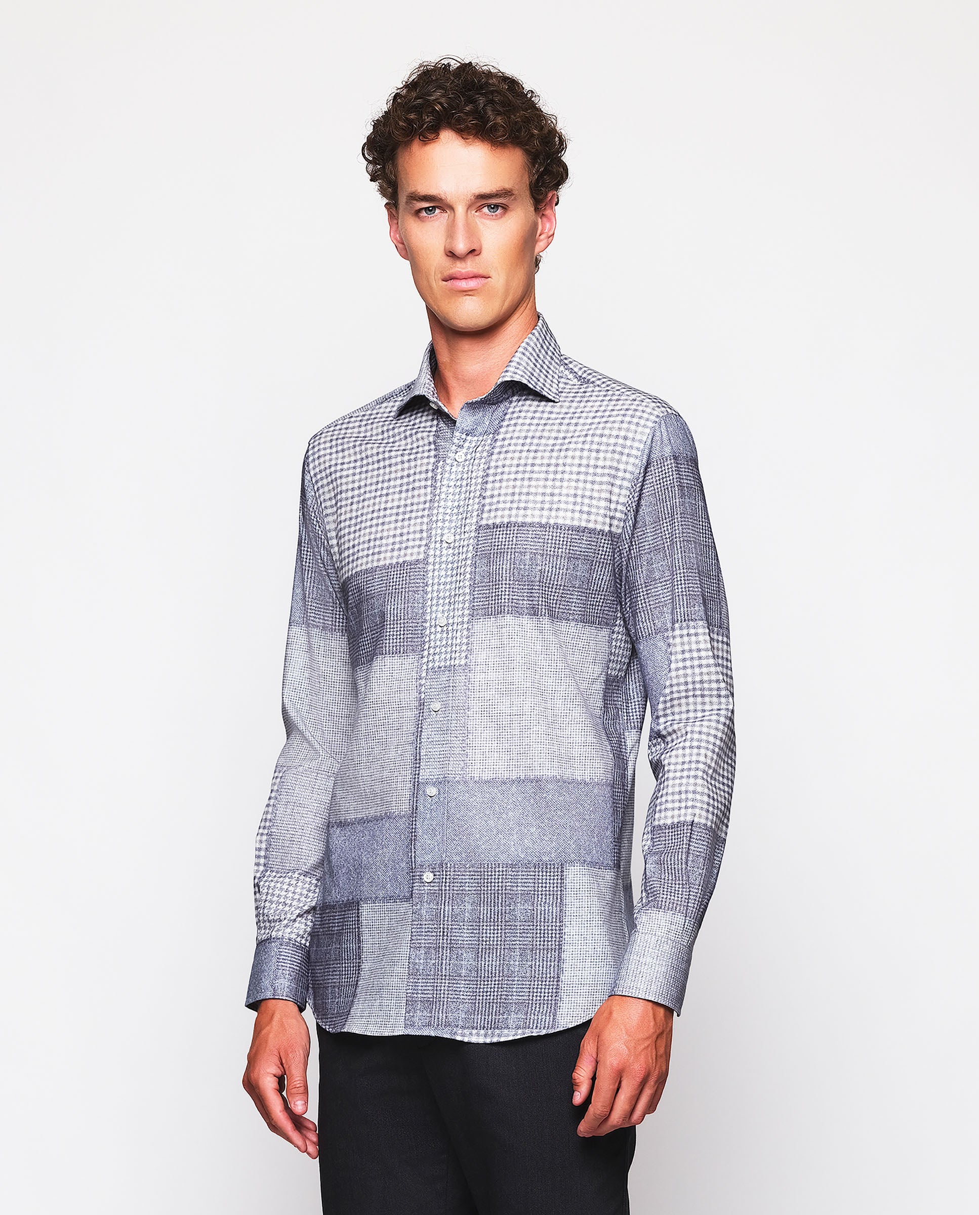 Camisa casual patchwork 100% algodón de franela, cuello italiano con varillas extraíbles, sin bolsillo, manga larga, puño con doble botón, classic fit. Una camisa y estampado singular que marca tendencia y aporta un toque de distinción a nuevos estilos.
