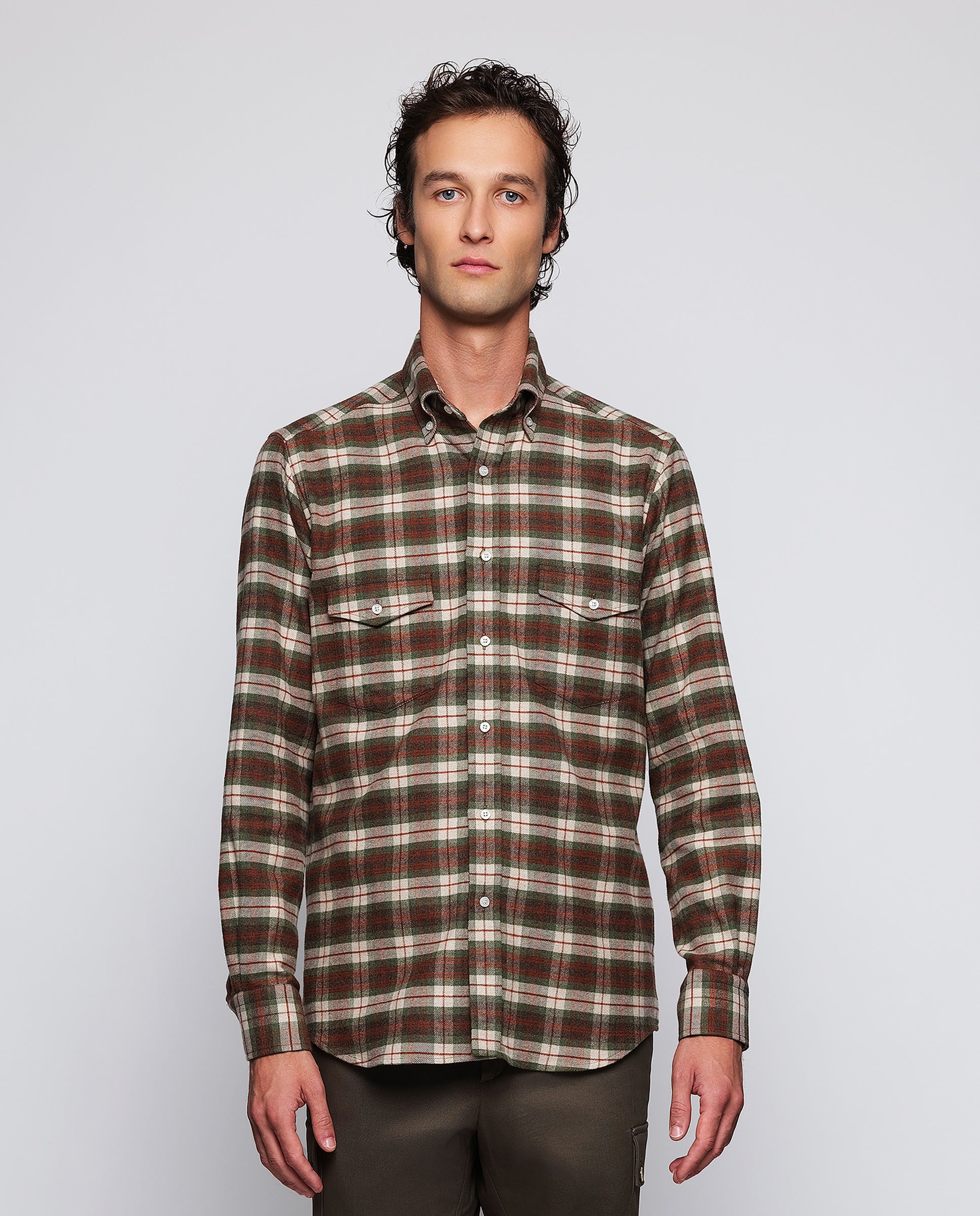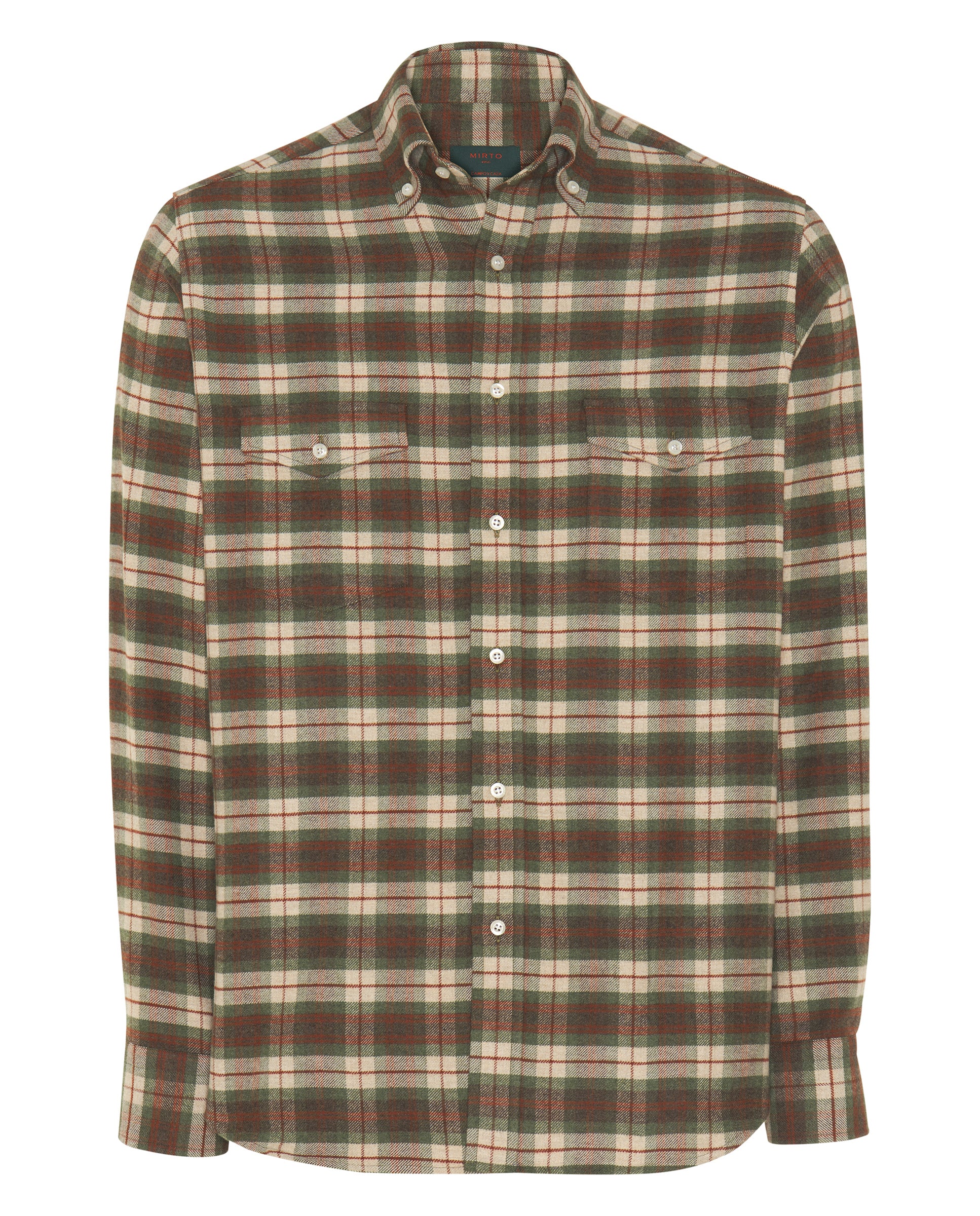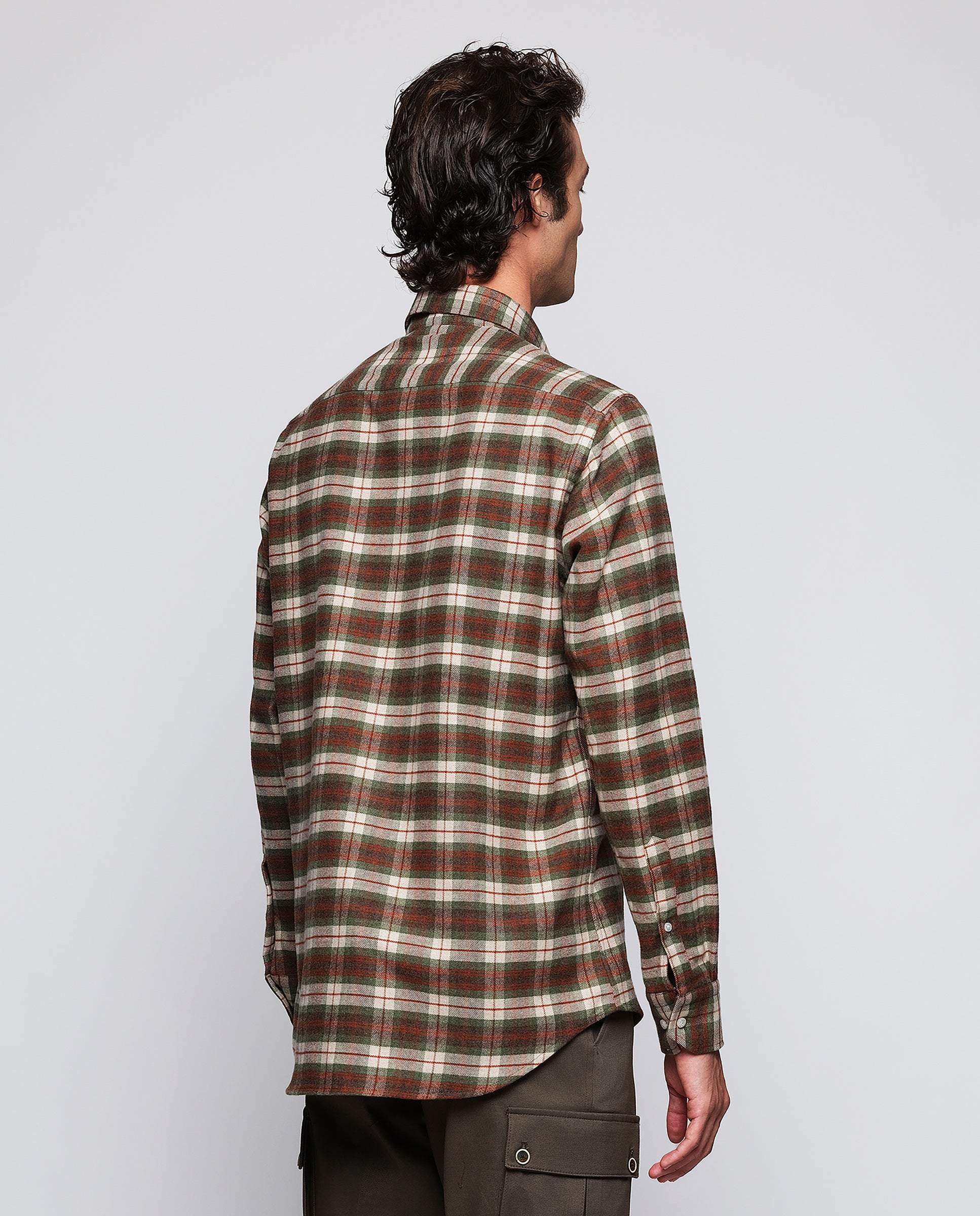 Camisa casual manga larga, dos bolsillos con tapetas, 100% algodón franela, cuello con botones y espalda con tablón central.