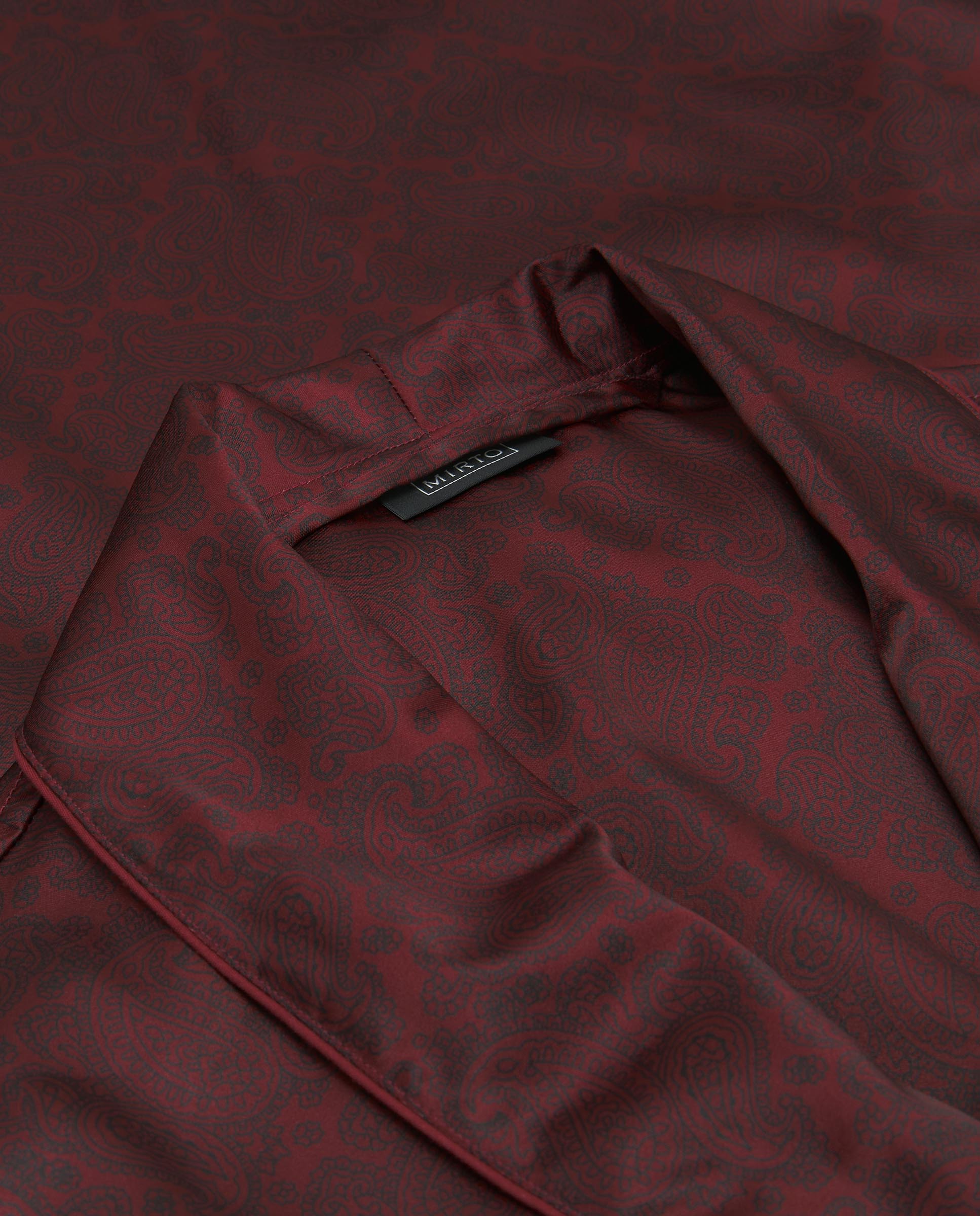 Bata cruzada estampado paisley 100% poliéster satinado con tacto sedoso, cuello con solapa, tres bolsillos, vivos al tono y cierre con cinturón. Completa el look con pijama largo a juego.