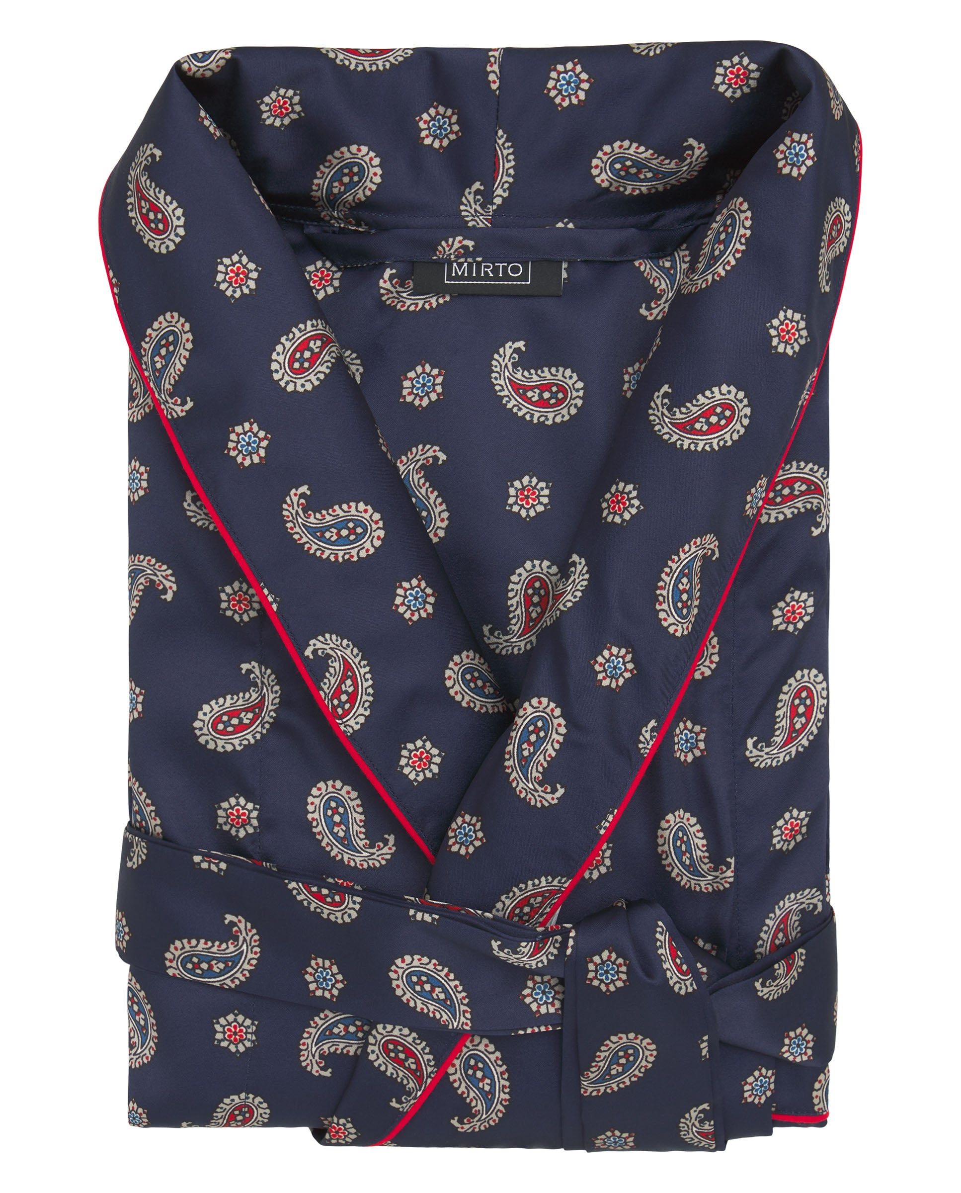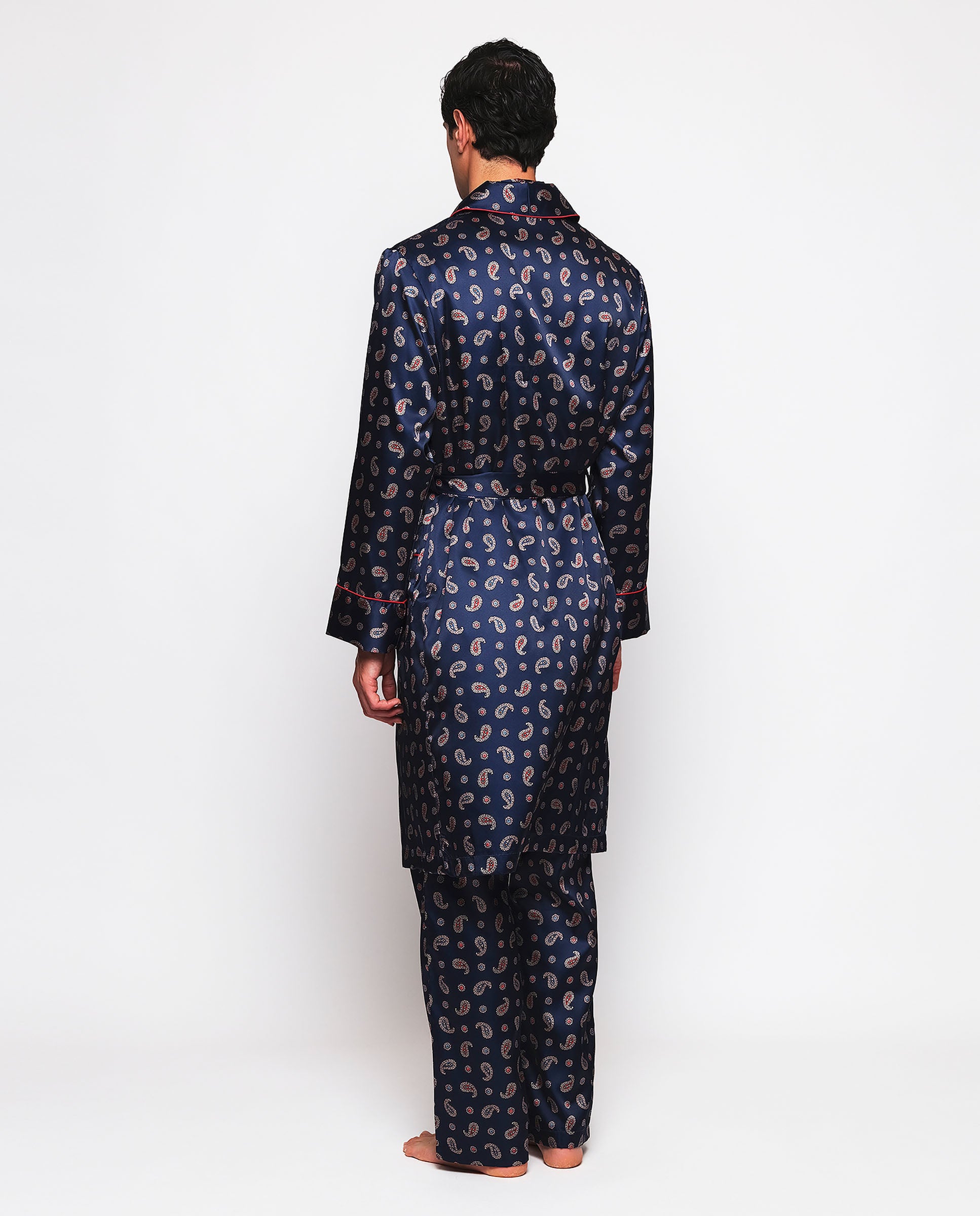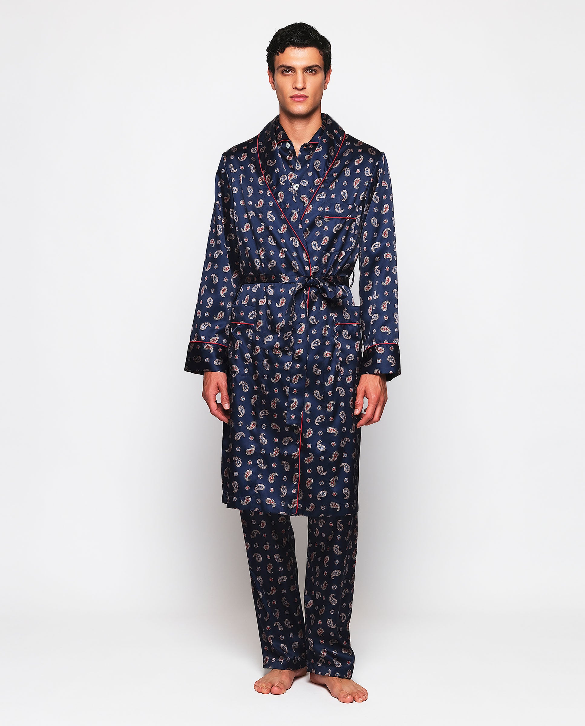 Bata cruzada estampado paisley 100% poliéster satinado con tacto sedoso, cuello con solapa, tres bolsillos, vivos rojos y cierre con cinturón. Completa el look con pijama largo a juego.