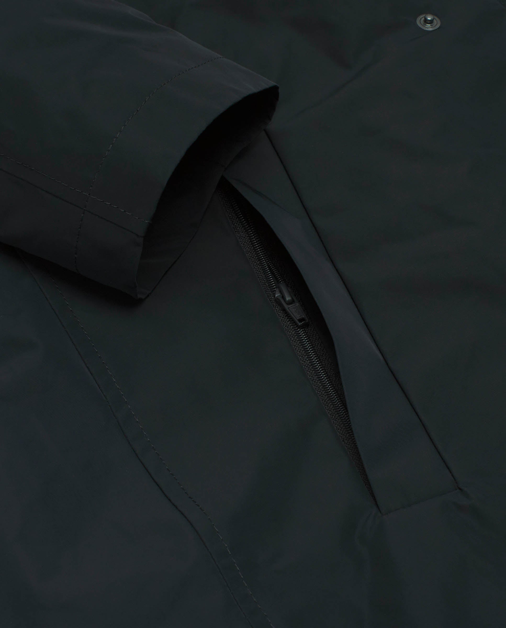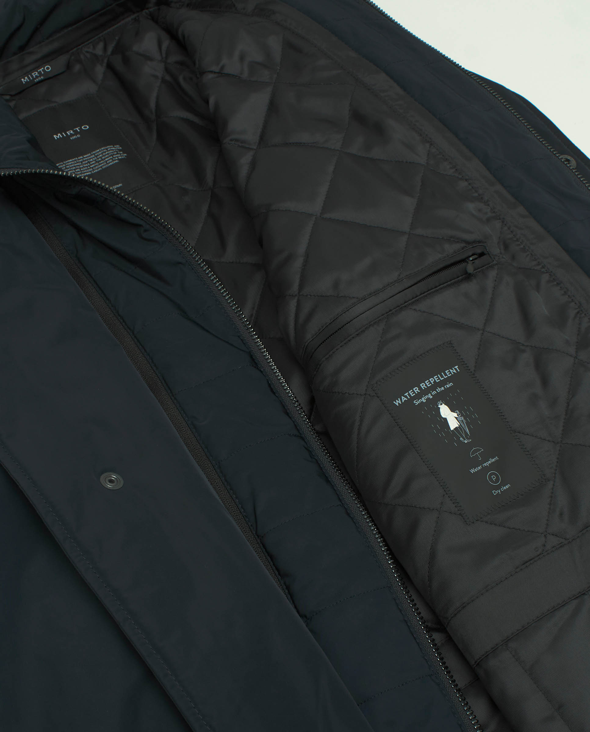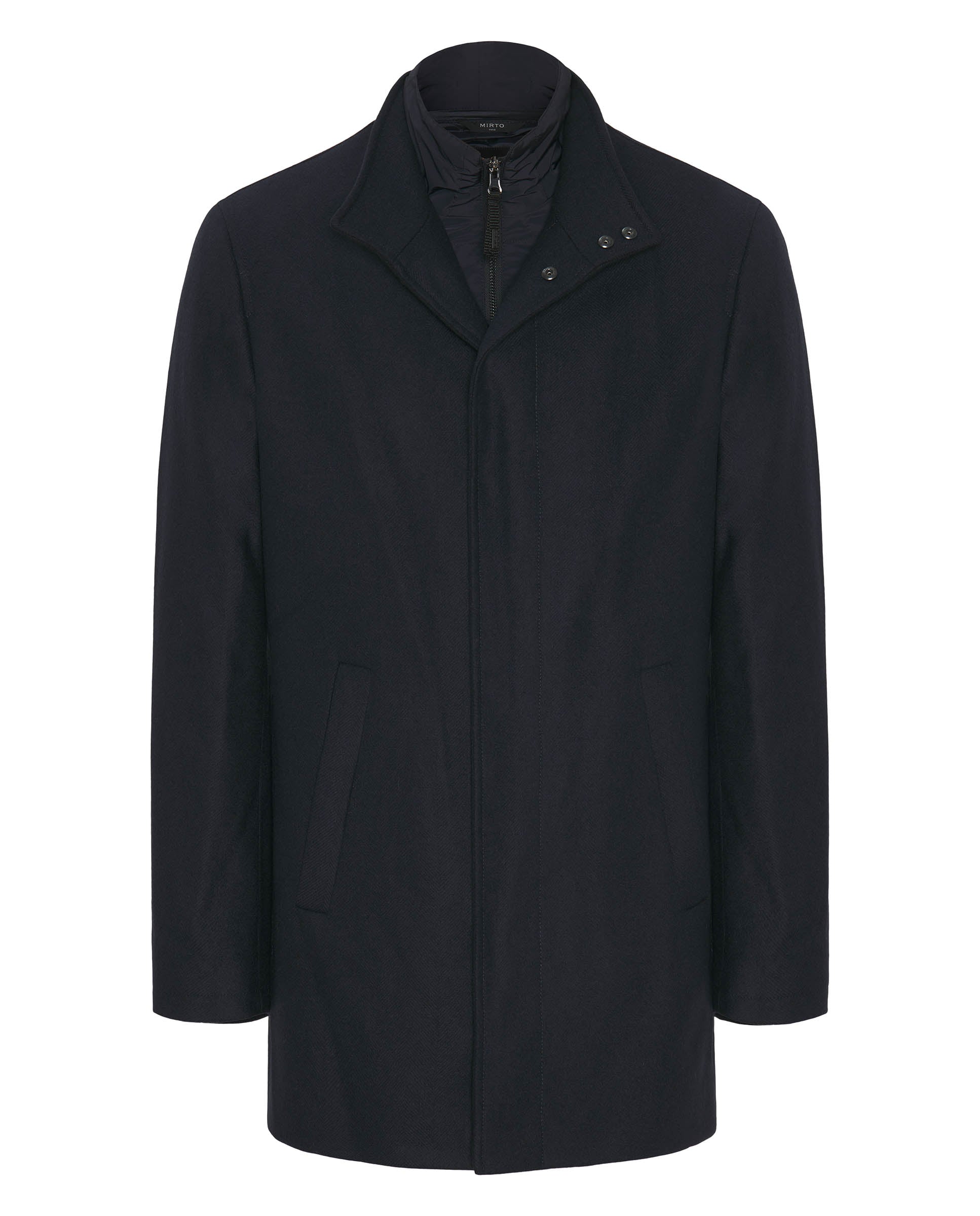 Abrigo tres cuartos en azul marino de paño estructura espiga y pecherín desmontable. Bolsillo lateral con doble fondo, cierre central con botón automático y una abertura trasera. Elegante tradición sartorial, eleva estilos urbanos.