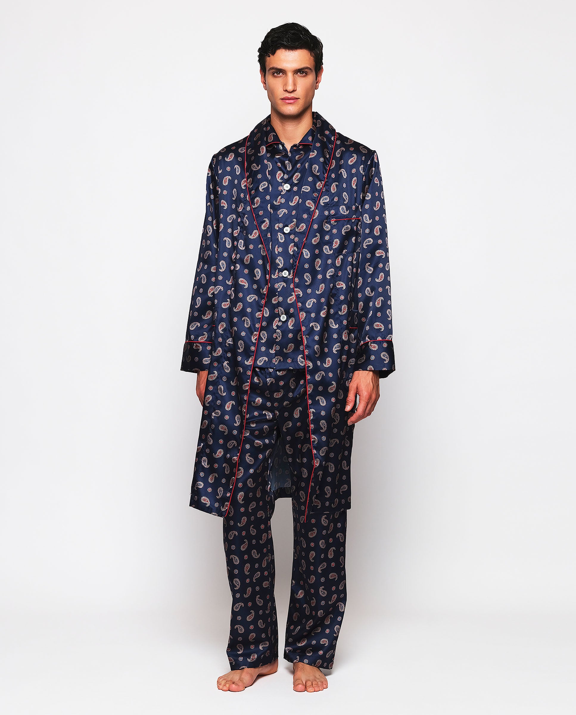 Pijama largo estampado paisley, 100% poliéster satinado con tacto sedoso. Chaqueta manga larga con tres bolsillos, cuello camisero y vivos rojos. Pantalón largo a juego, de corte recto, con cintura elástica y cierre con botones. Completa el look con bata a juego.