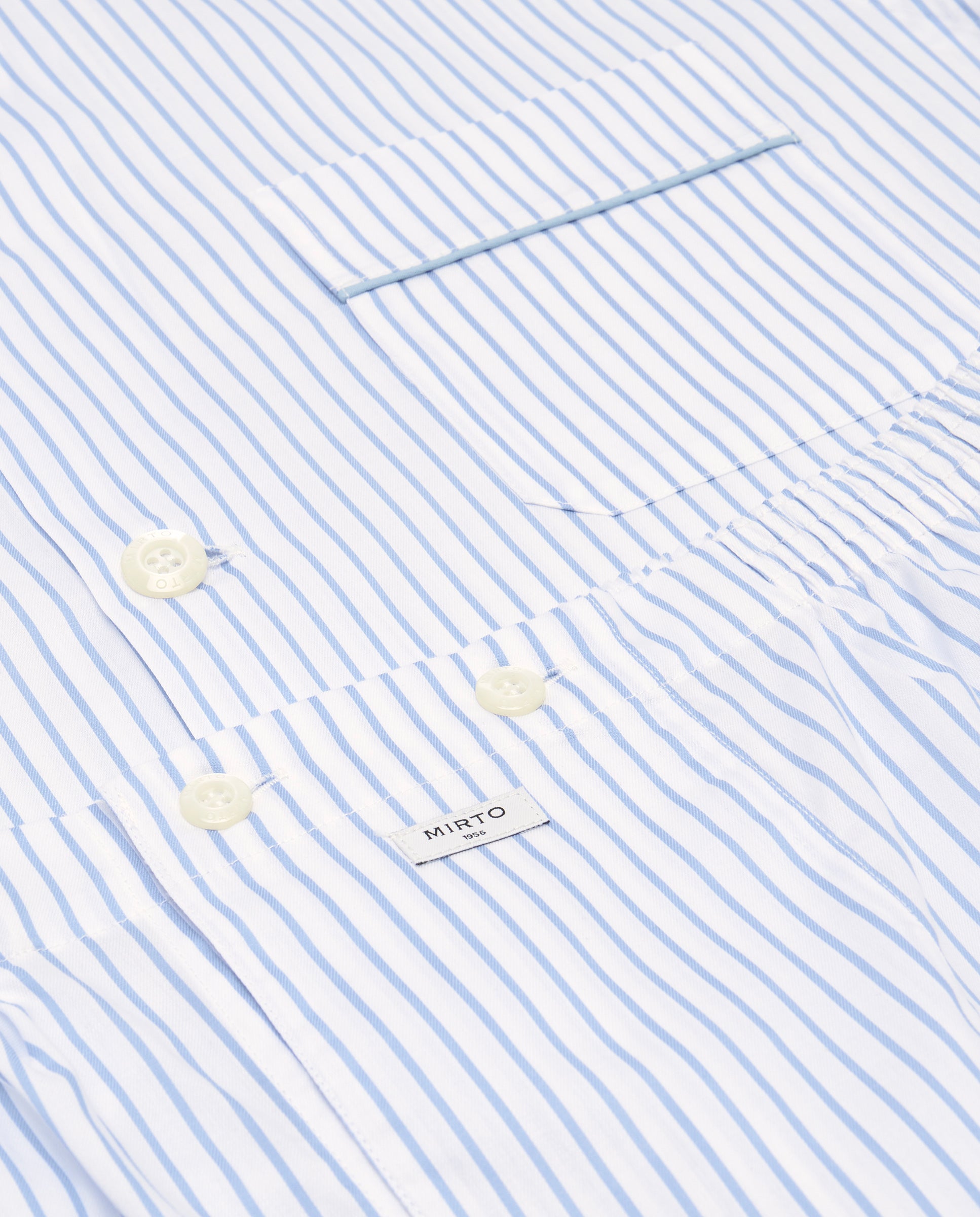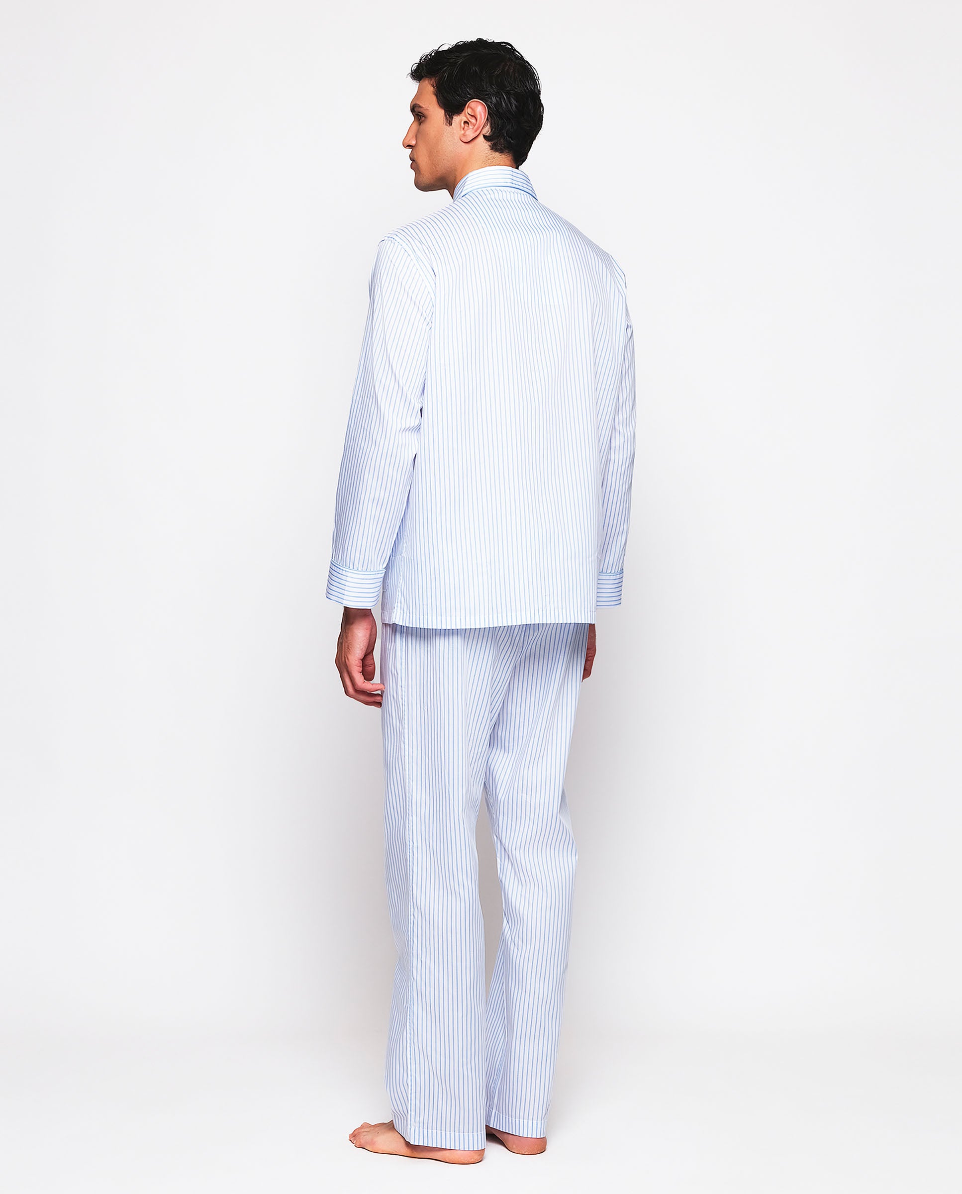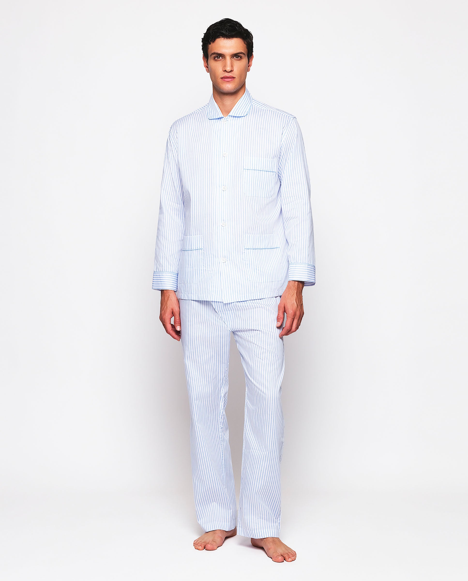 Pijama largo de rayas 100% algodón con estructura twill. Chaqueta abierta con botones, cuello camisero, manga larga, tres bolsillos y vivos al tono. Pantalón largo a juego de corte recto con cintura elástica y cierre con botones.