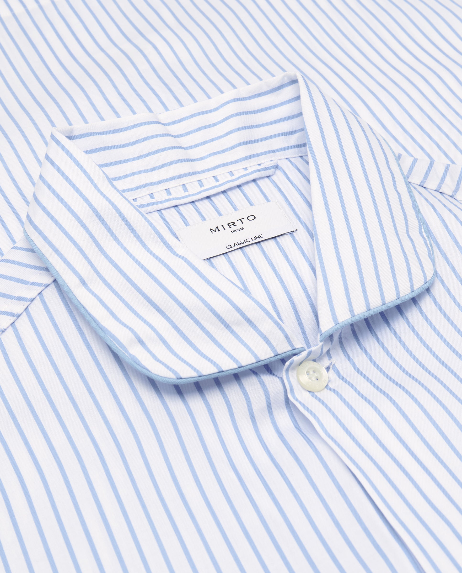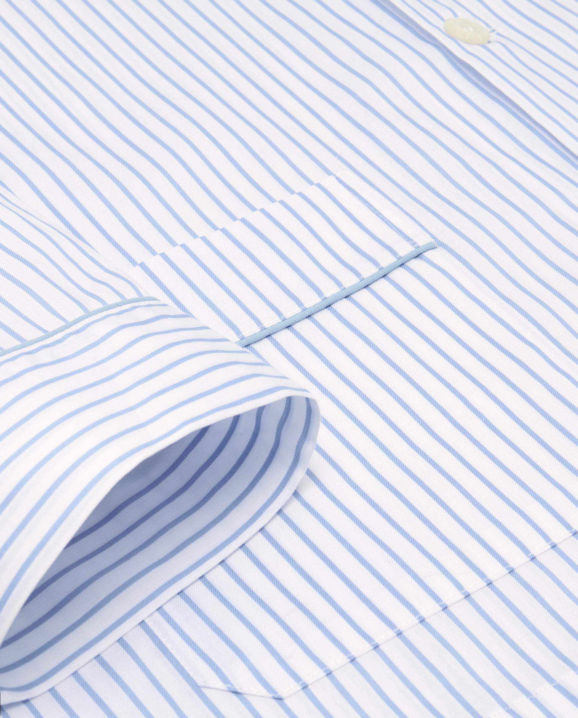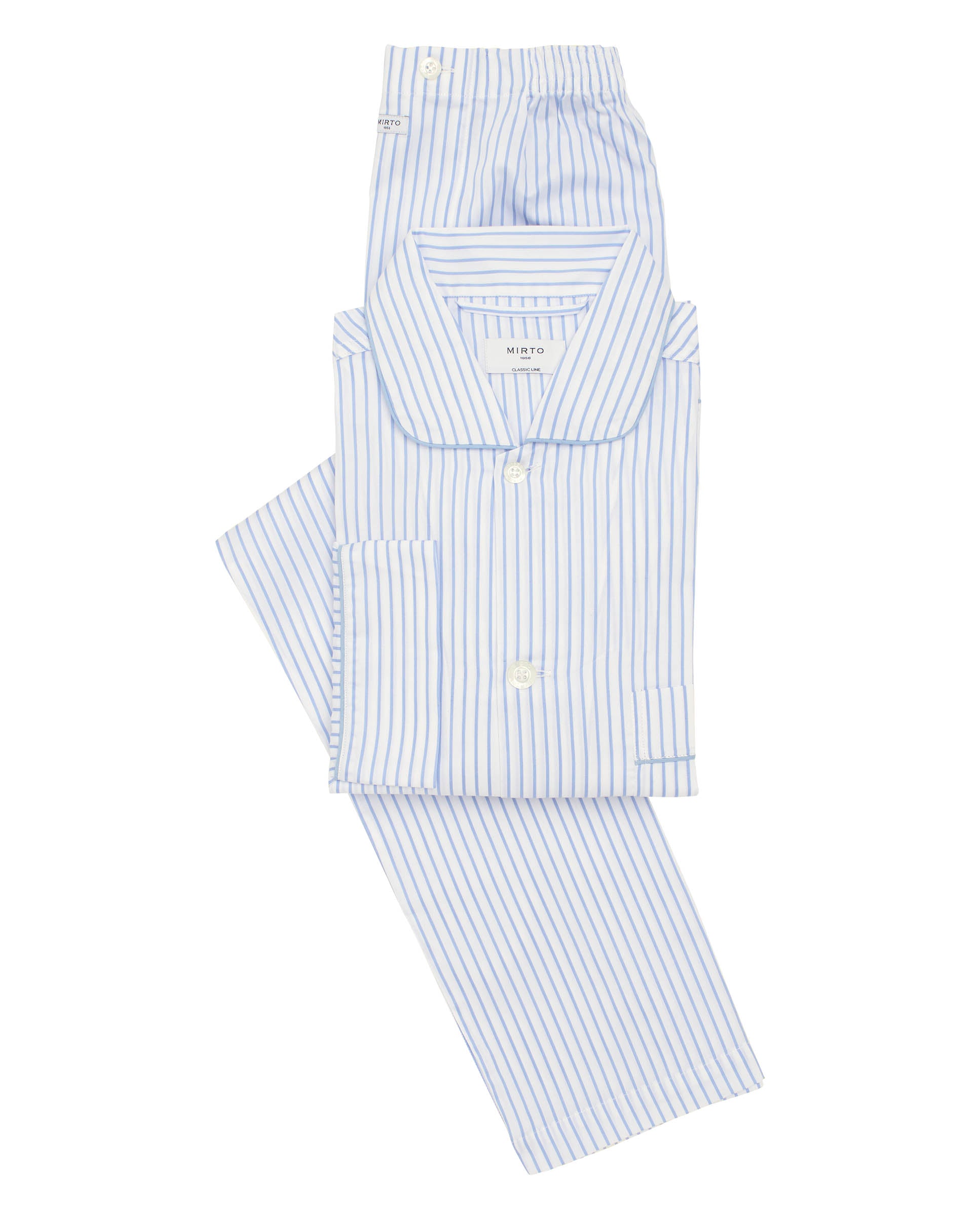 Pijama largo de rayas 100% algodón con estructura twill. Chaqueta abierta con botones, cuello camisero, manga larga, tres bolsillos y vivos al tono. Pantalón largo a juego de corte recto con cintura elástica y cierre con botones.