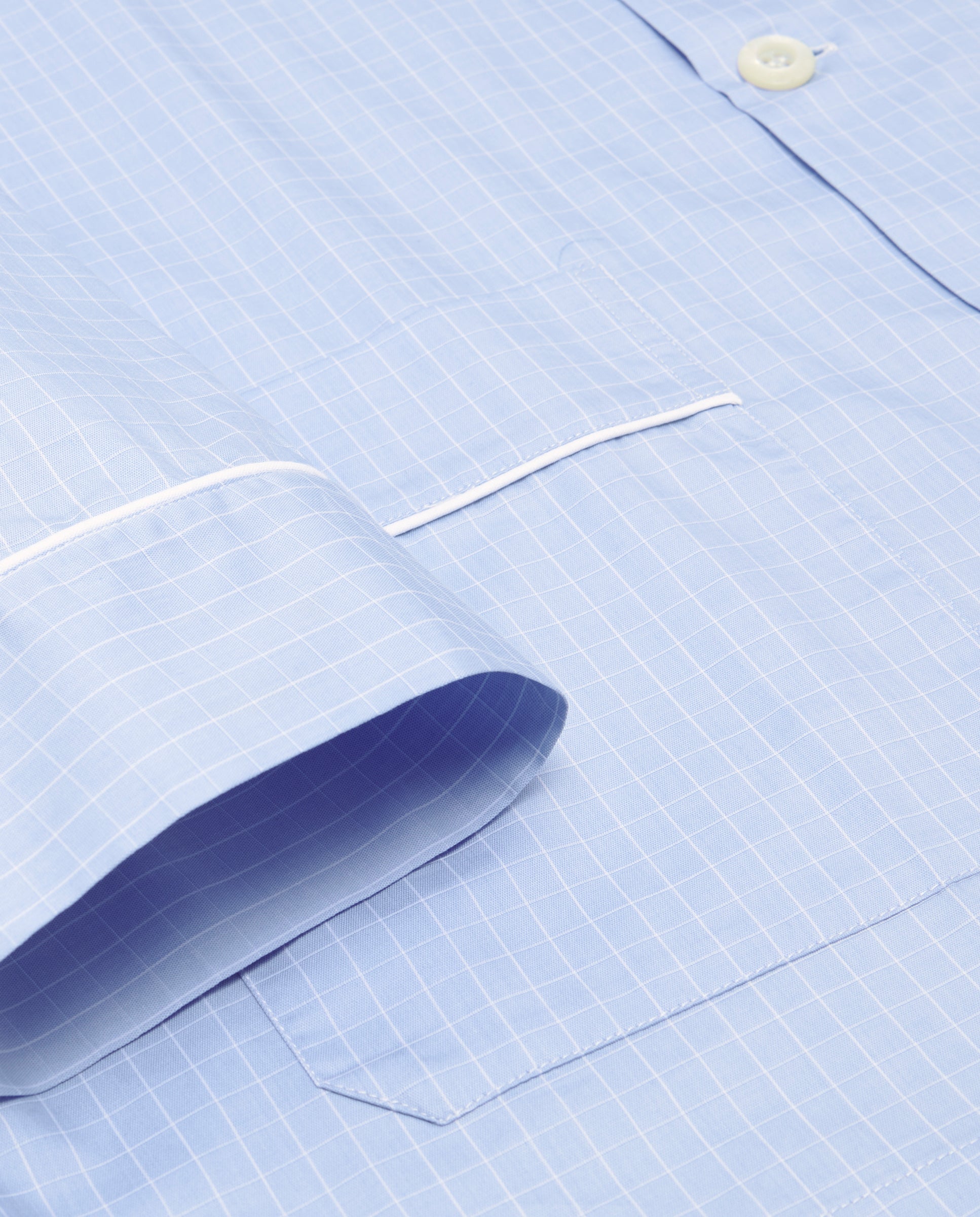 Pijama largo de cuadros 100% algodón con estructura fil a fil. Chaqueta abierta con botones, cuello camisero, manga larga, tres bolsillos y vivos al tono. Pantalón largo a juego de corte recto con cintura elástica y cierre con botones.