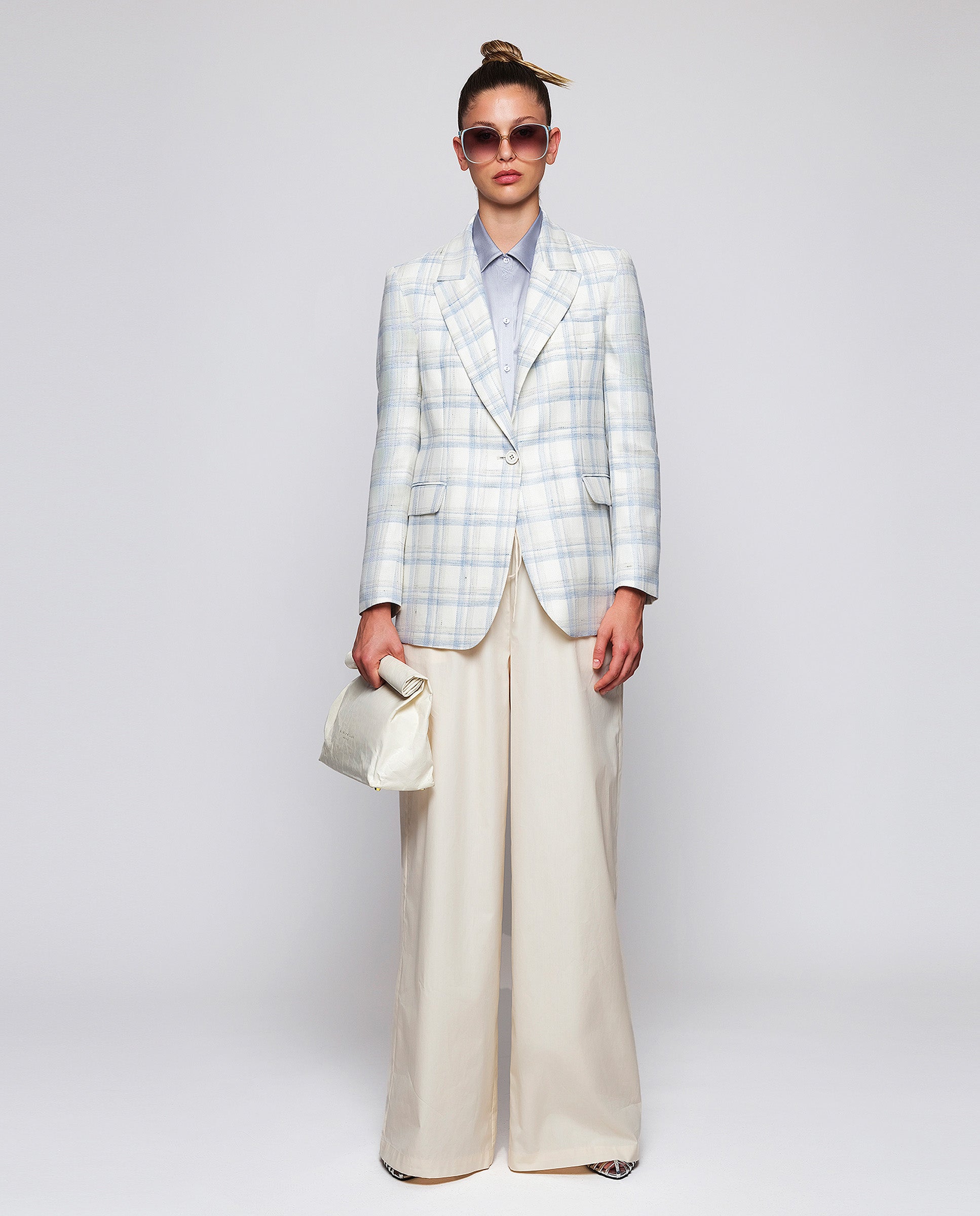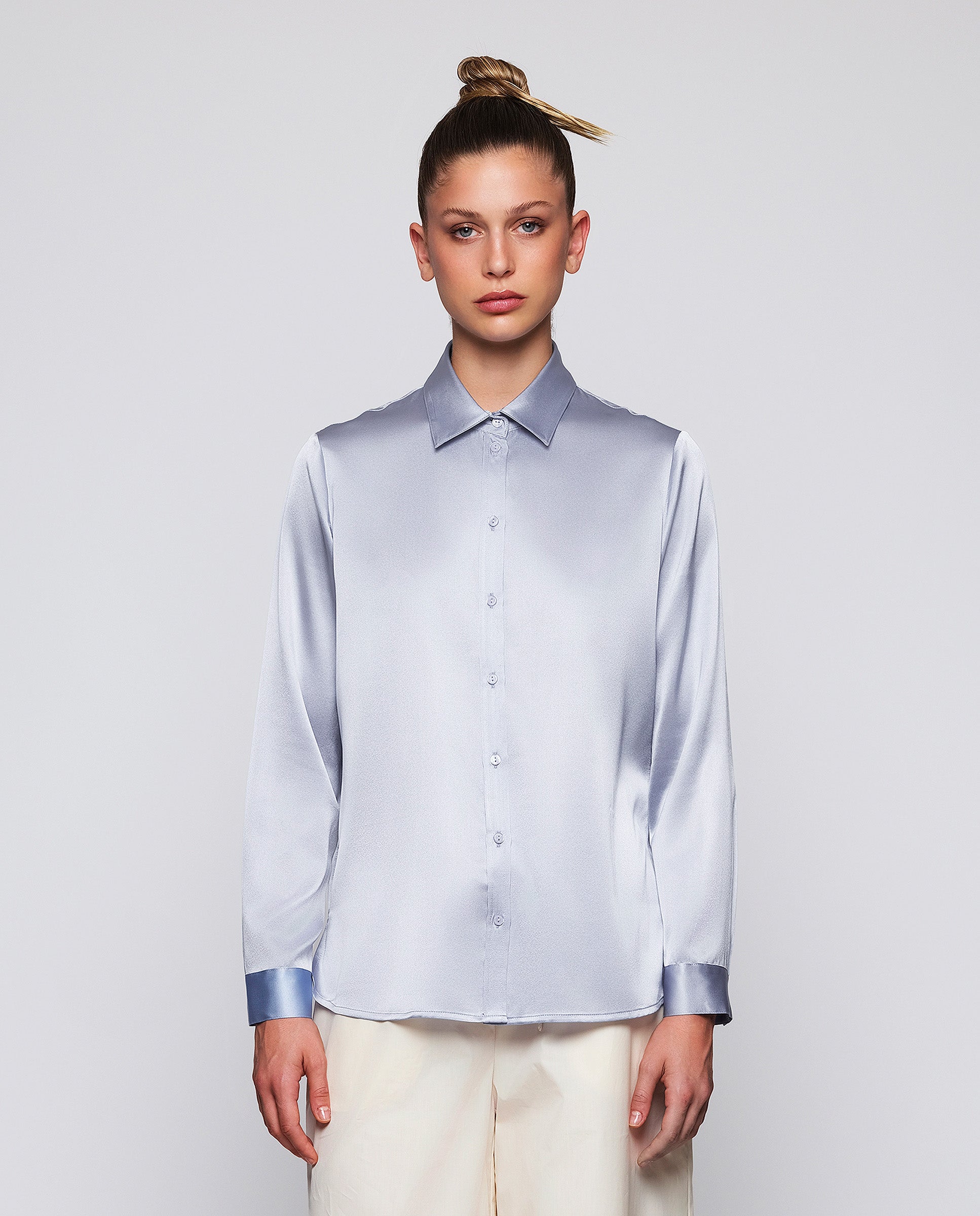 Blusa azul lavanda de seda elástica. Cuello camisero, cierre central con botones, manga larga con puño. Fit recto.
