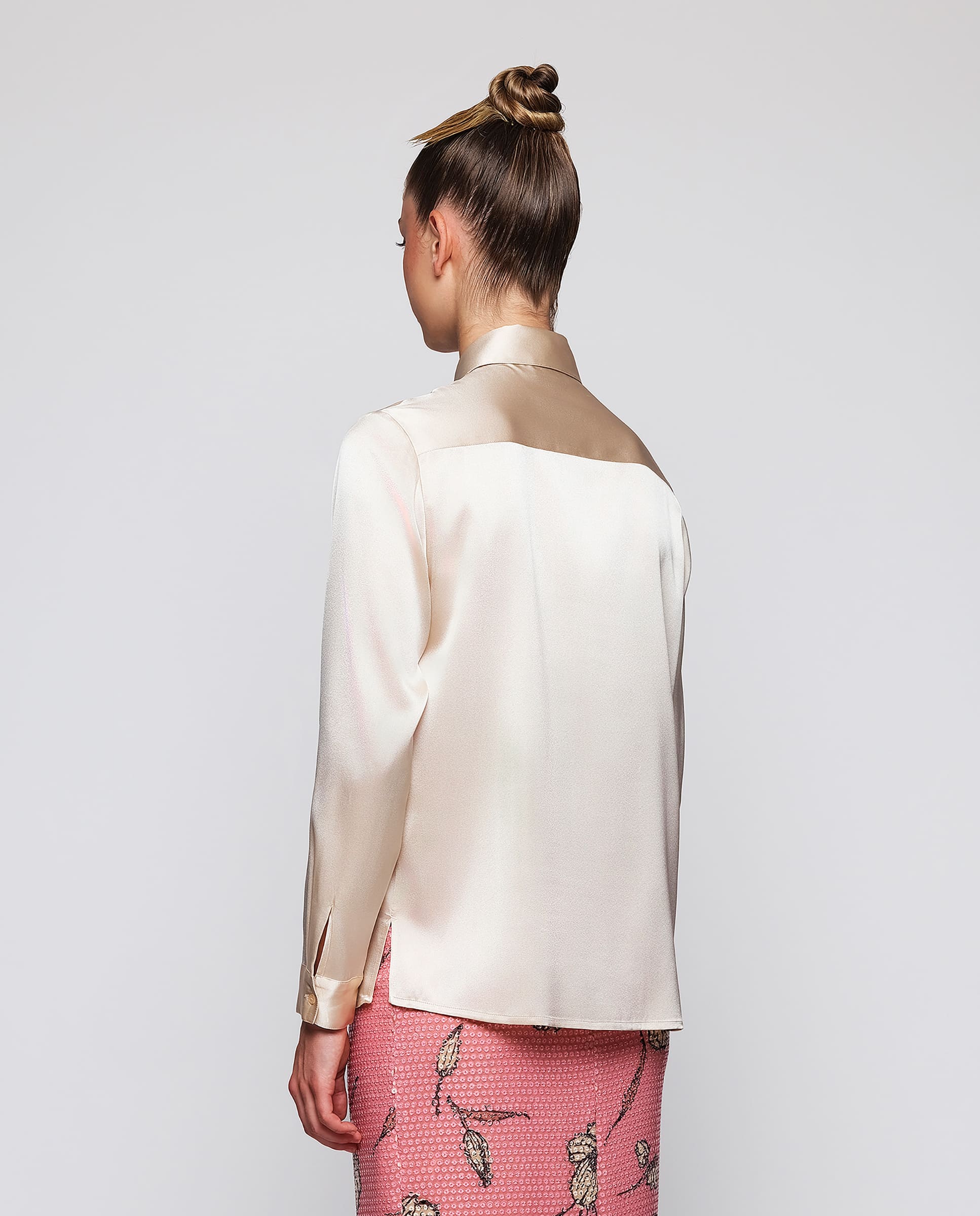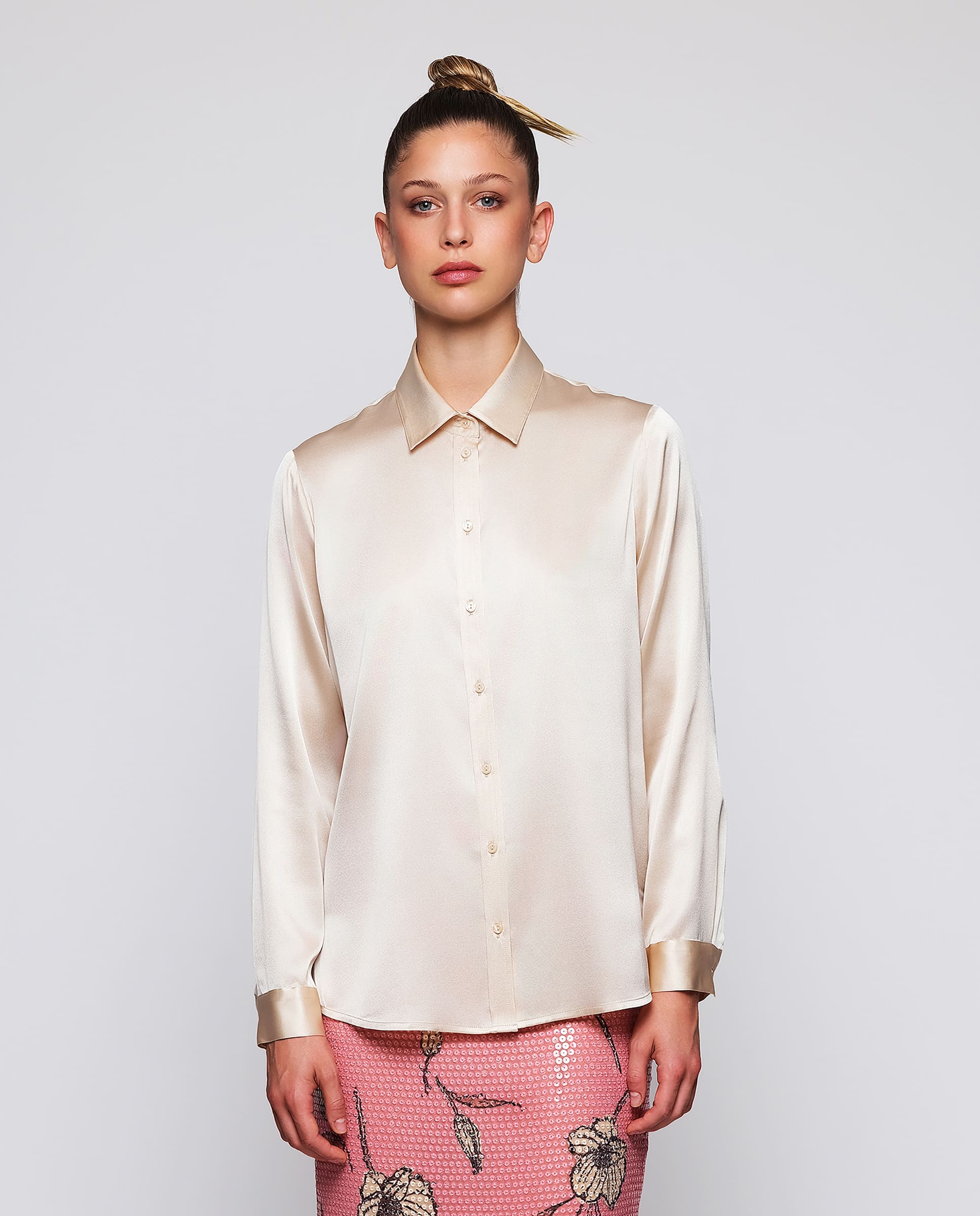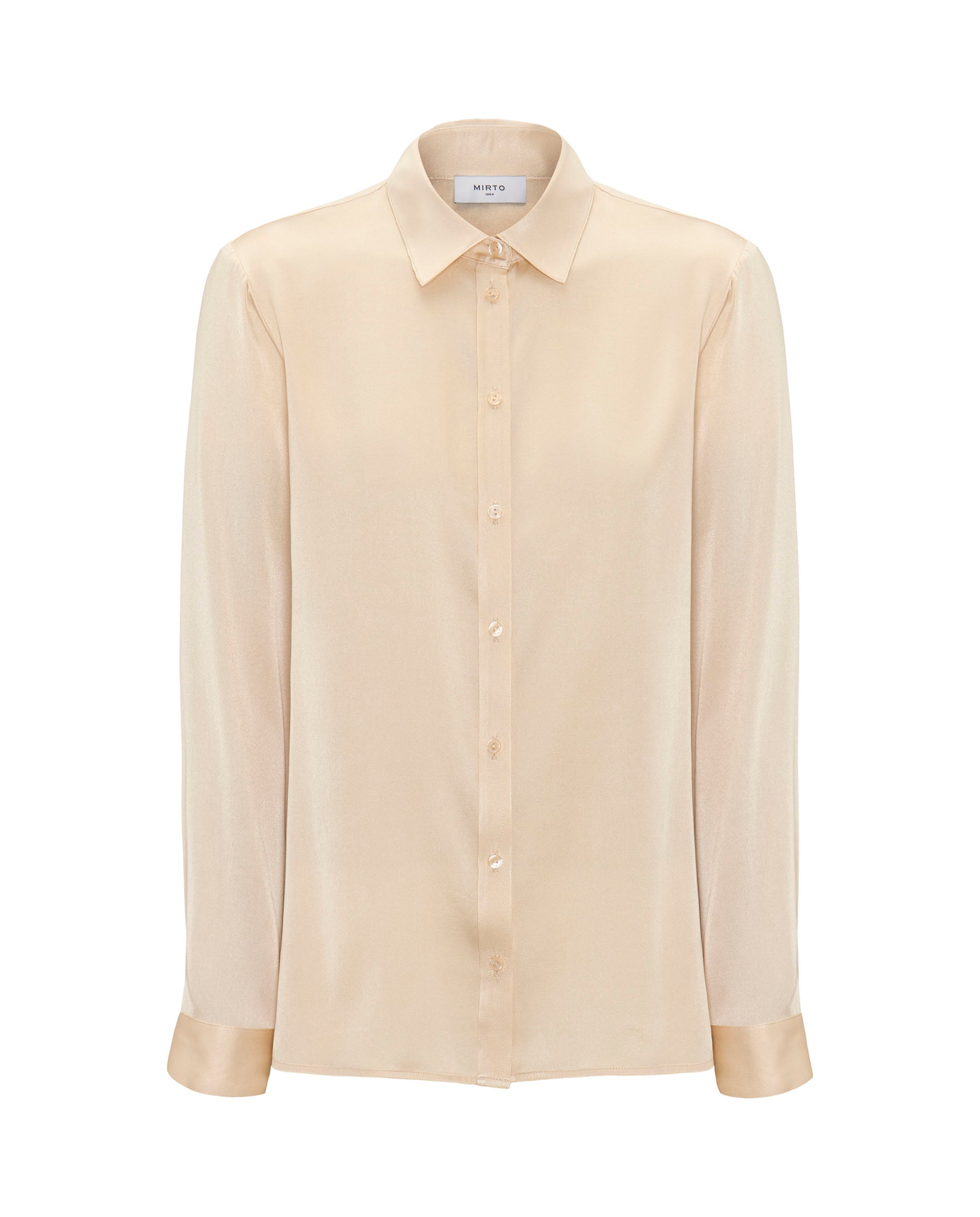 Blusa beige de seda elástica. Cuello camisero, cierre central con botones, manga larga con puño. Fit recto.