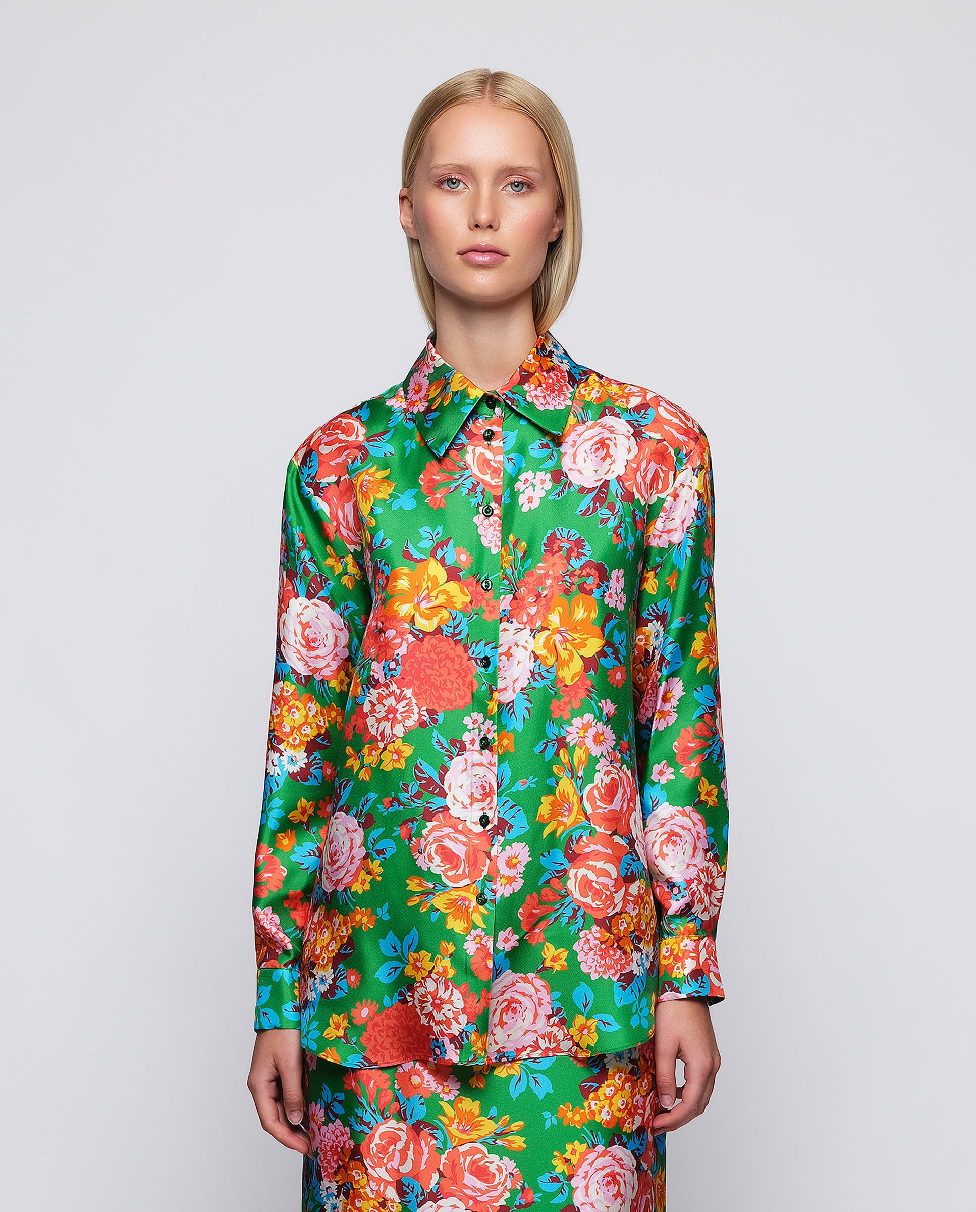 Blusa verde estampado floral liberty en twillde seda 100%. Cuello camisero, cierre centralcon botones, manga larga con puño. Fit recto.o.