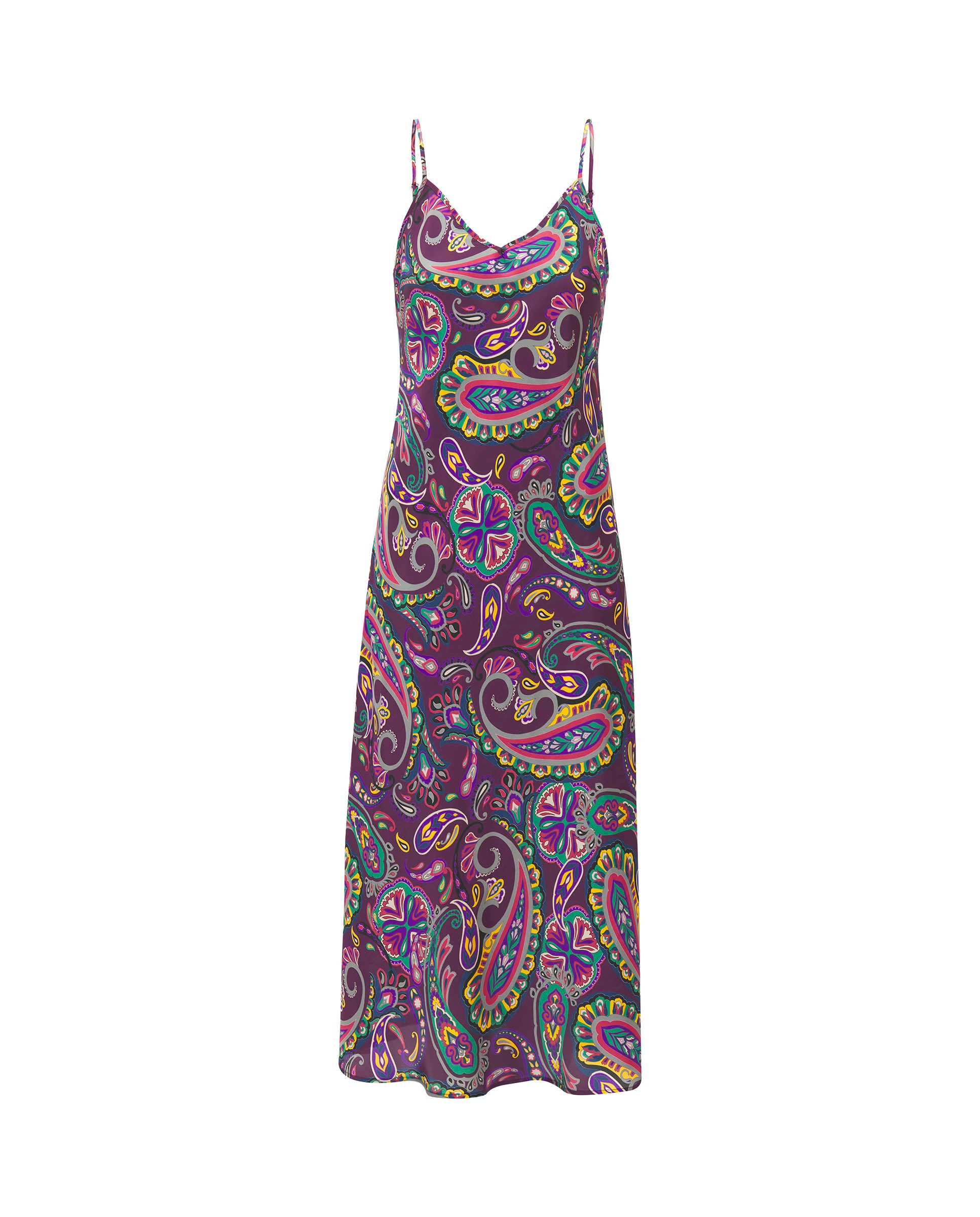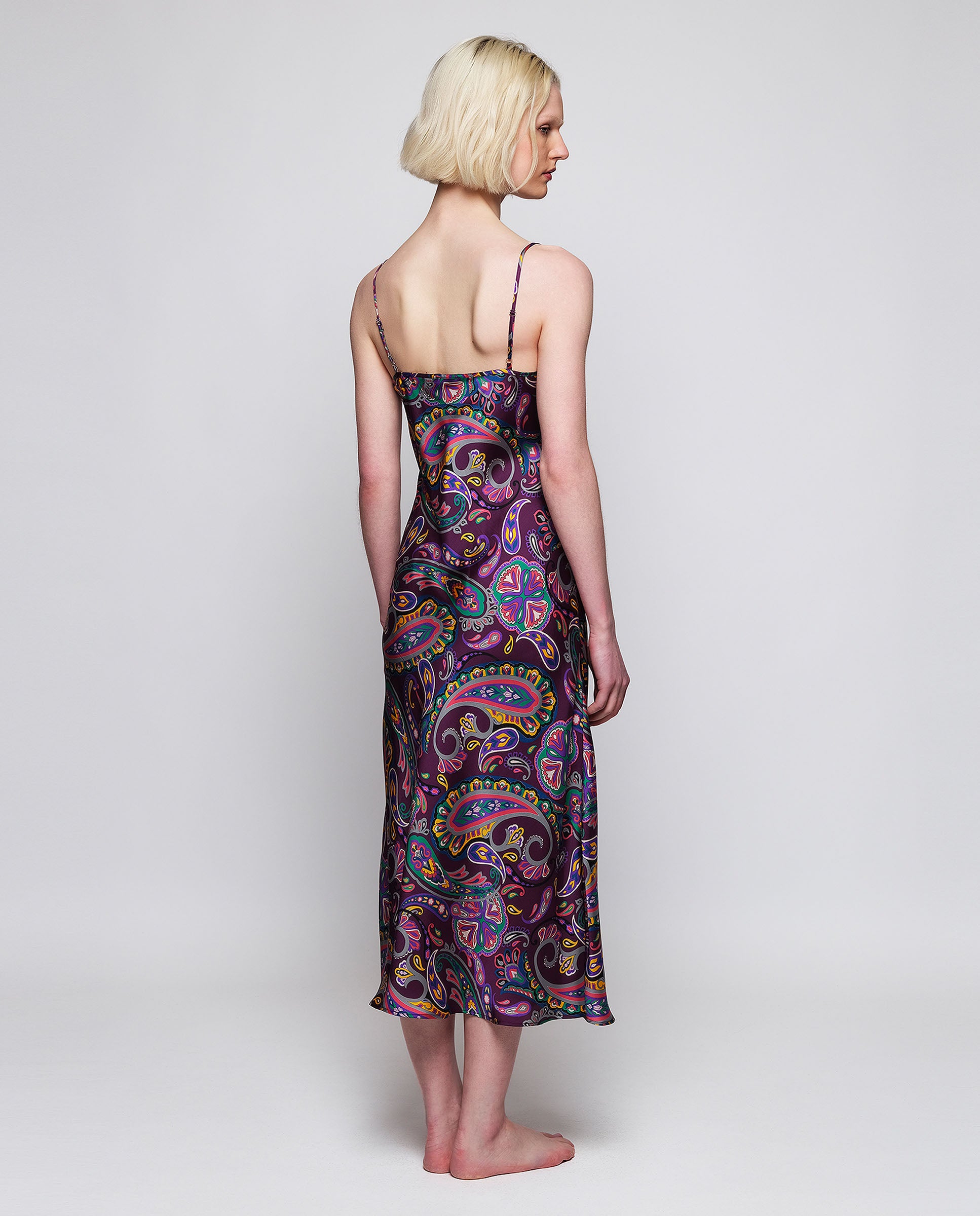 Vestido slip dress estampado paisley cortado al biés. Escote pico y tirantes finos regulables. Largo midi. Una prenda icónica para lucir tu estilo con glamour en casa o en la alfombra roja de tu vida. Chic versatil, elegancia atemporal.