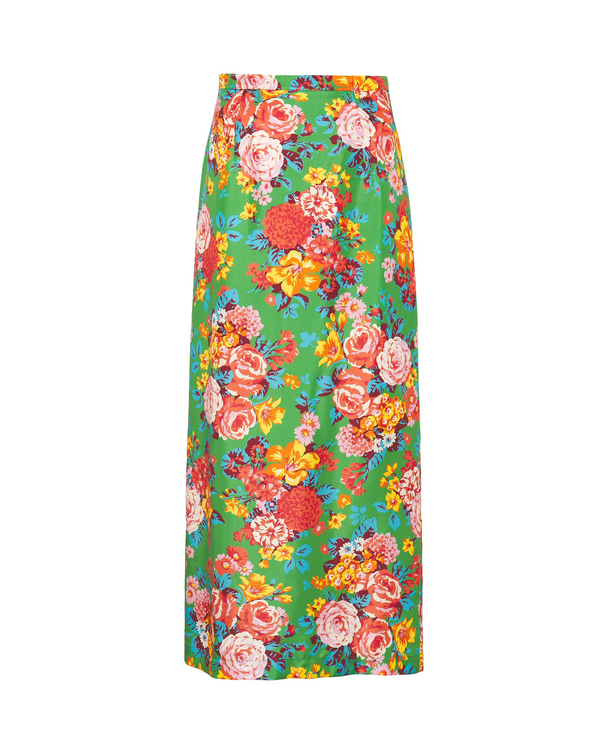 Falda larga estampado floral verde de Libertyen twill de seda 100%. Tiro alto, cinturilla,cierre de cremallera invisible en parte trasera. Abertura central en parte trasera. Fit recto. o.