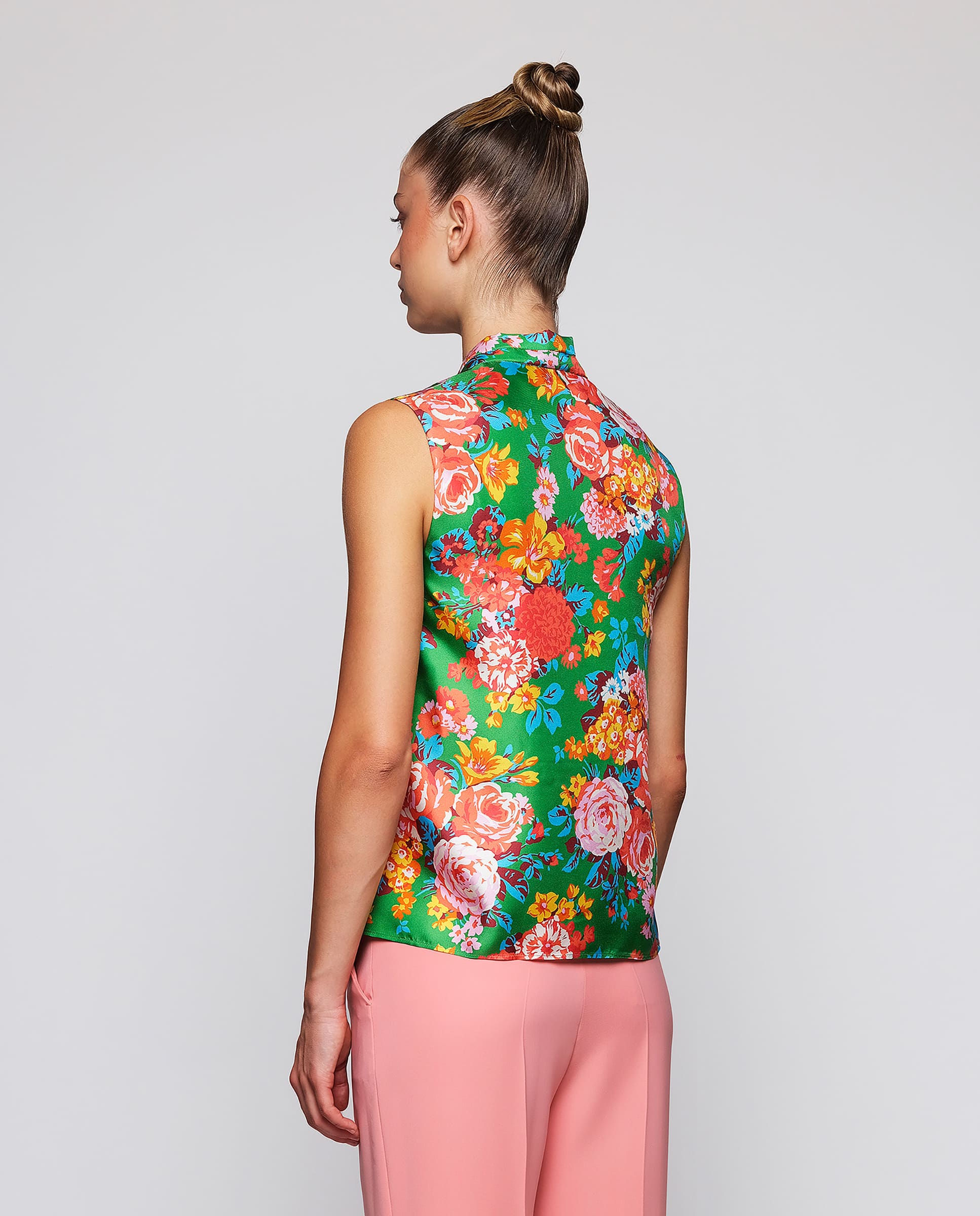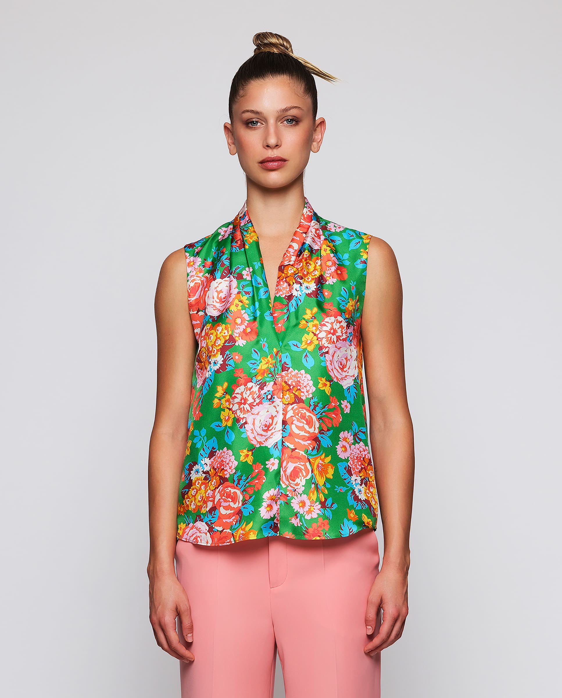 Top fluido estampado floral verde de Liberty en twill de seda 100%. Escote en "V" con detalle de pliegues.
