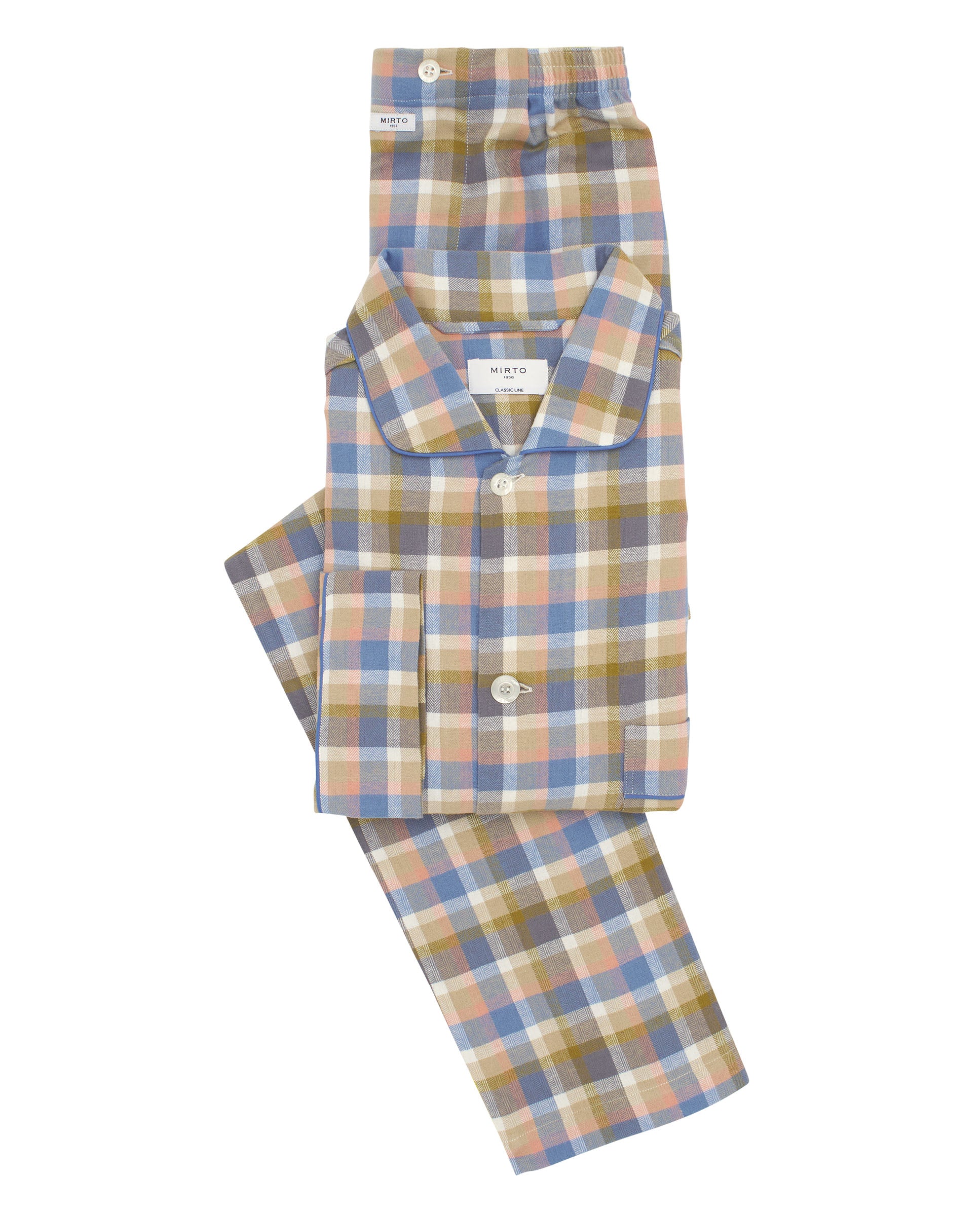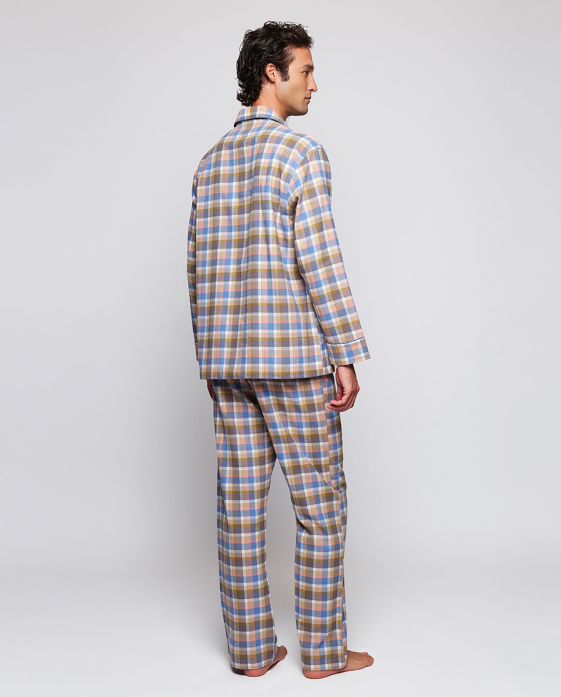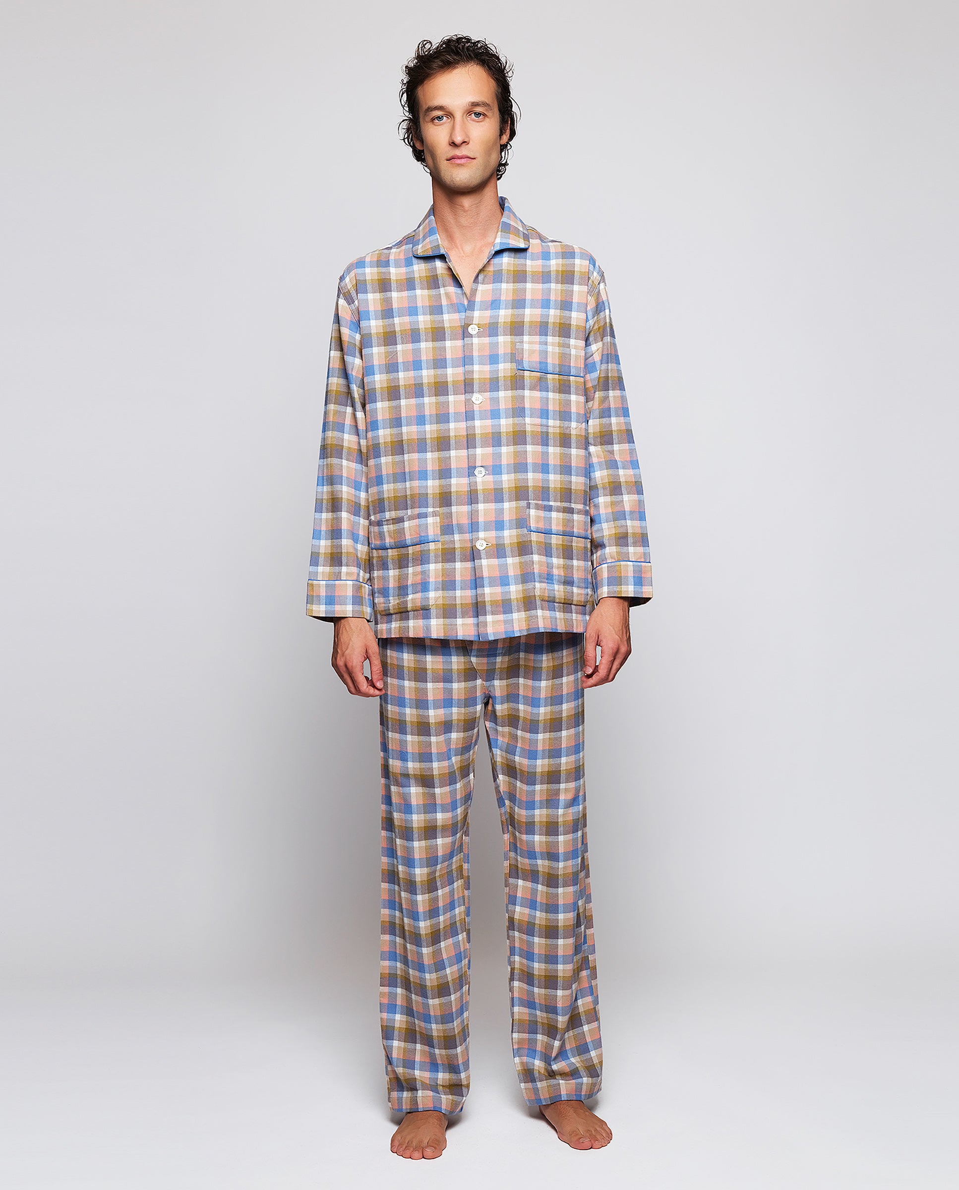 Pijama largo de cuadros 100% algodón franela con estructura en espiga. Chaqueta abierta con botones, cuello camisero, manga larga, tres bolsillos y vivos azules. Pantalón largo a juego de corte recto con cintura elástica y cierre con botones.