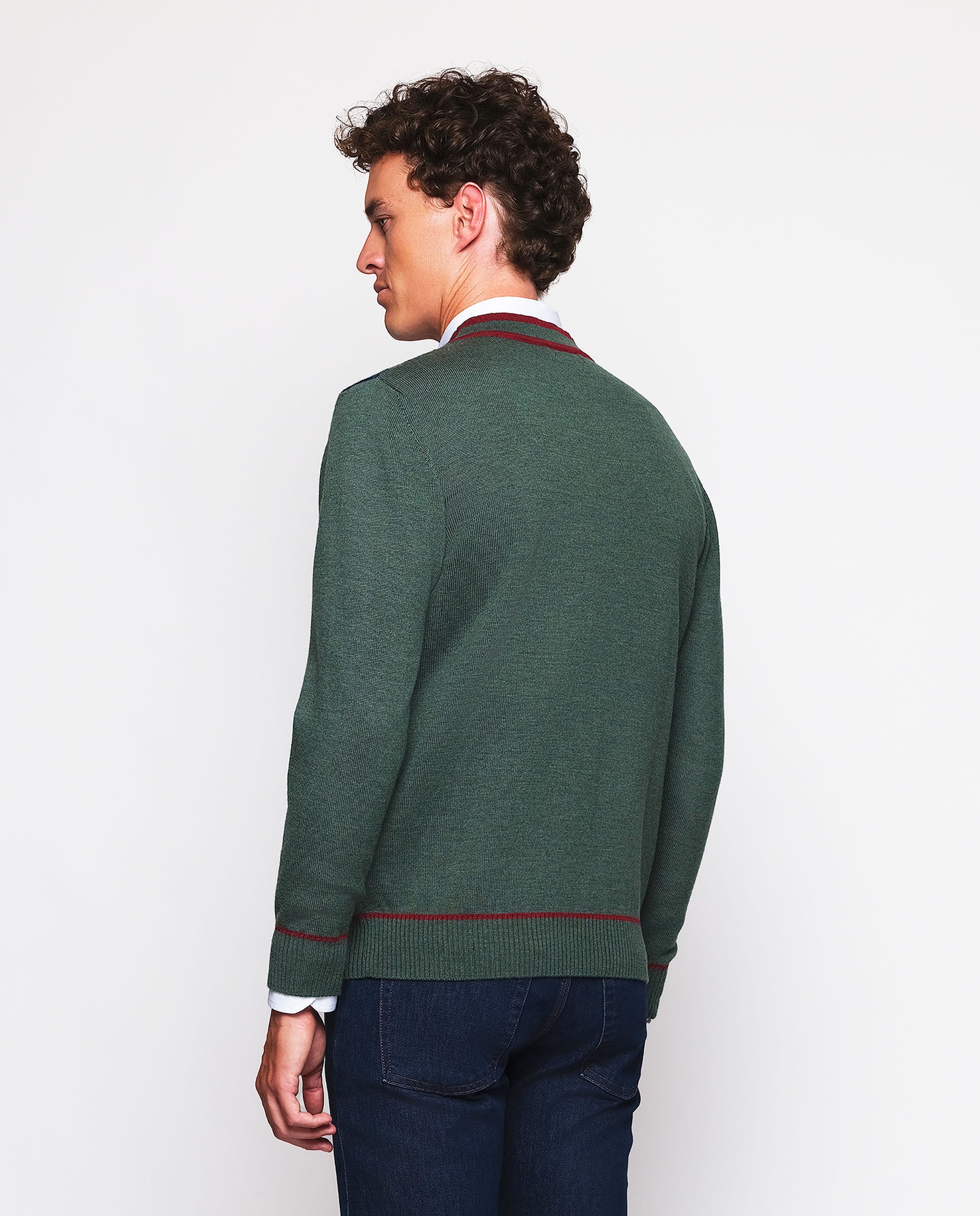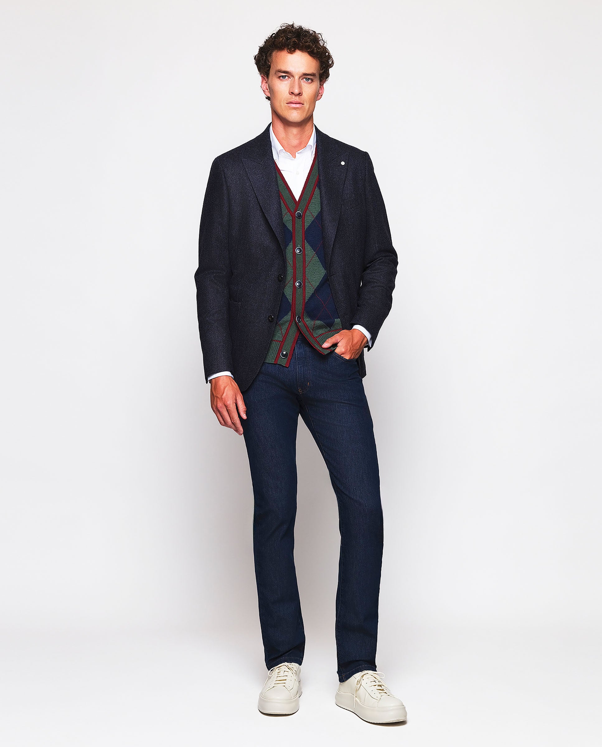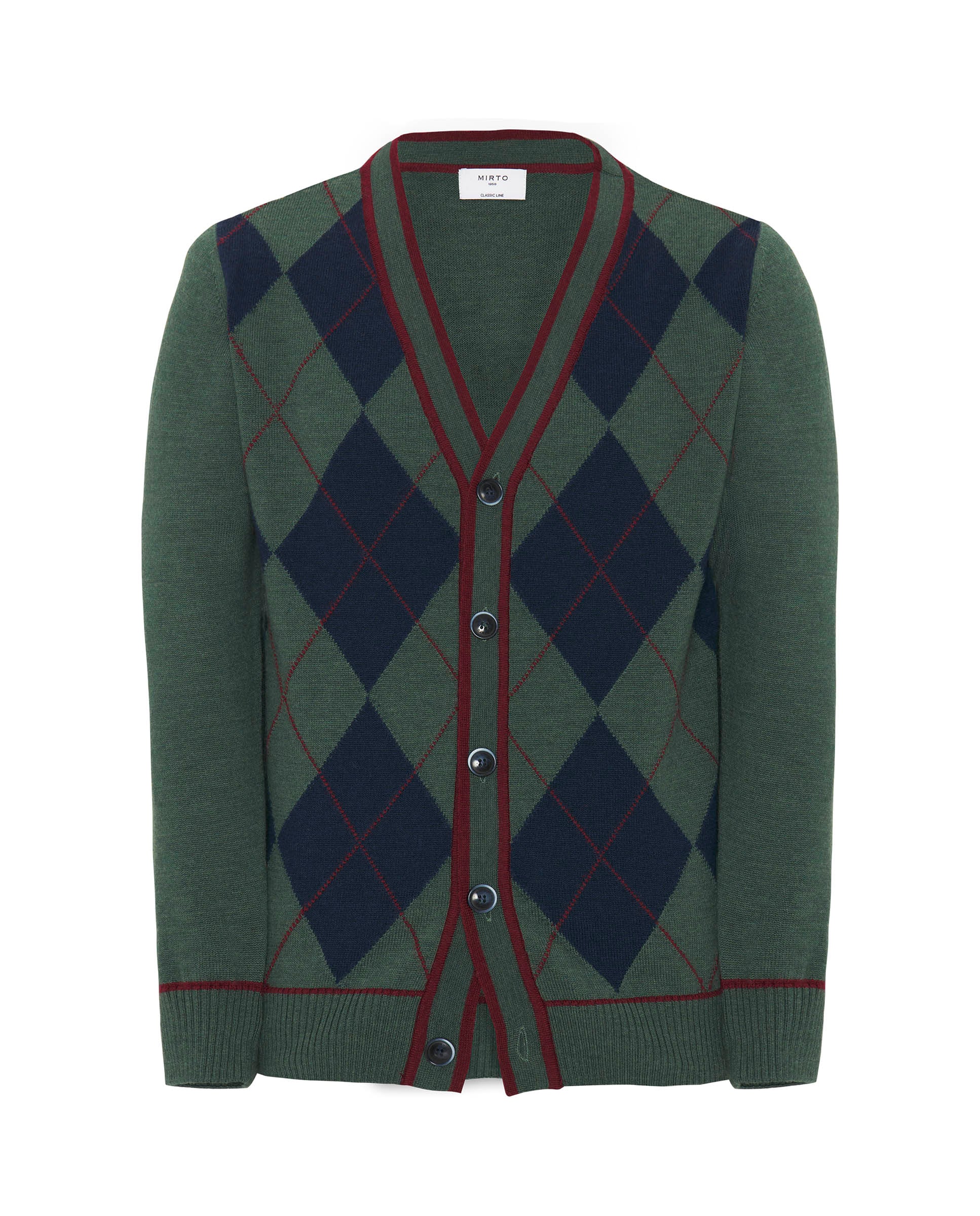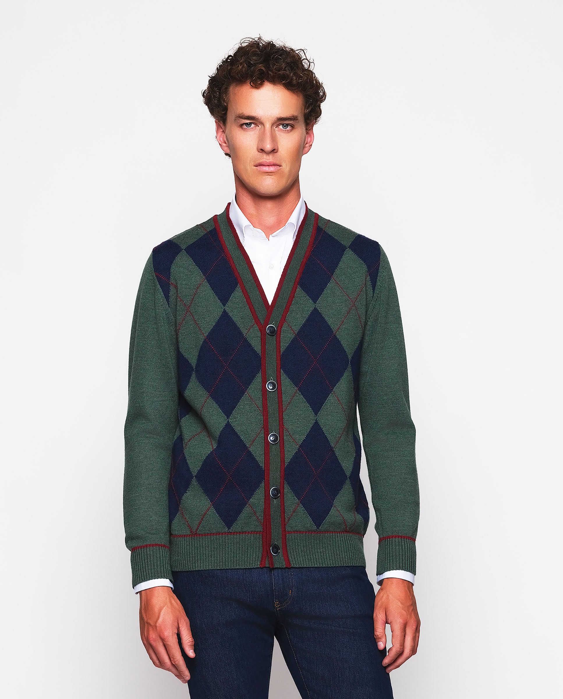 Cárdigan de punto 100% lana con delantero de rombos. Cierre con botones. Cuello, tira de botones, puños y bajo acabados en canalé con vivos granates en contraste. Una prenda destacada que combina el diseño clásico del punto con colores refinados.