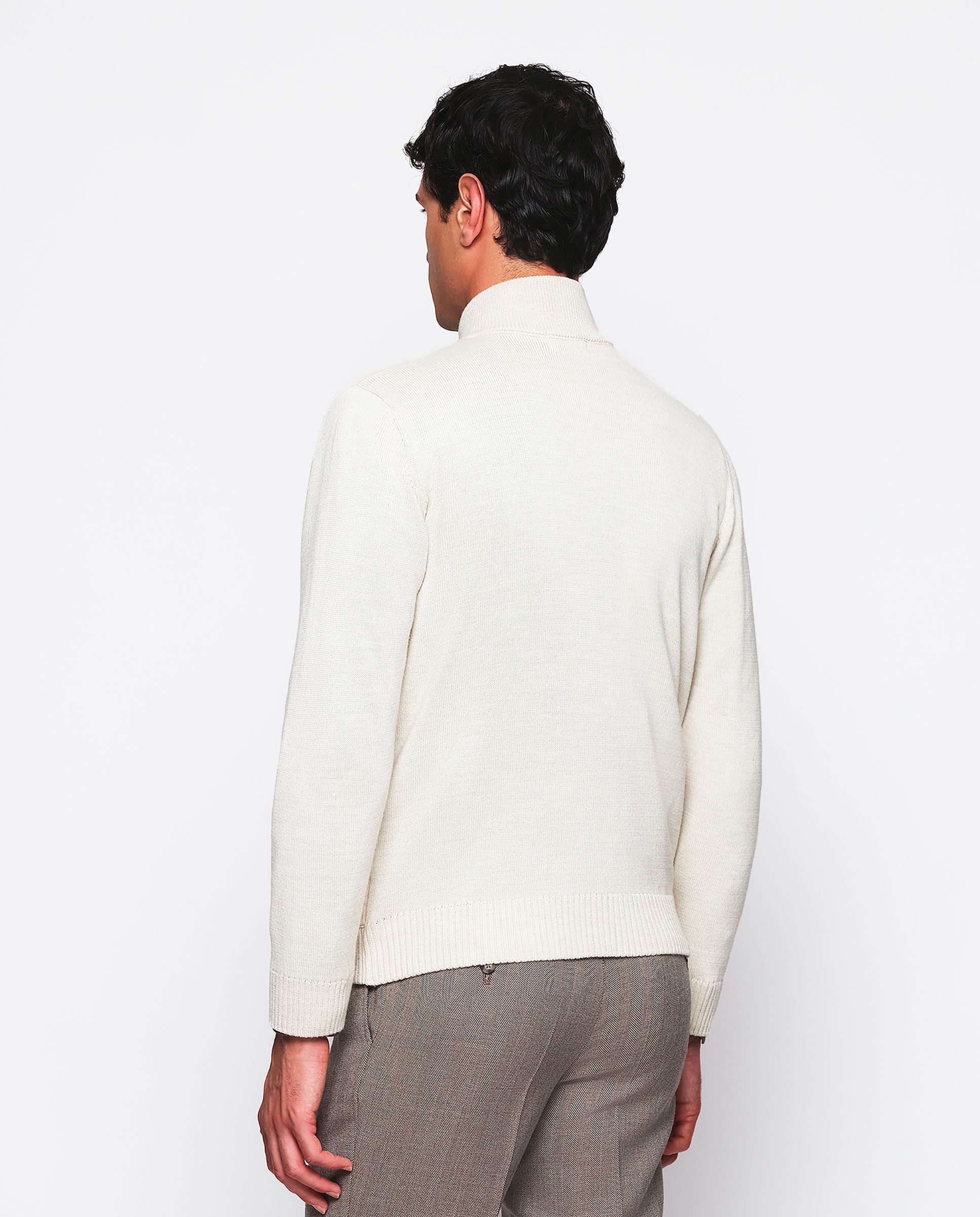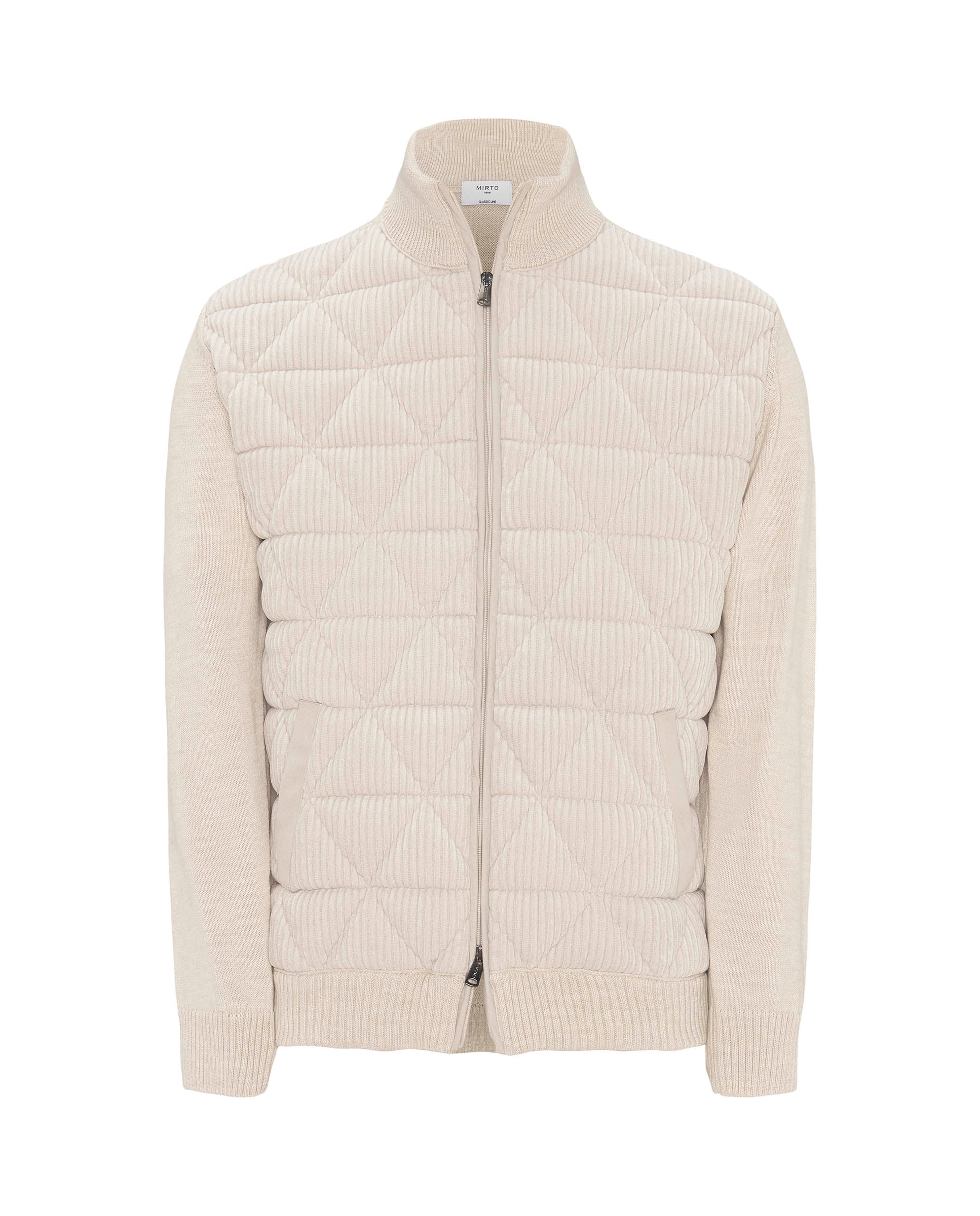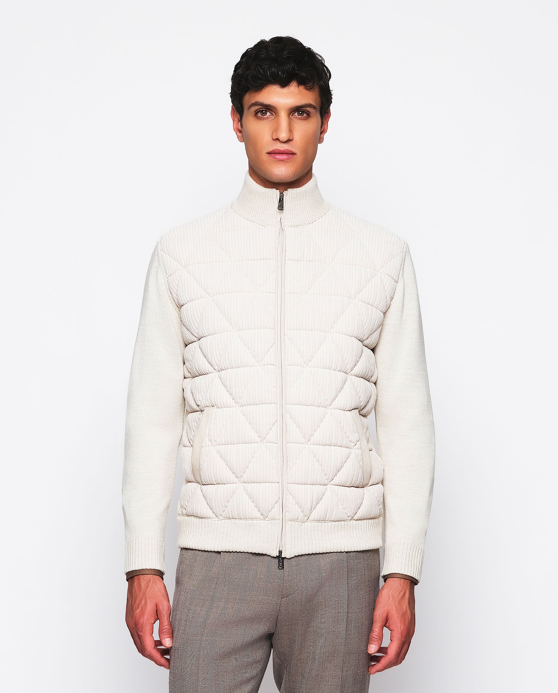 Chaqueta de punto mezcla de lana y acrílico. Delantero acolchado de pana con motivos geométricos, dos bolsillos, cierre con cremallera de doble carro. Cuello, puños y bajo en canalé. Funcional, contemporánea, cálida tendencia.