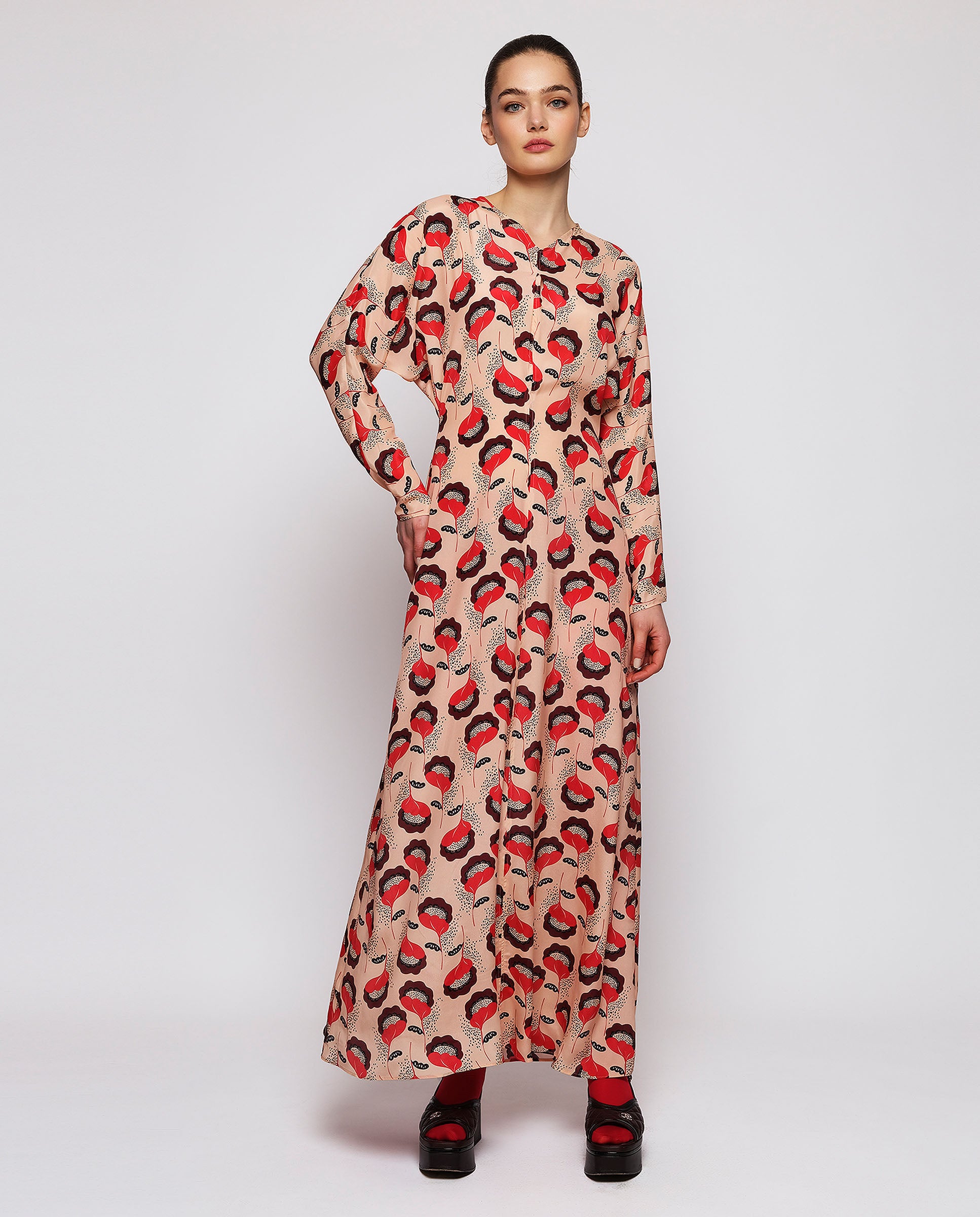 Vestido midi rojo y rosa estampado floral. Cuello pico. Cremallera invisible detrás, manga larga. Vestido interior lencero. Fit semi-entallado con vuelo. Estampado floral, leve movimiento. Un vestido que suma armonía natural para tus looks destacados.