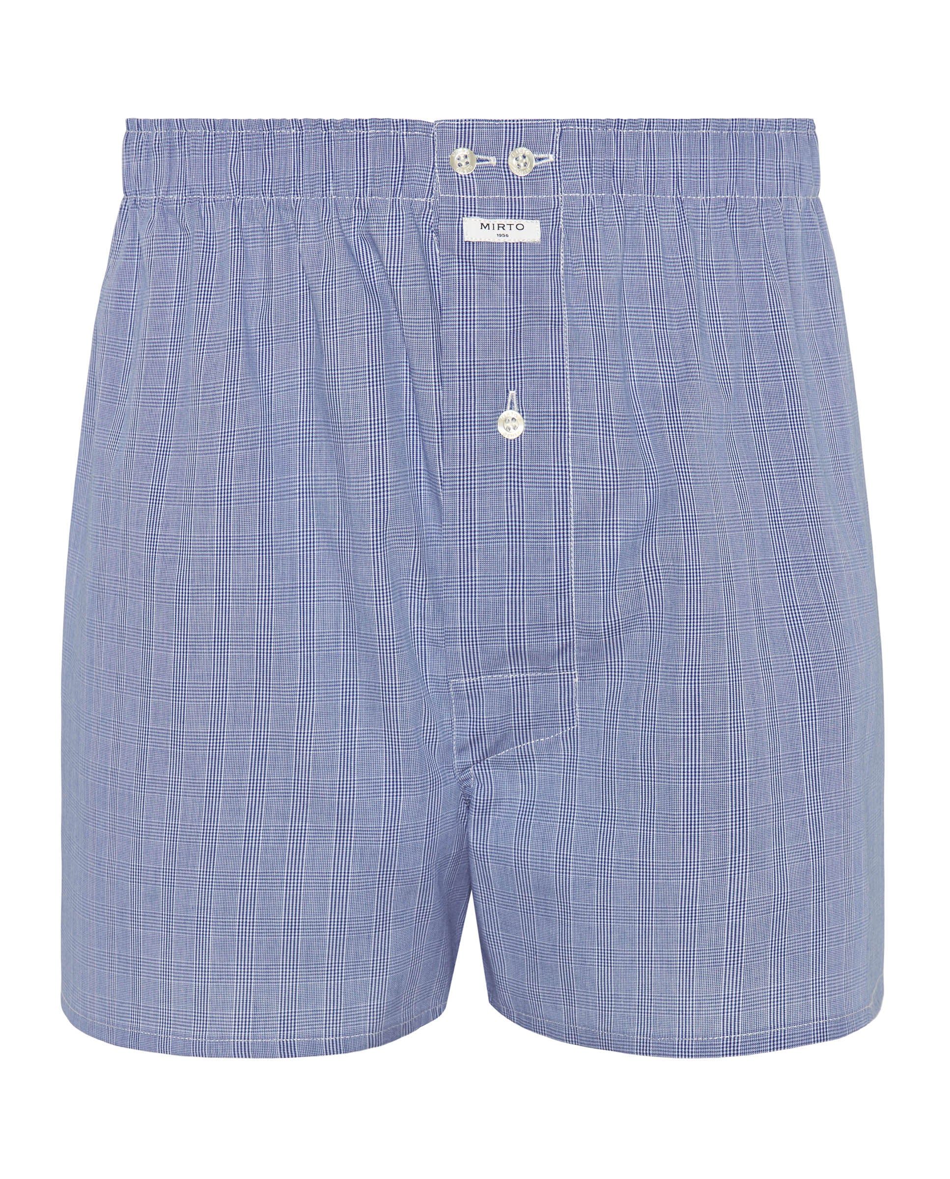100% cotton Glen plaid boxer style underpants, elastic waistband with plush lining, button clousure, american seam with double french stitching at the back.