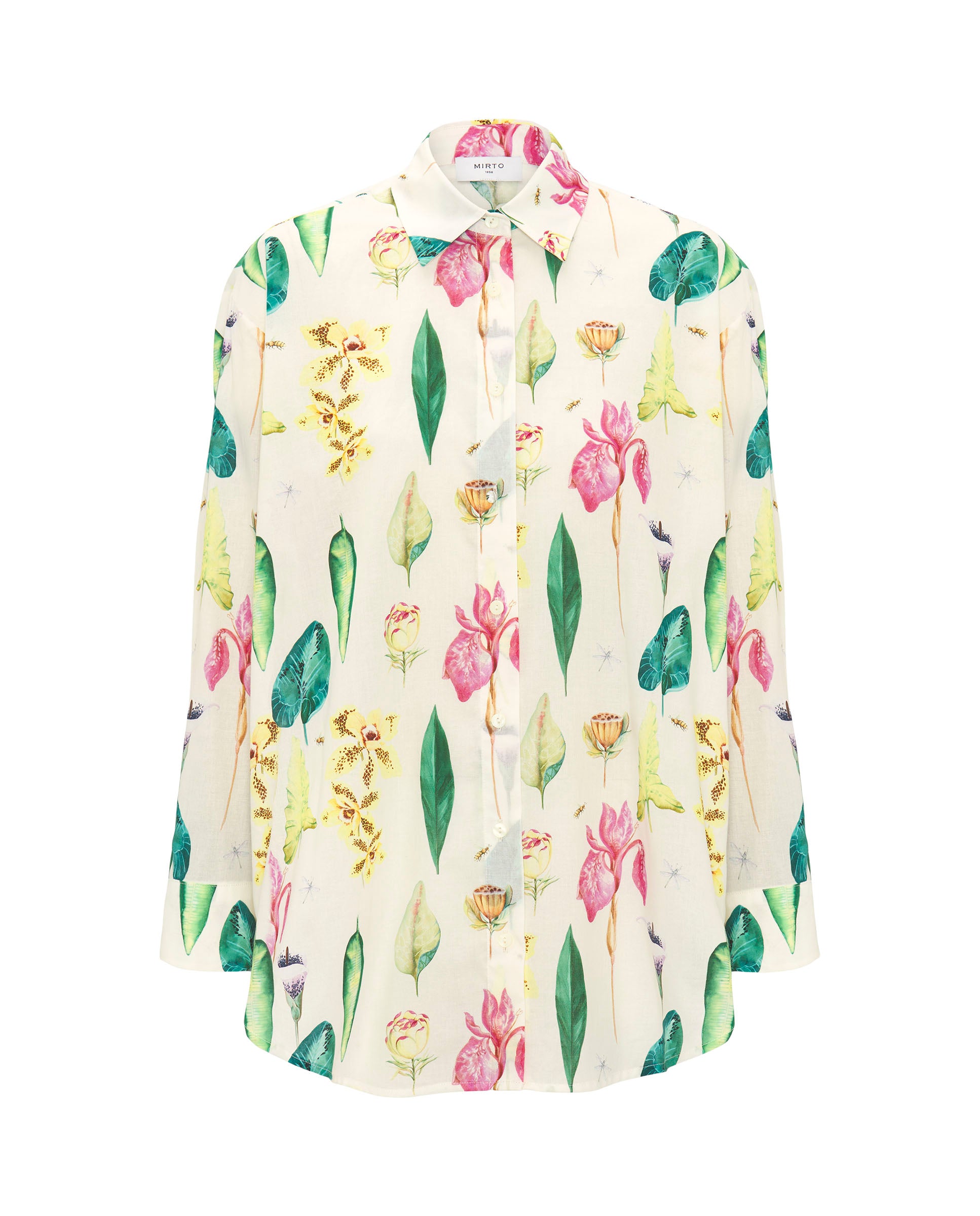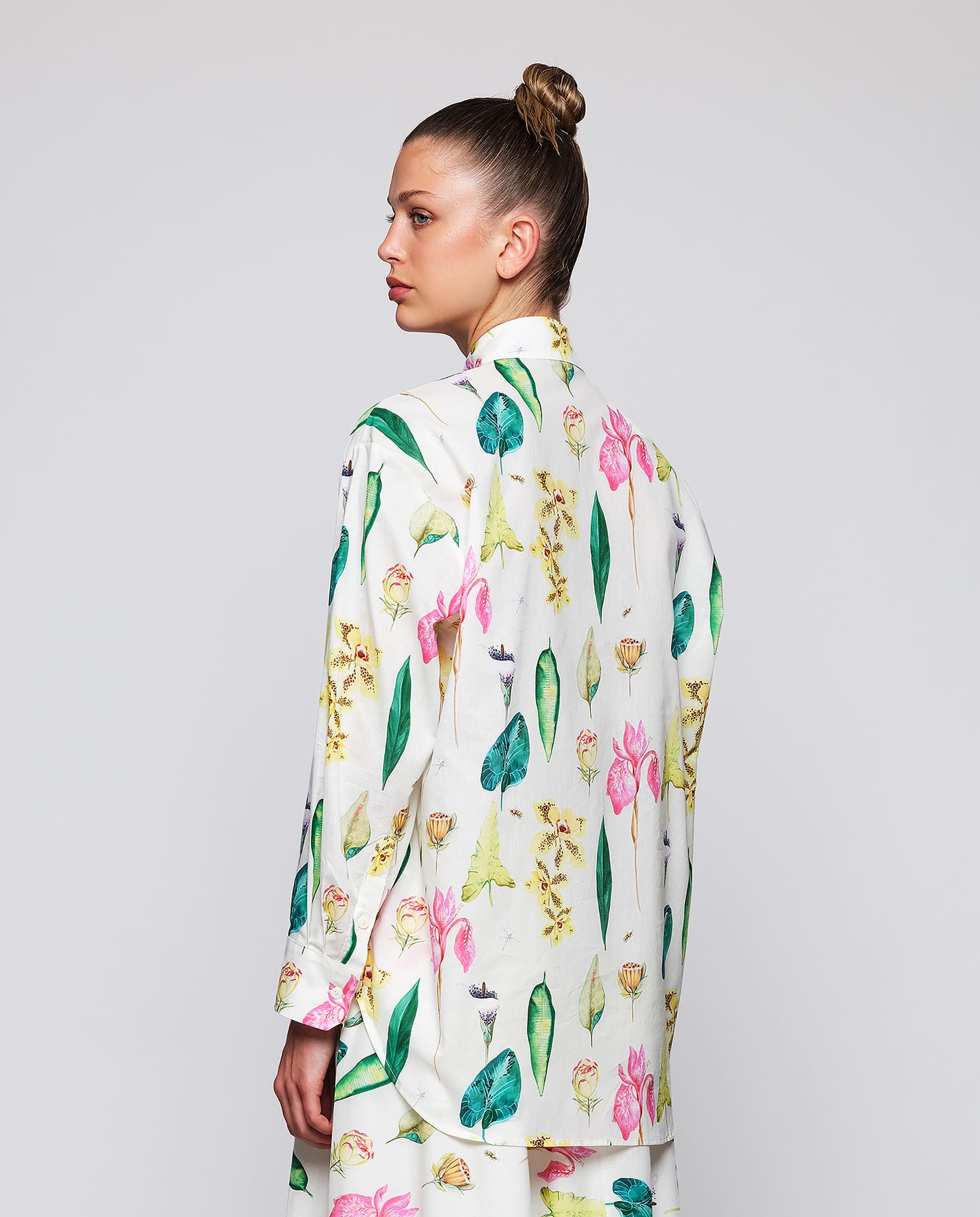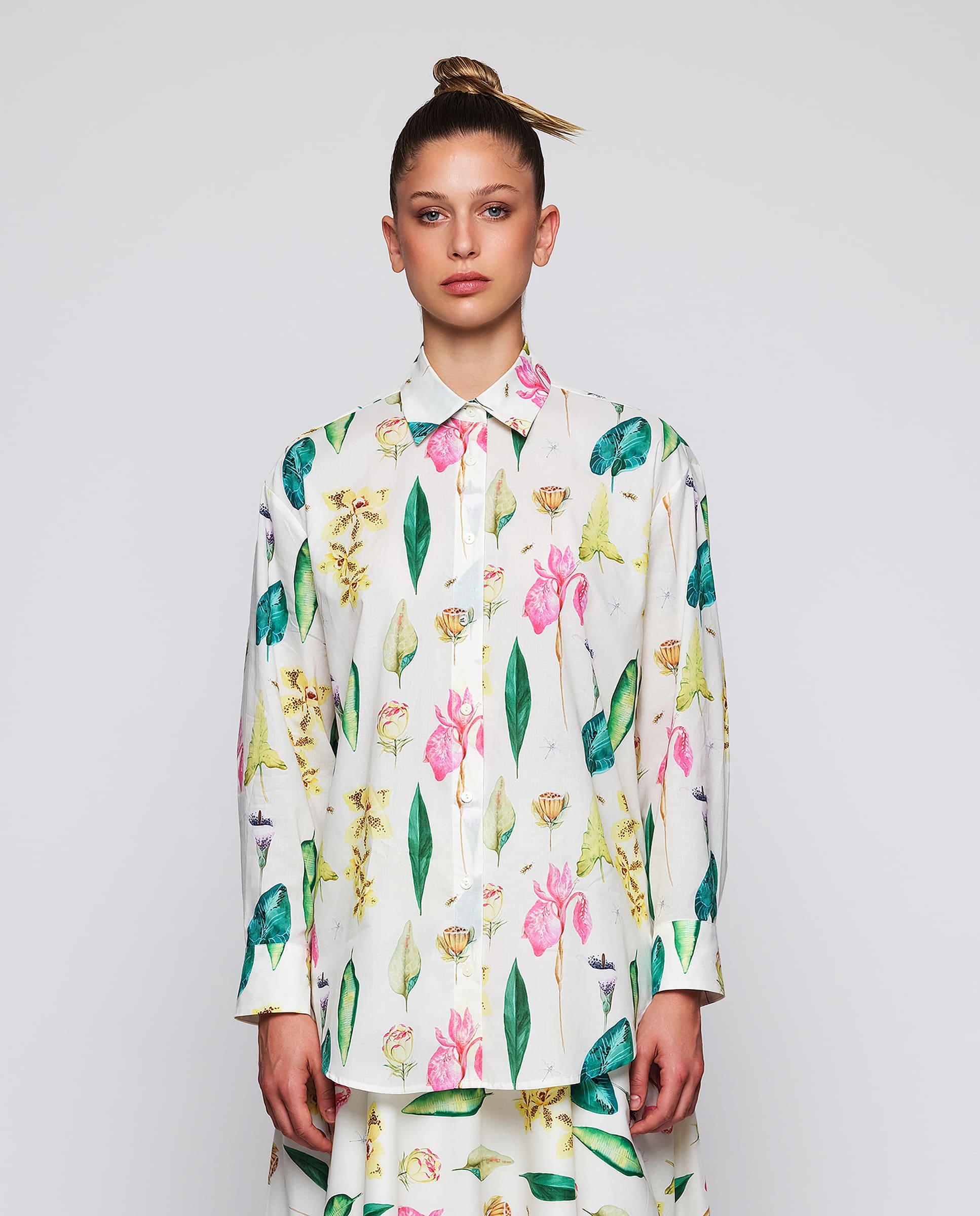100% cotton botanical print white shirt. Collar, central button closure with artisanal buttons with vegetable details. Long sleeves with cuff. Oversize fit.