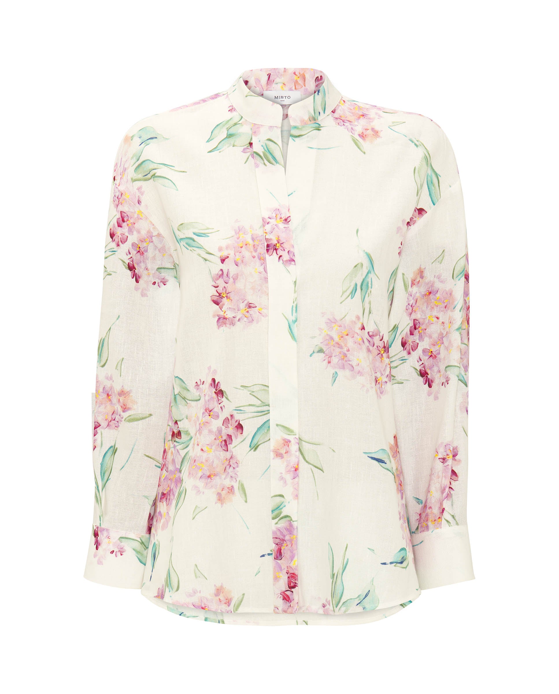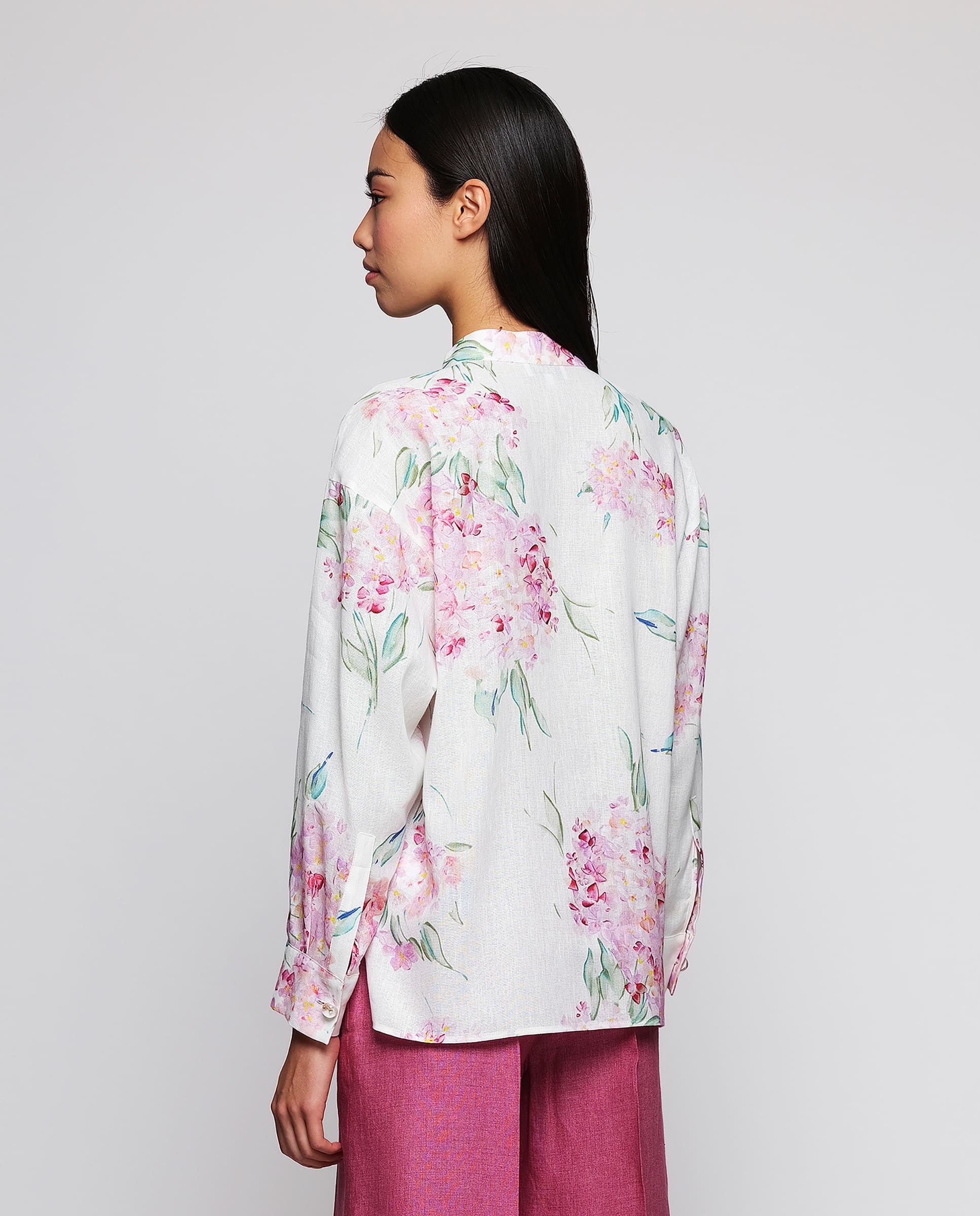 Cotton & linen blend white floral print shirt. Neckband collar, hidden button closure, long sleeves. Artisanal buttons with flower appliqués in cuffs. Straight fit.