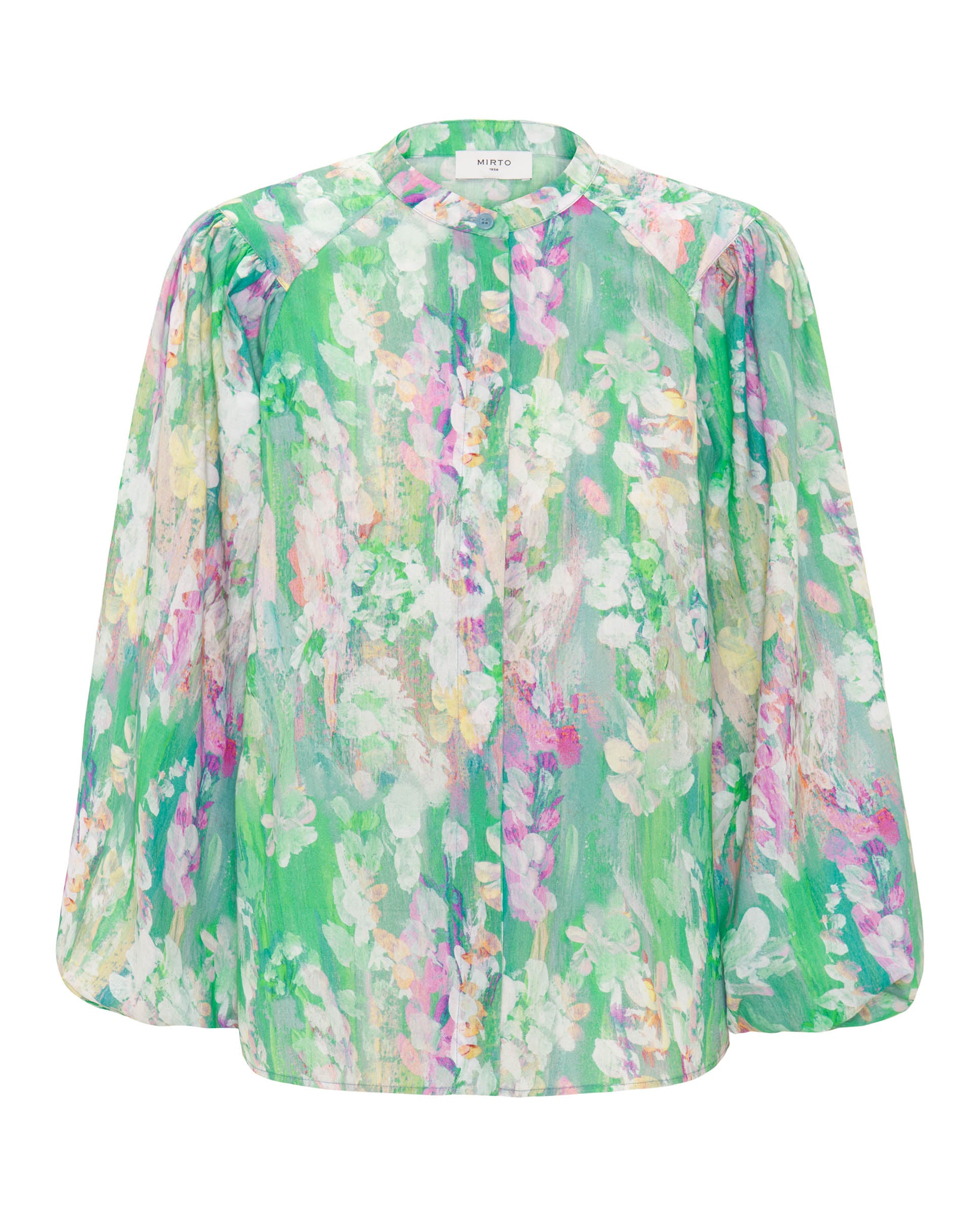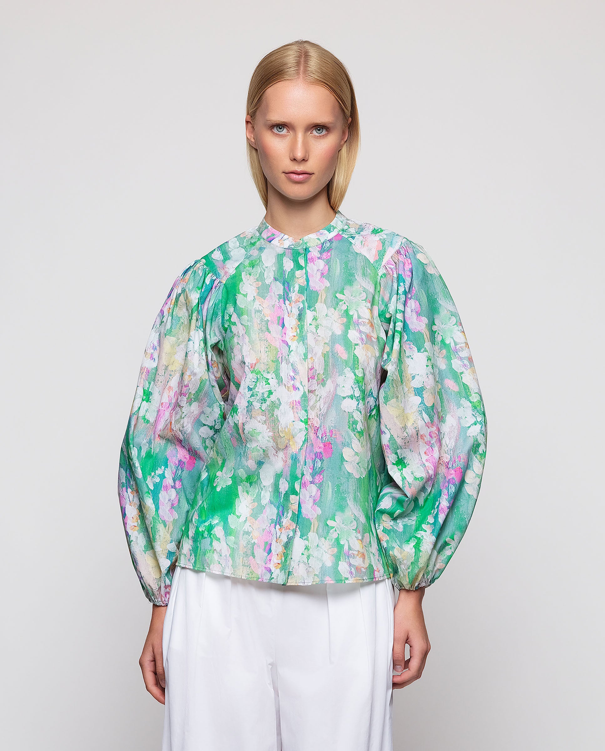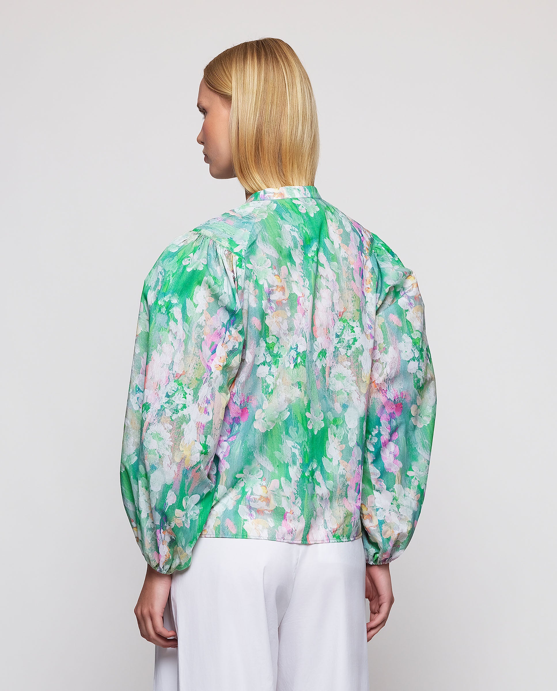 100% cotton green brushstrokes print shirt. Neckband collar, hidden button closure, long puff sleeves gathered with elastic. Straight fit.