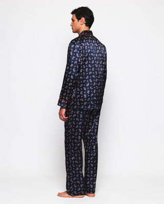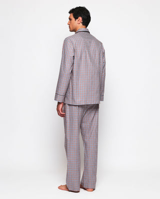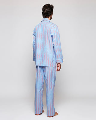 Pijama largo de rayas 100% algodón con estructura. Chaqueta abierta con botones, manga larga, tres bolsillos, cuello camisero y vivos al tono. Pantalón largo a juego de corte recto, cintura elástica y cierre con botones.