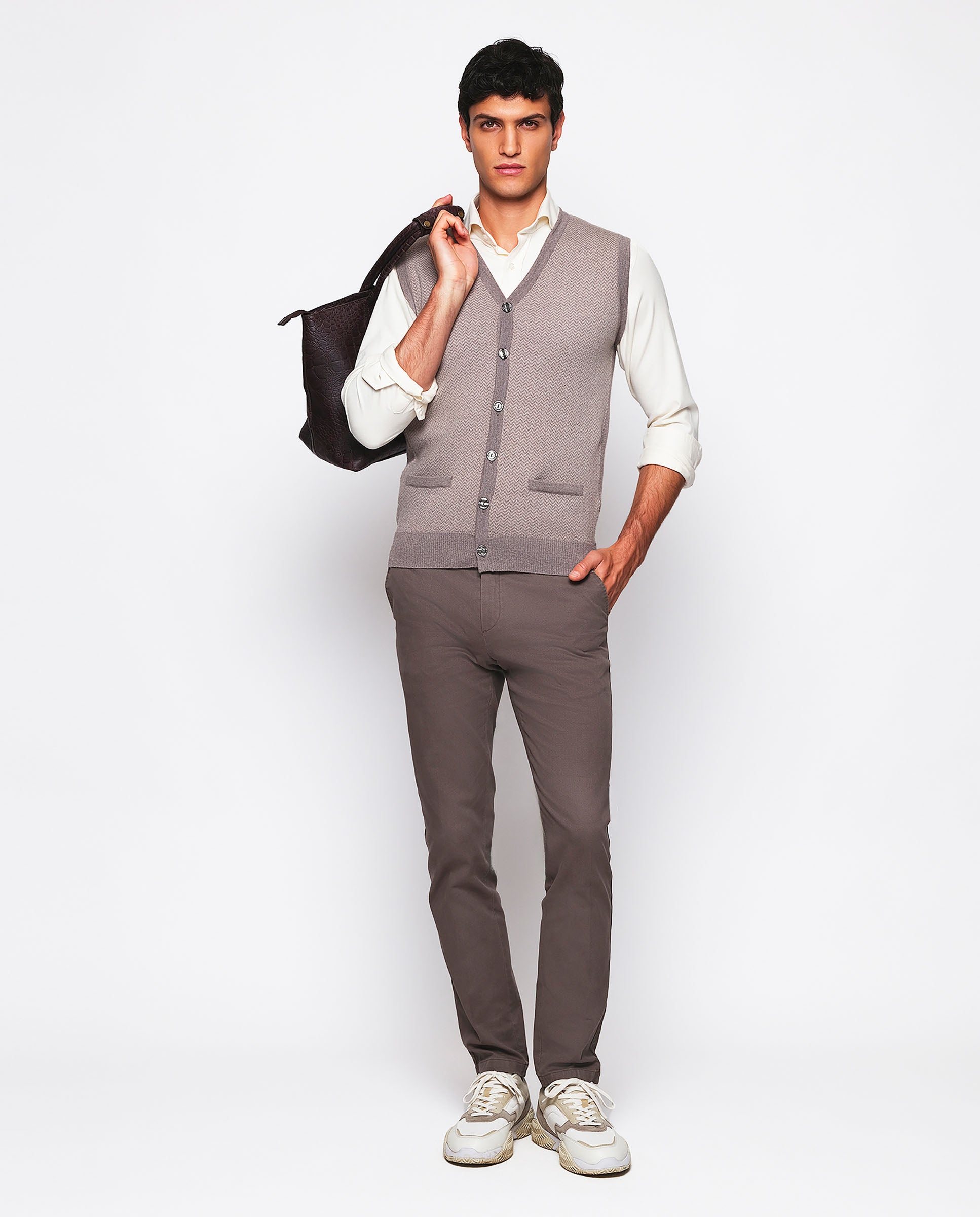 100% wool knit waistcoat. Jacquard front, in tone rivet finishings. Two pockets, button closure.