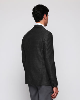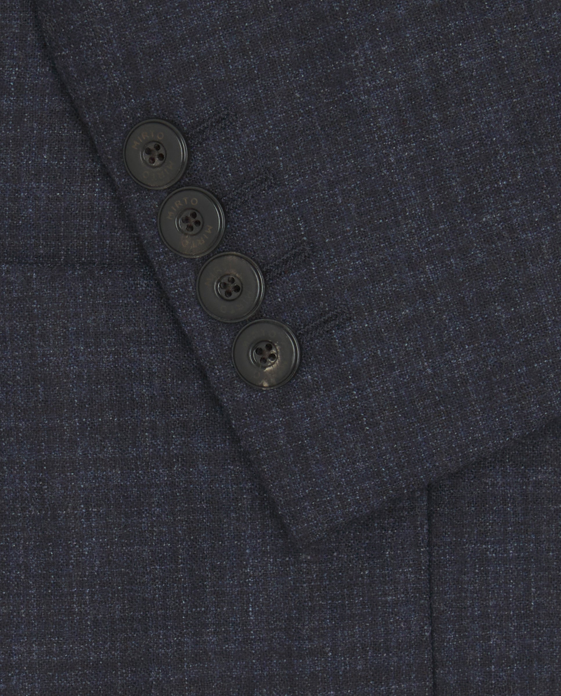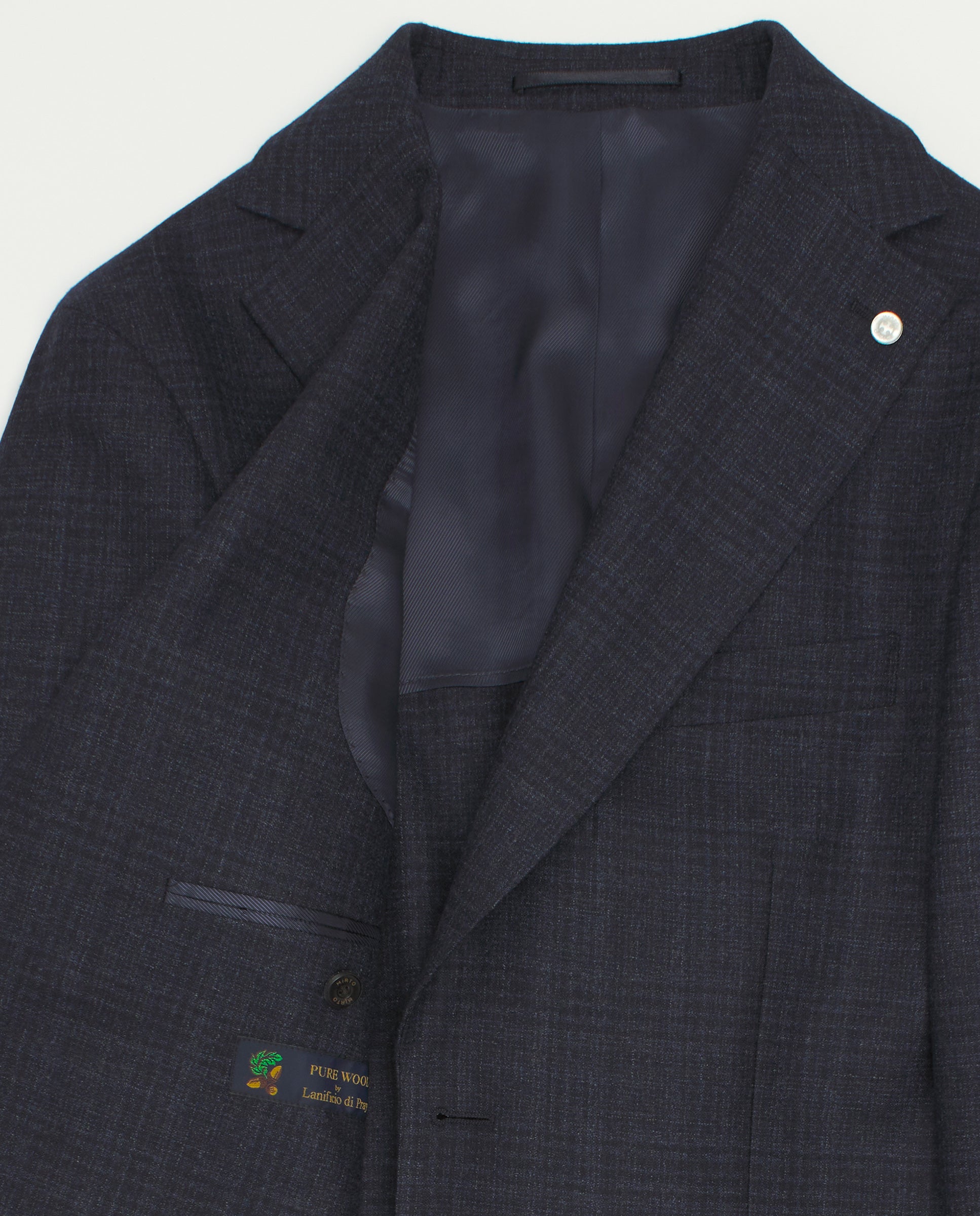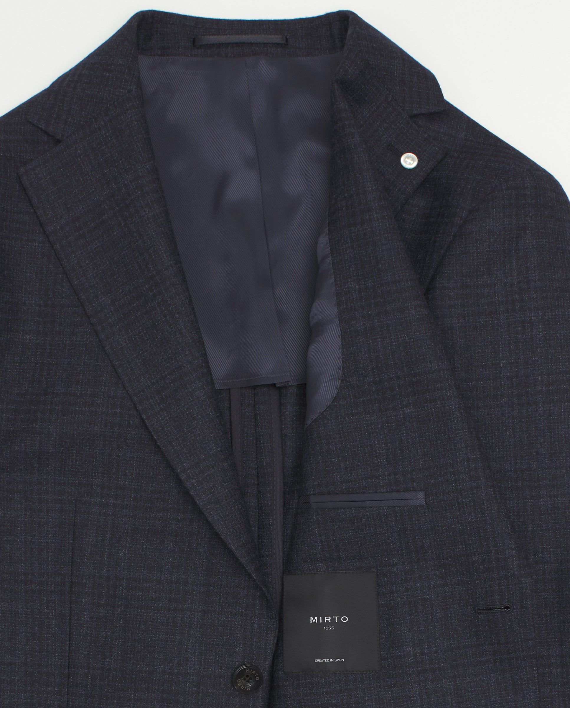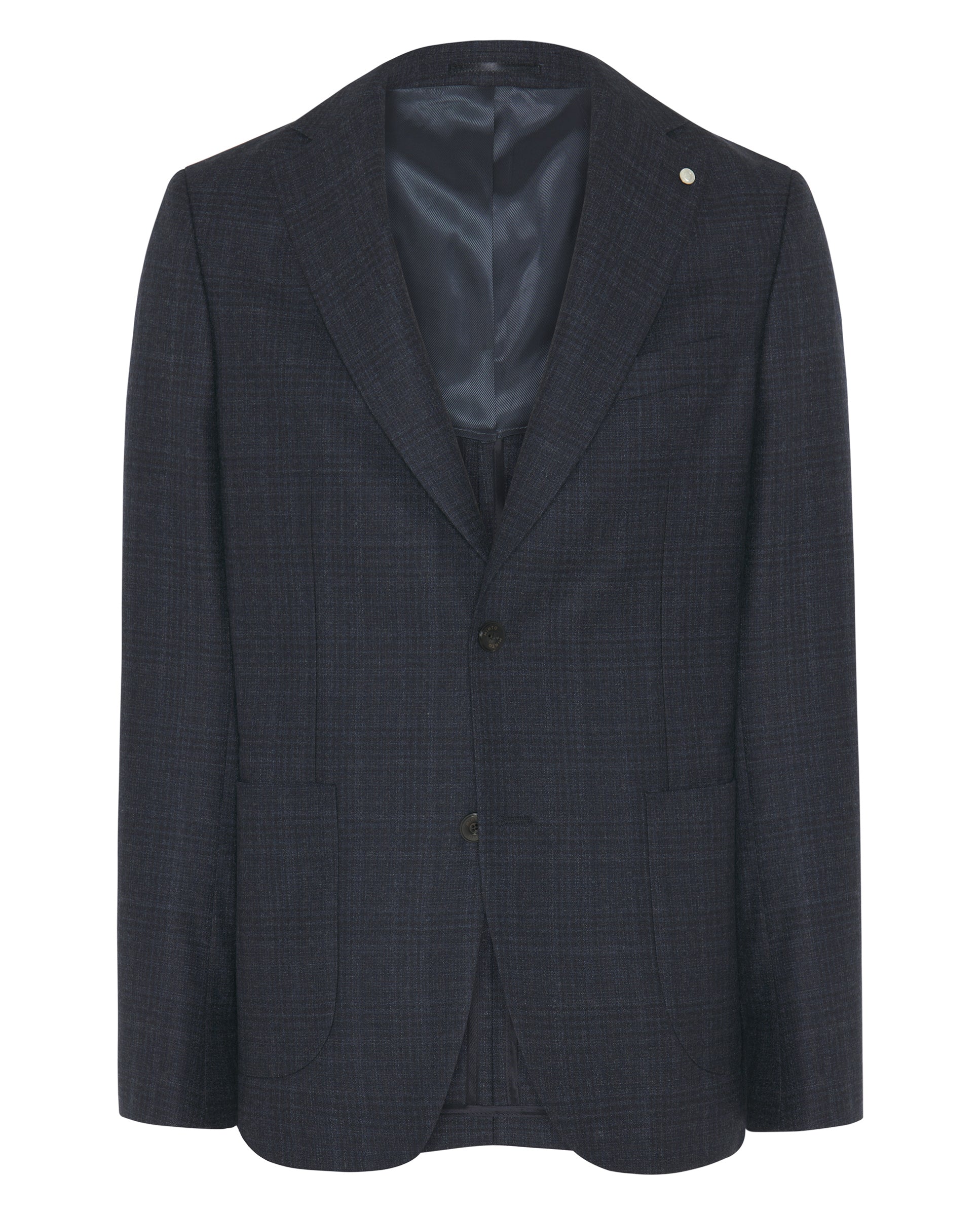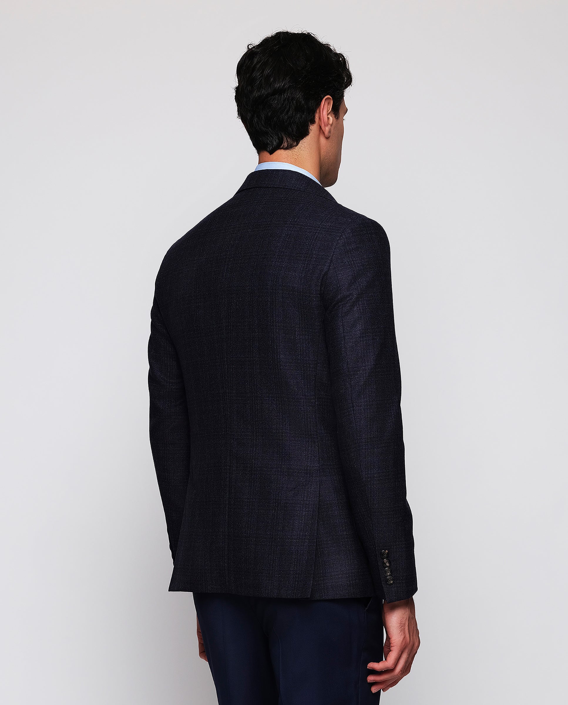 Navy blue 100% wool jacket with a faded plaid pattern and regular fit. Slim, semi-lined shoulder pad, classic lapel, single-breasted two-button closure, patch pocket, and side vents. Tailoring with a casual edge, balancing styles.
