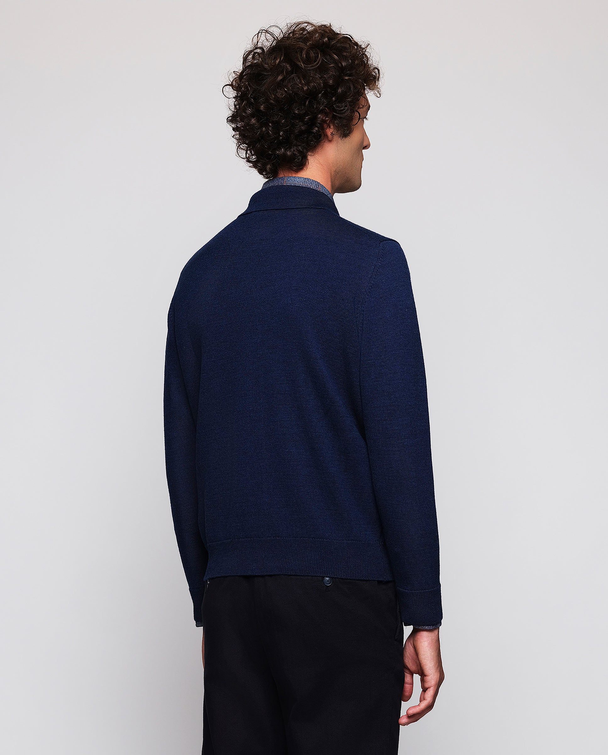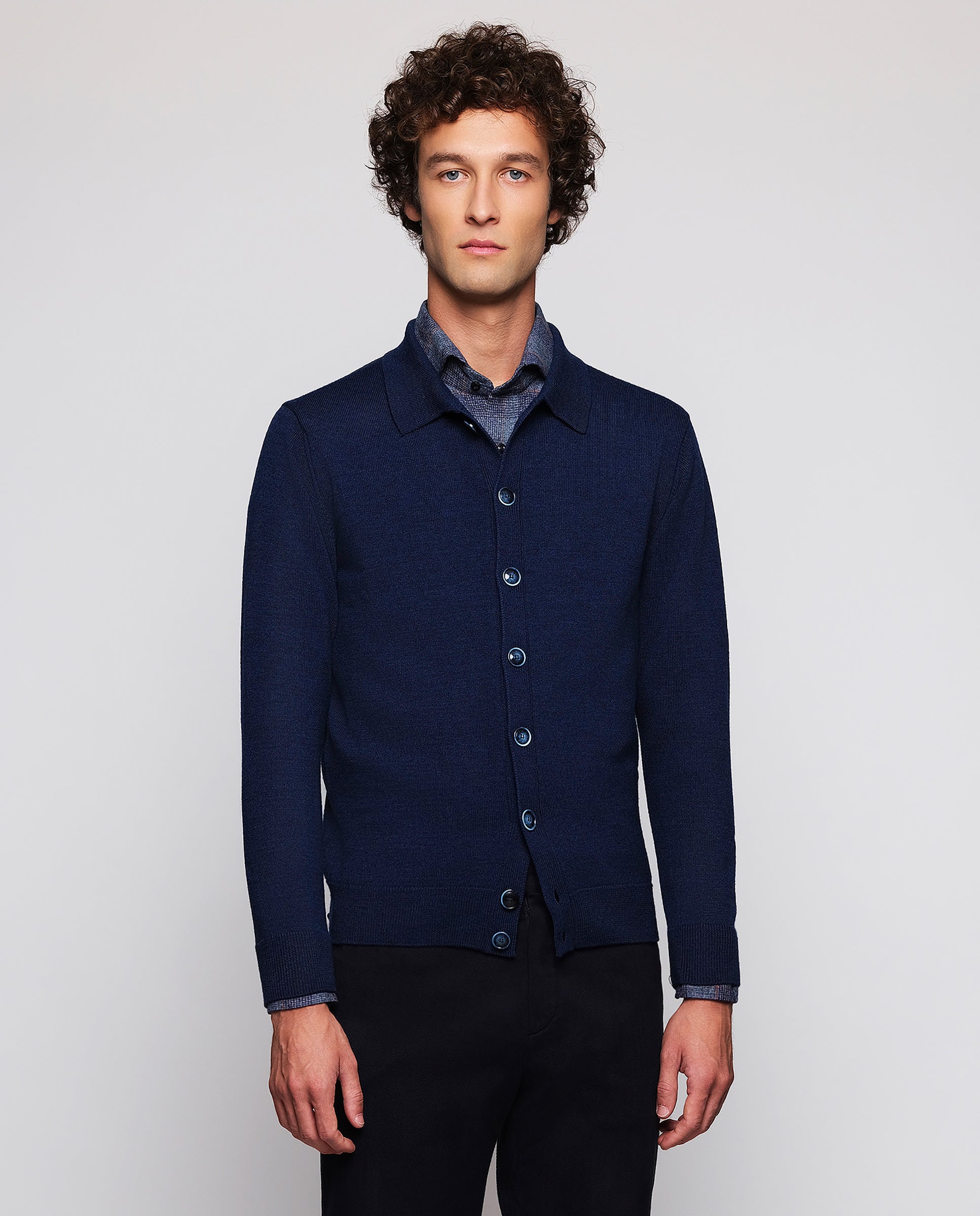 100% wool knit cardigan with shirt collar and button closure. Ribbed collar, cuffs, and hem. A refined yet casual seasonal garment that blends classic shirt details with knitwear ease. Apt for semi formal styles, casually.