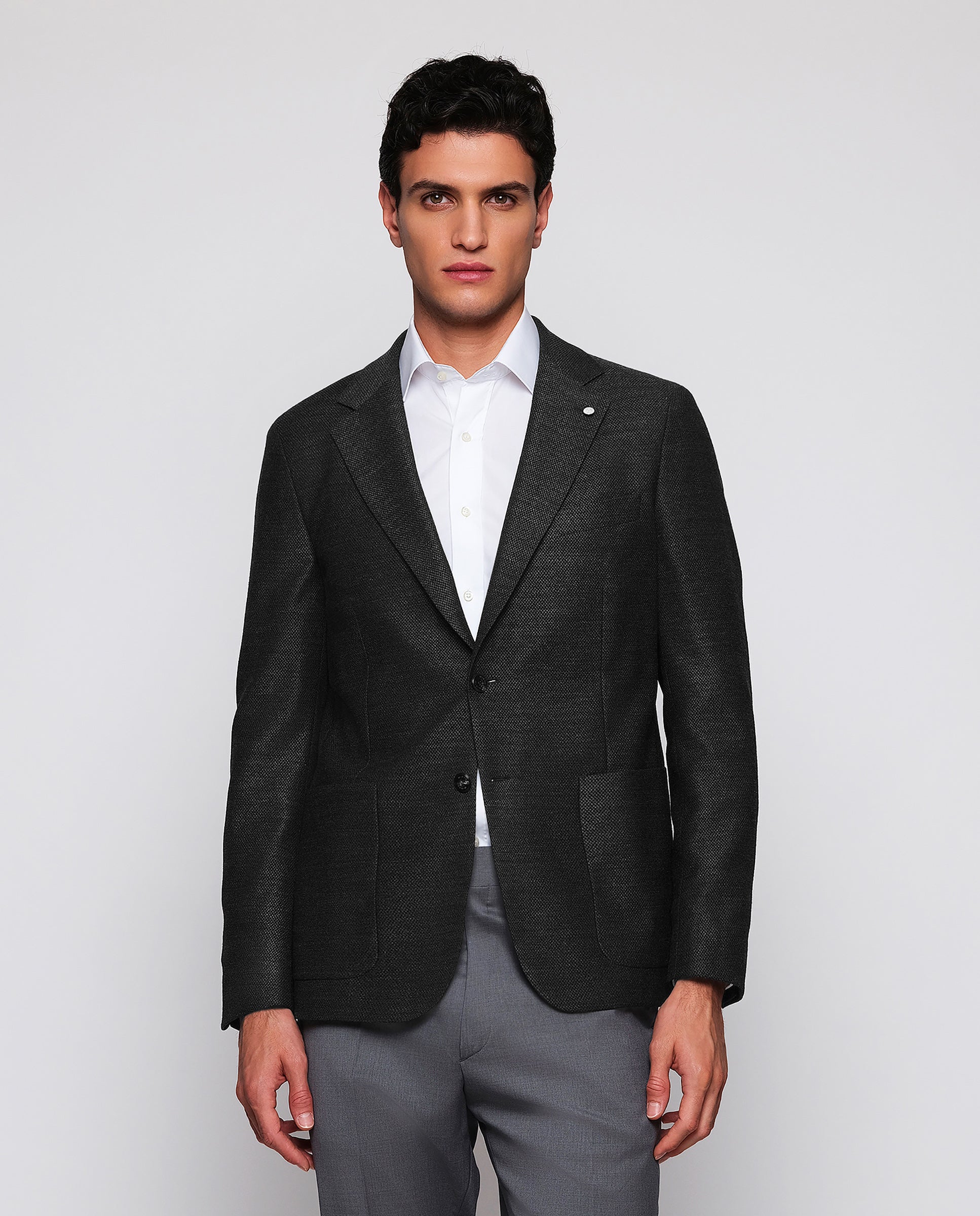 Dark blue 100% wool jacket with wide herringbone structure, regular fit. Unlined, no shoulder pads, classic lapel, single-breasted two-button closure, patch pocket & clean cuff. A rich texture for easy sophisticated styles that define new elegant codes.