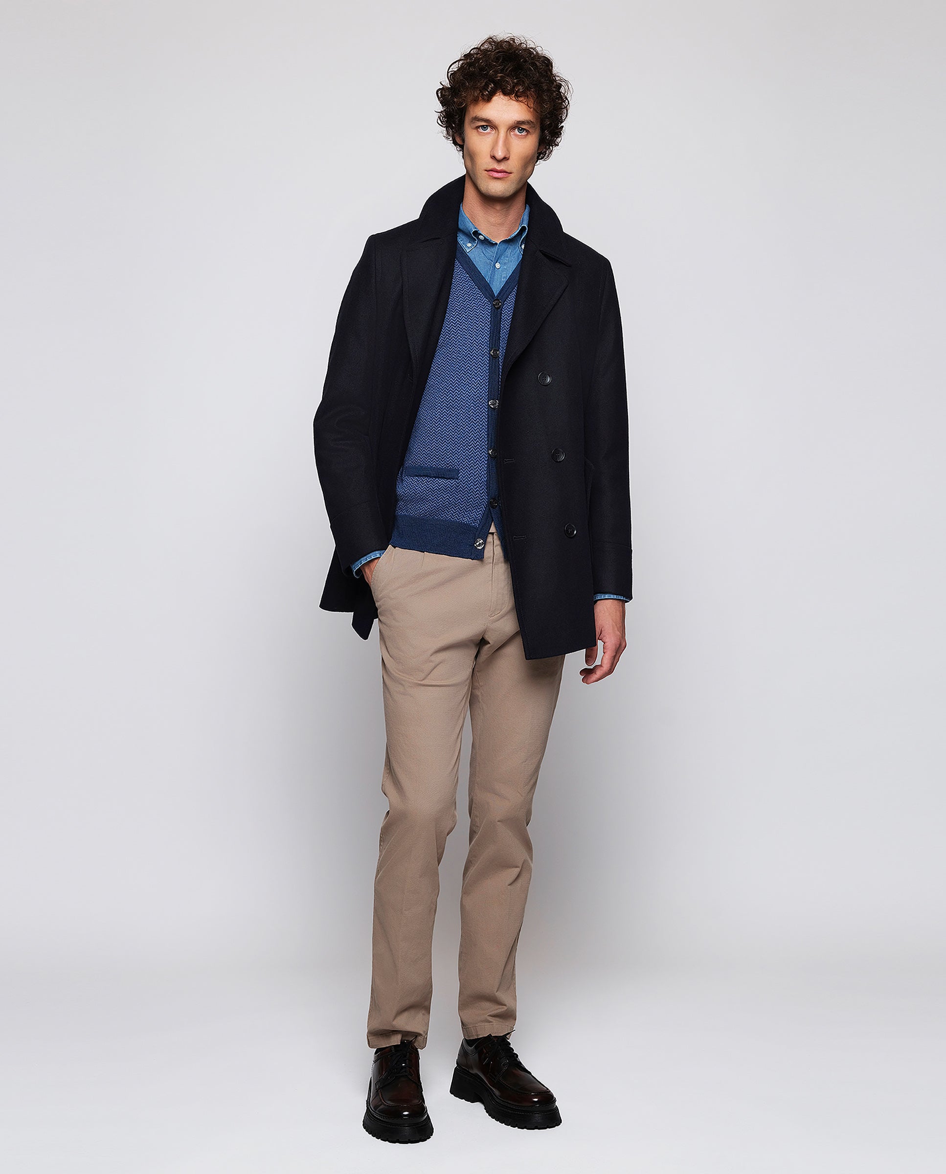 Navy blue pea coat in herringbone-structure cloth. Lapel collar, six-button double-breasted closure, slanted flap pockets, welt pocket, martingale, back vent. Elegant sartorial tradition upgrades urban styles.