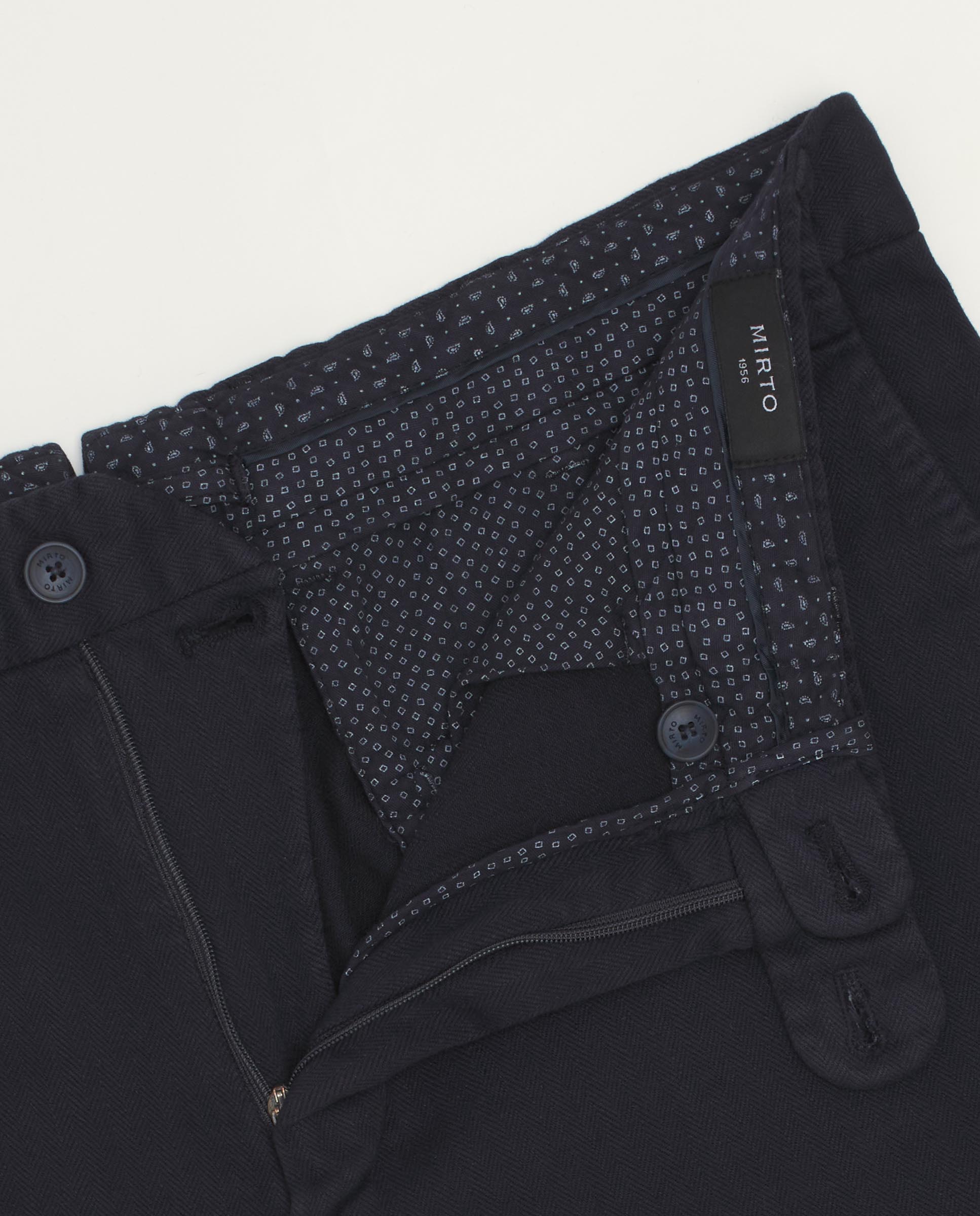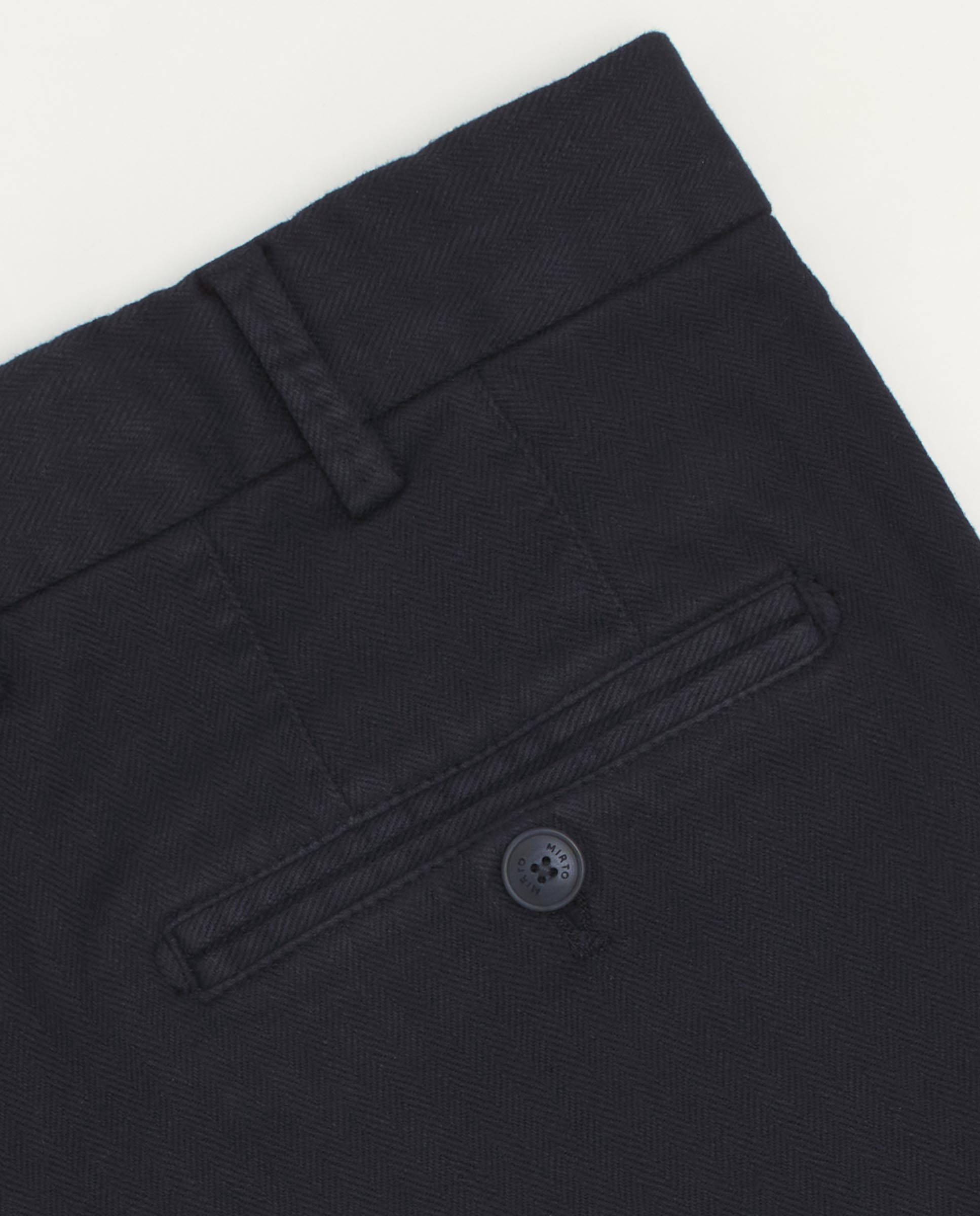 Casual navy blue stretch cotton pants with herringbone structure. Custom fit, no darts.Slant pockets, two back button pockets. Tailored closure, custom button, lined waistband. Contemporary style, classic weave, elevated comfort.