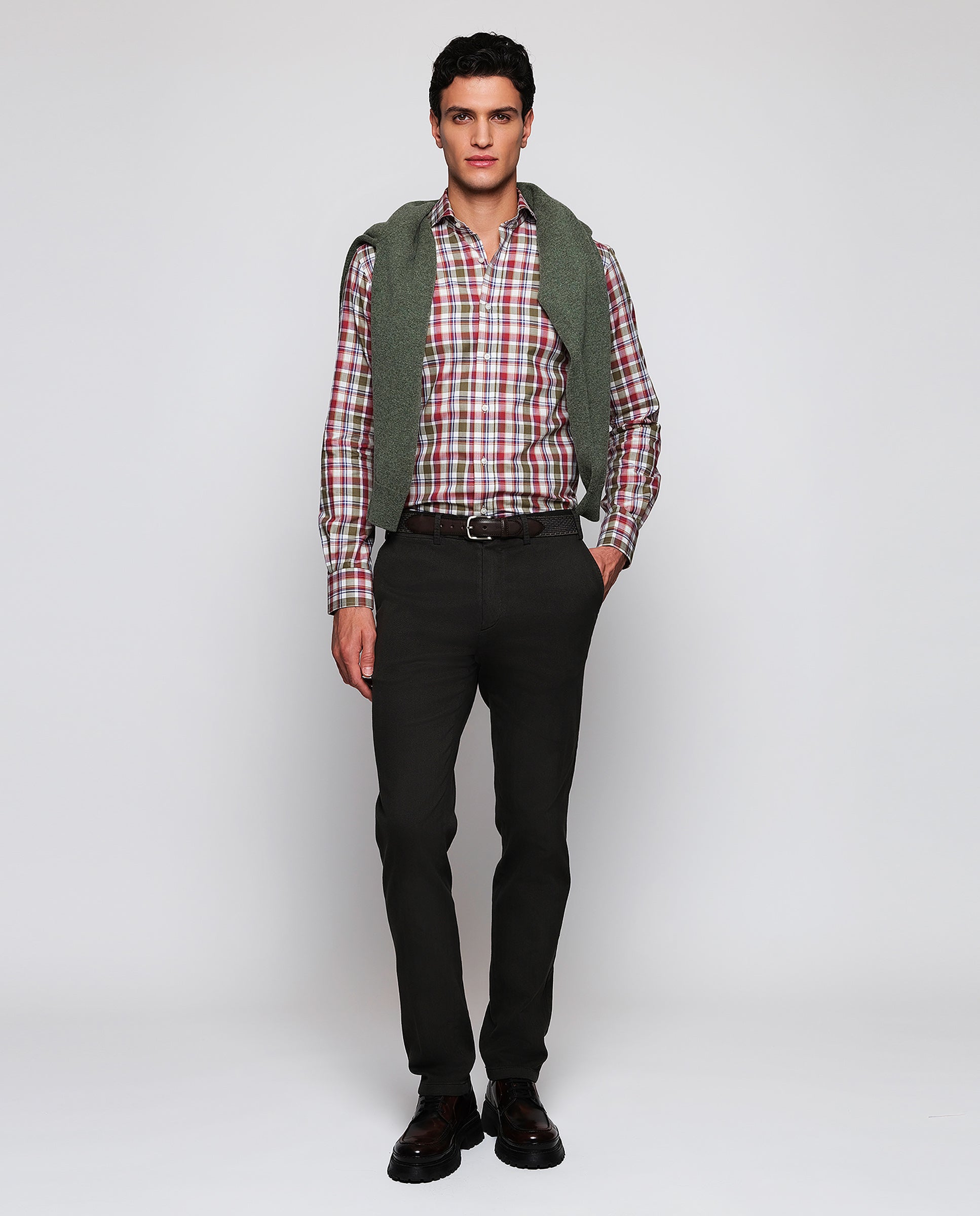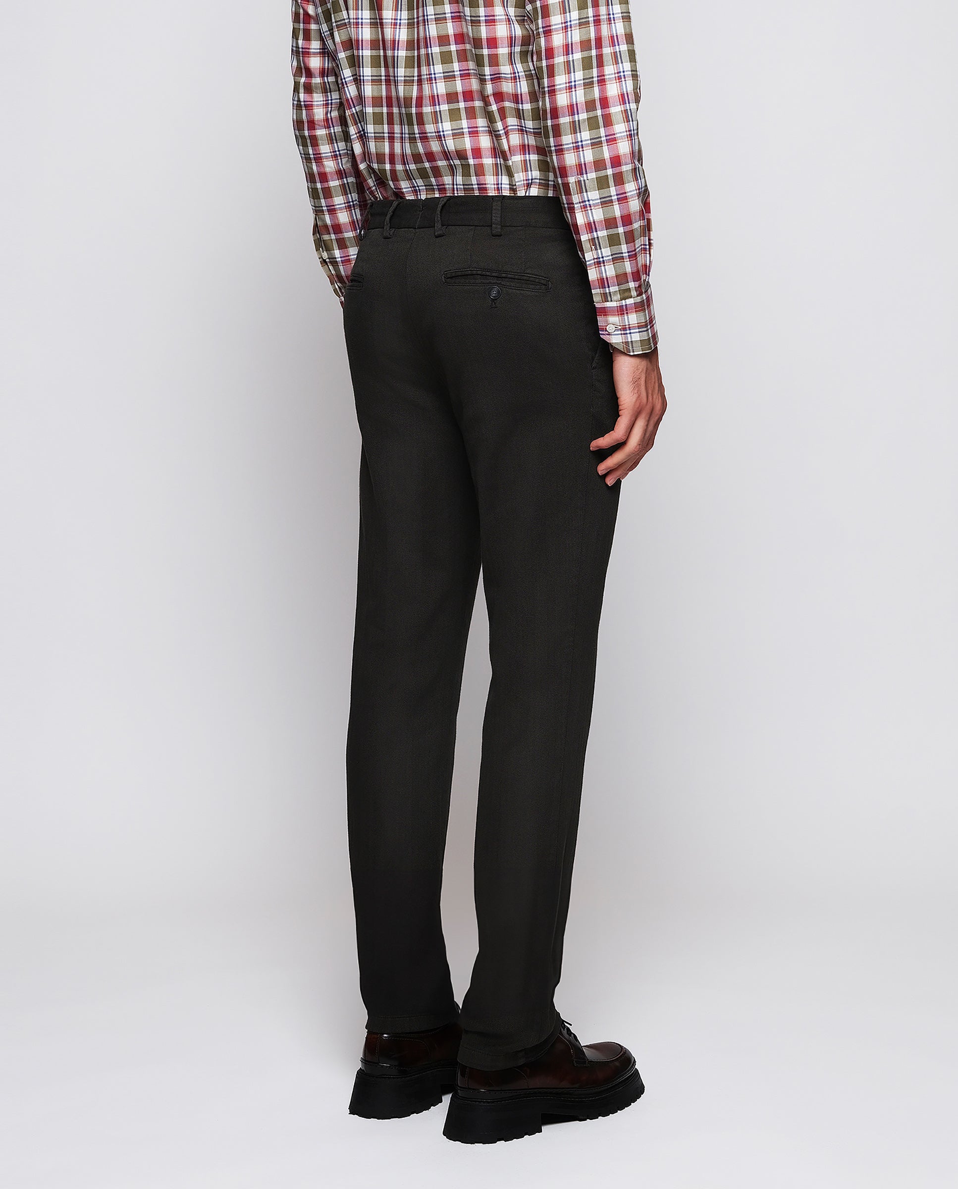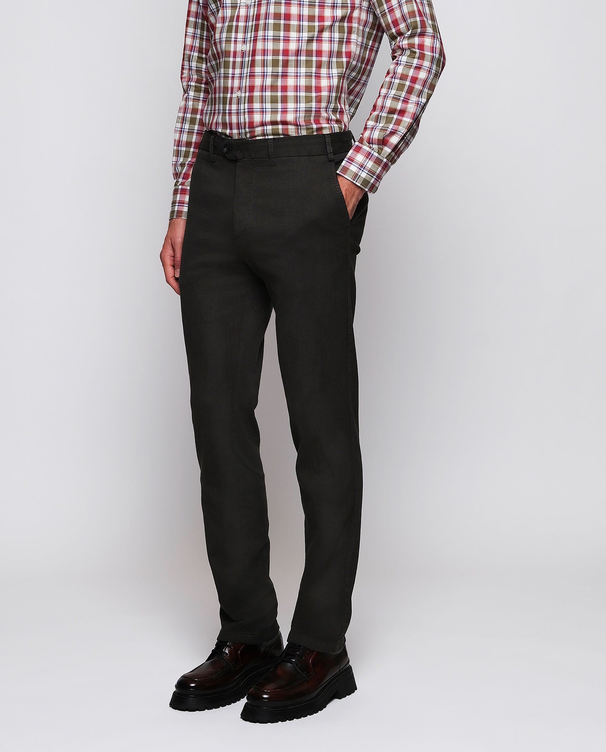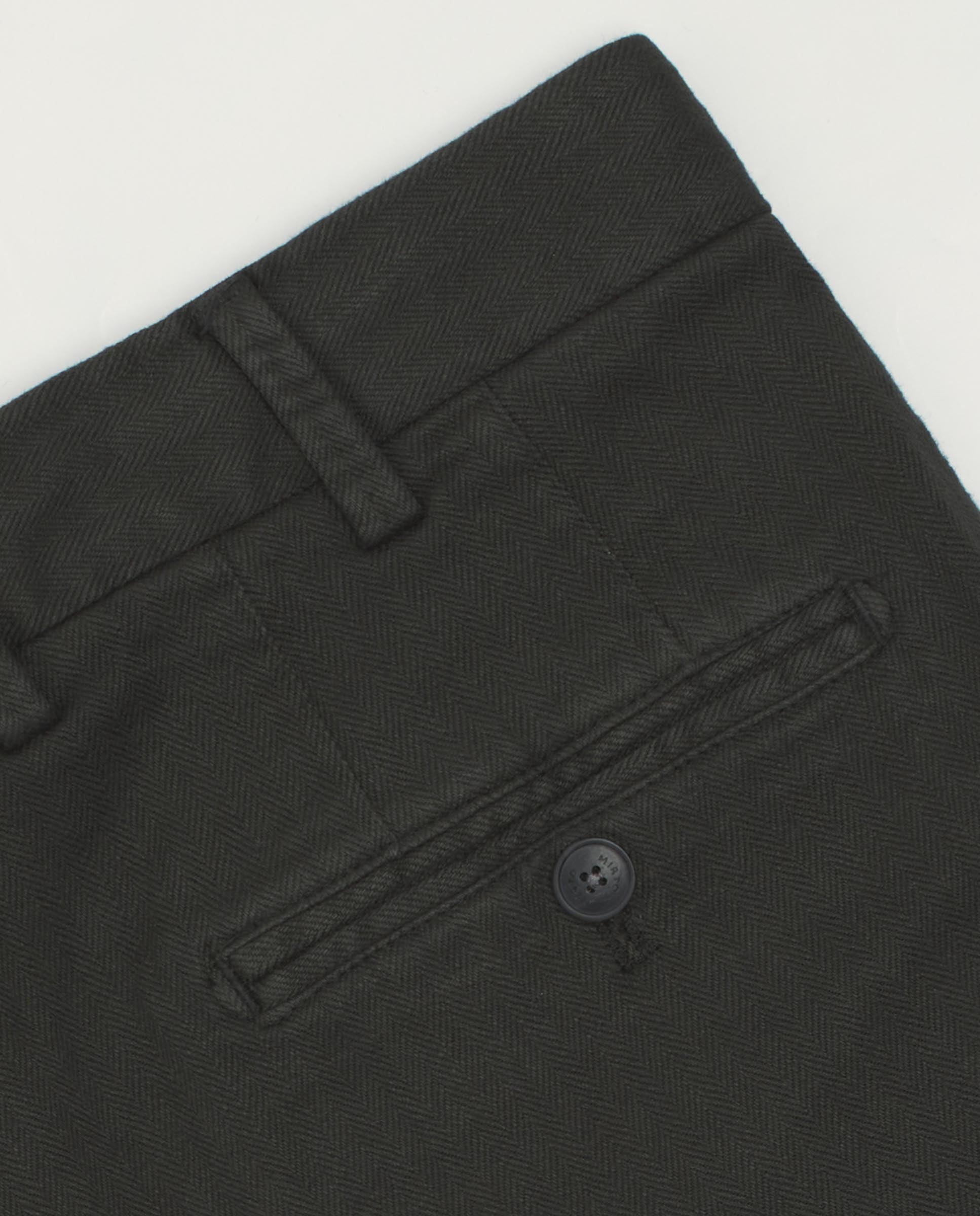 Casual green stretch cotton pants with herringbone structure. Custom fit, no darts. Slant pockets, two back button pockets. Tailored closure, custom button, lined waistband. Contemporary style, classic weave, elevated comfort.