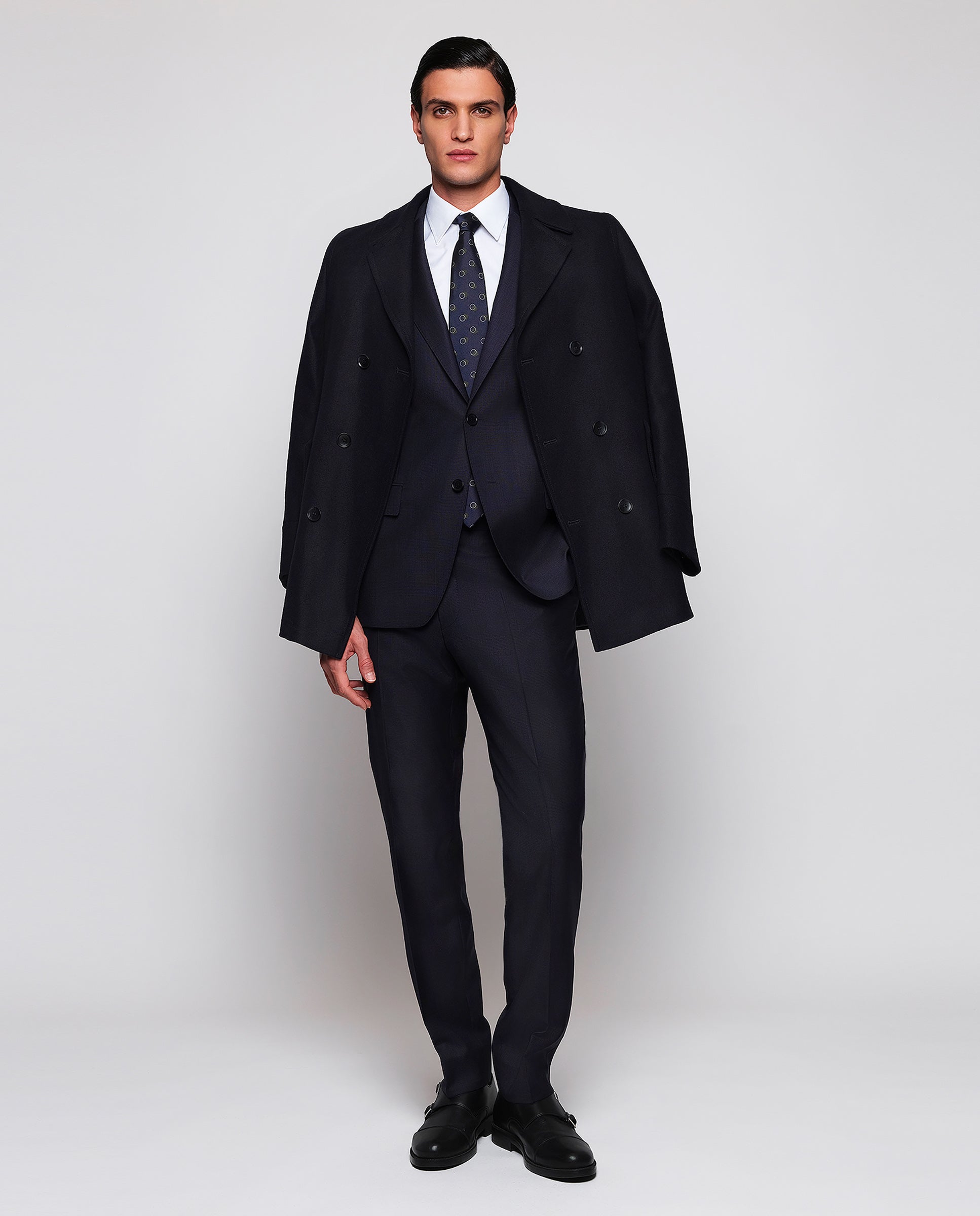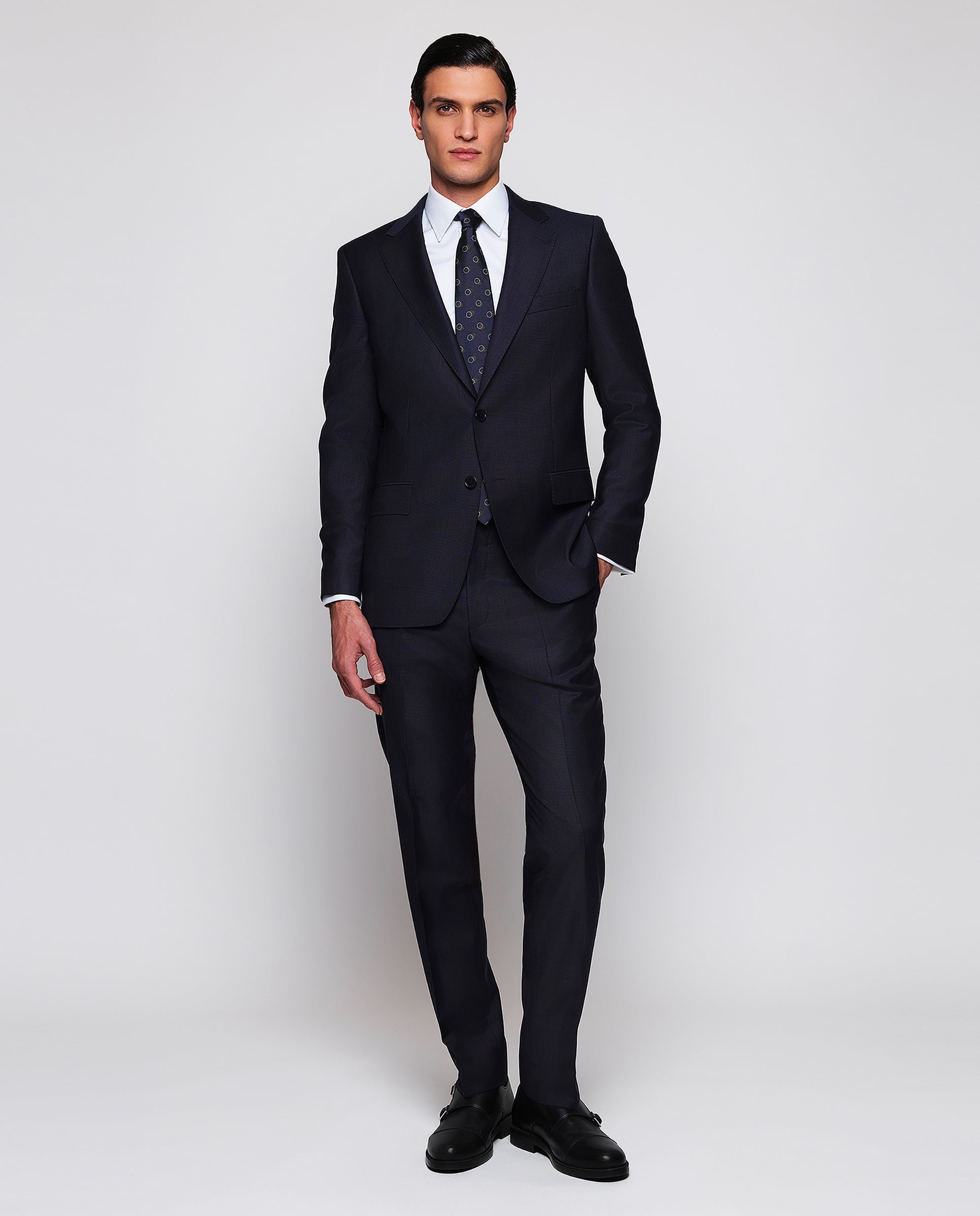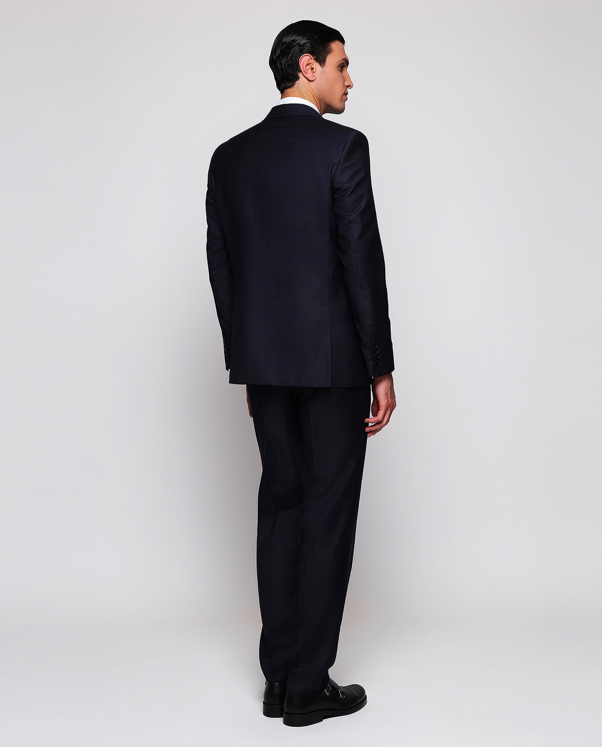 Navy blue 100% wool Glen plaid suit, regular fit. Jacket fully lined, shoulder pads, classic lapels, single-breasted two-button closure, straight flap pocket, side vents. Trousers without darts & slant pockets. A classic plaid, created for now.