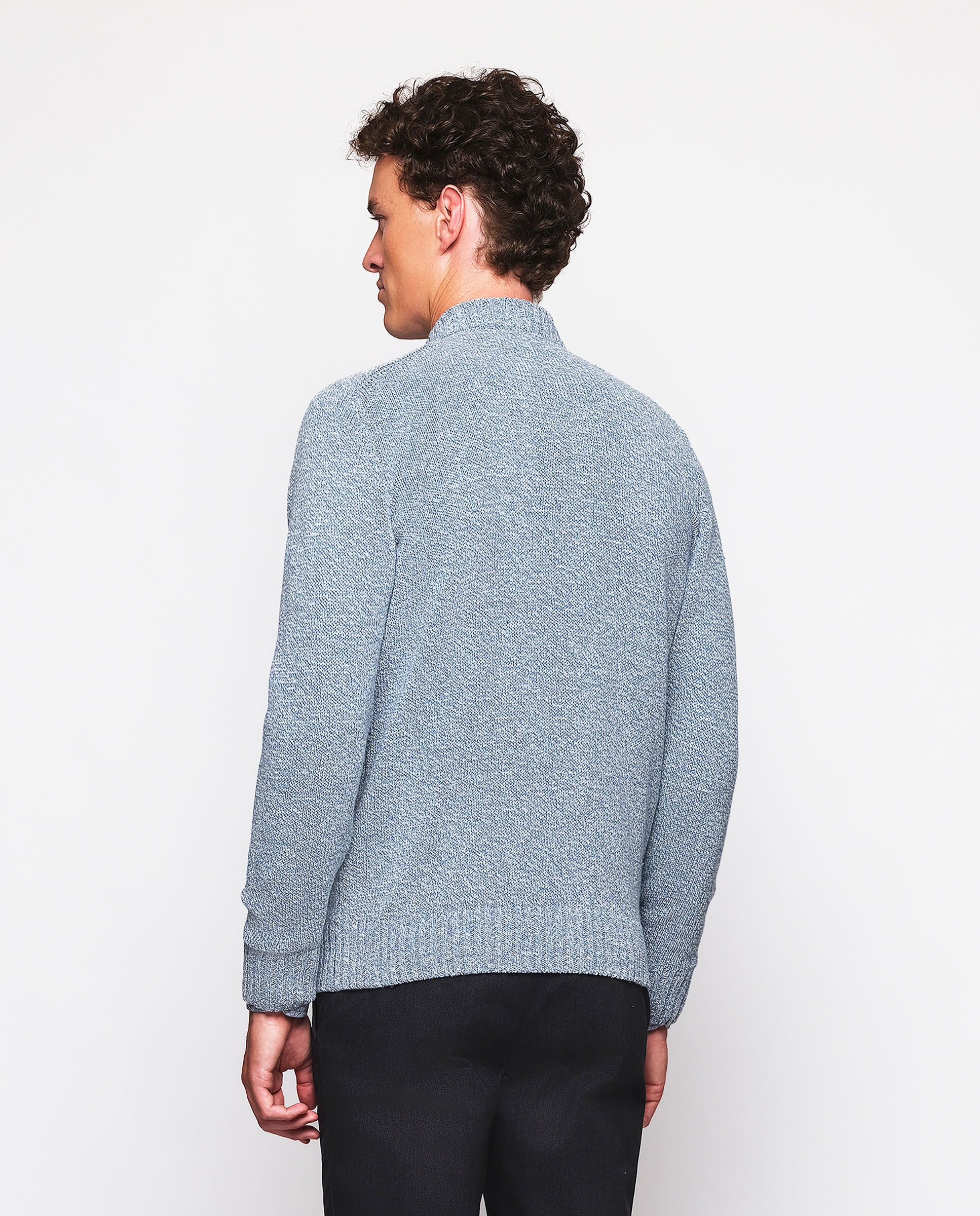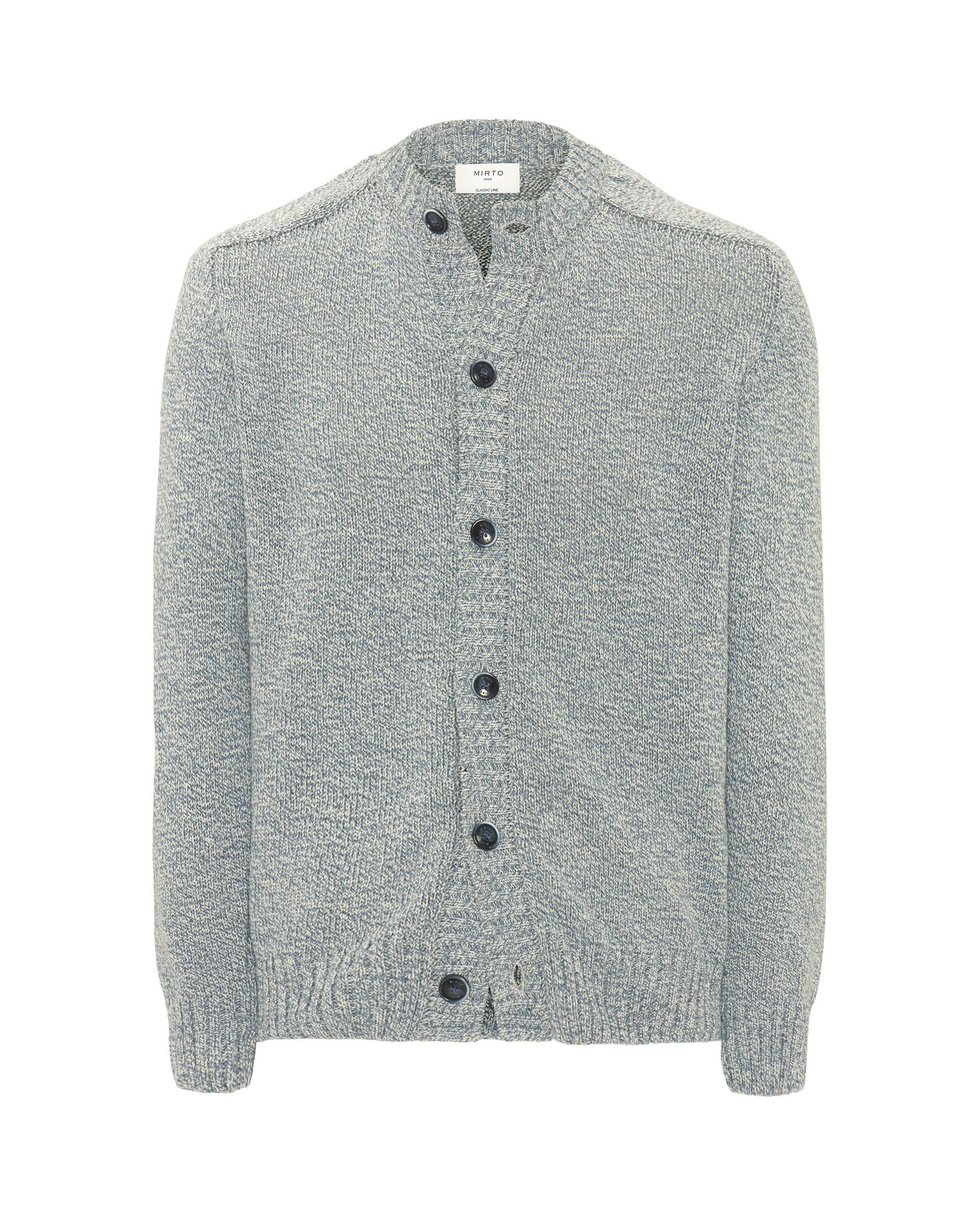 Button-down cotton-blend cardigan with a rustic melange structure. Ribbed collar, button placket, cuffs, and hem.