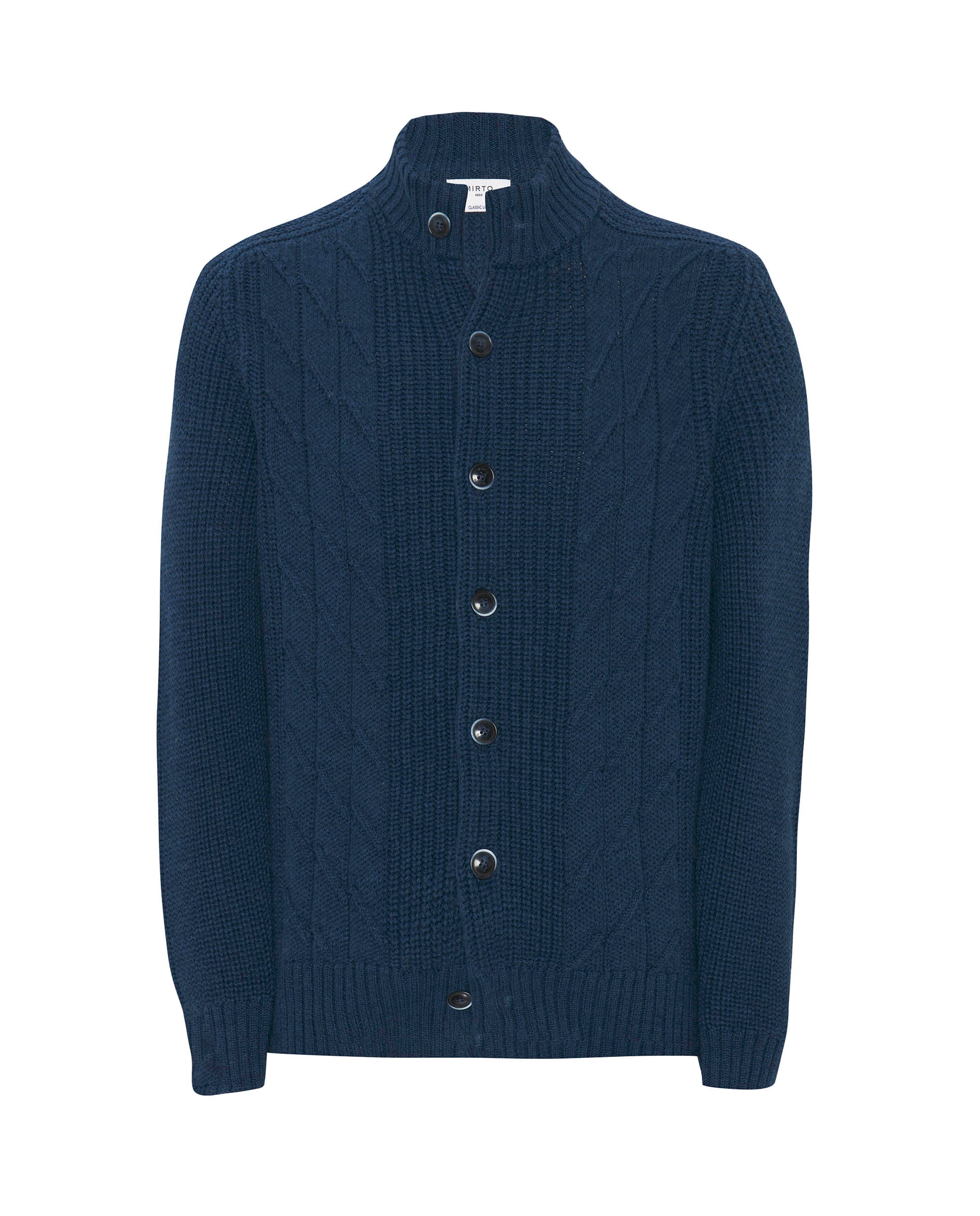 Knit cardigan with a geometric jacquard pattern in front in 100% heavy gauge wool. Button closure. Ribbed collar, cuffs, and hem.