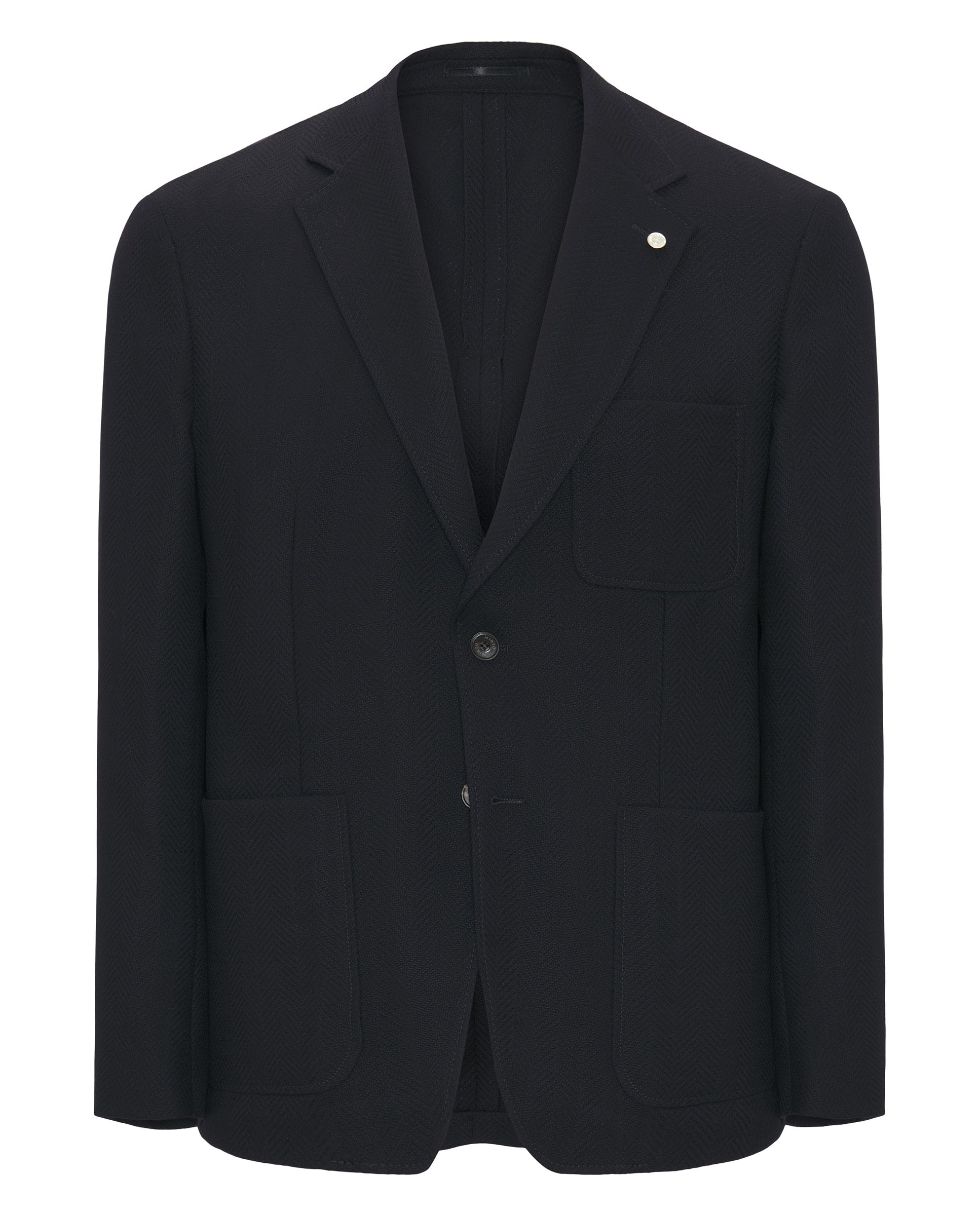 Dark blue 100% wool jacket with wide herringbone structure, regular fit. Unlined, no shoulder pads, classic lapel, single-breasted two-button closure, patch pocket & clean cuff. A heritage structure in balance with modernity.