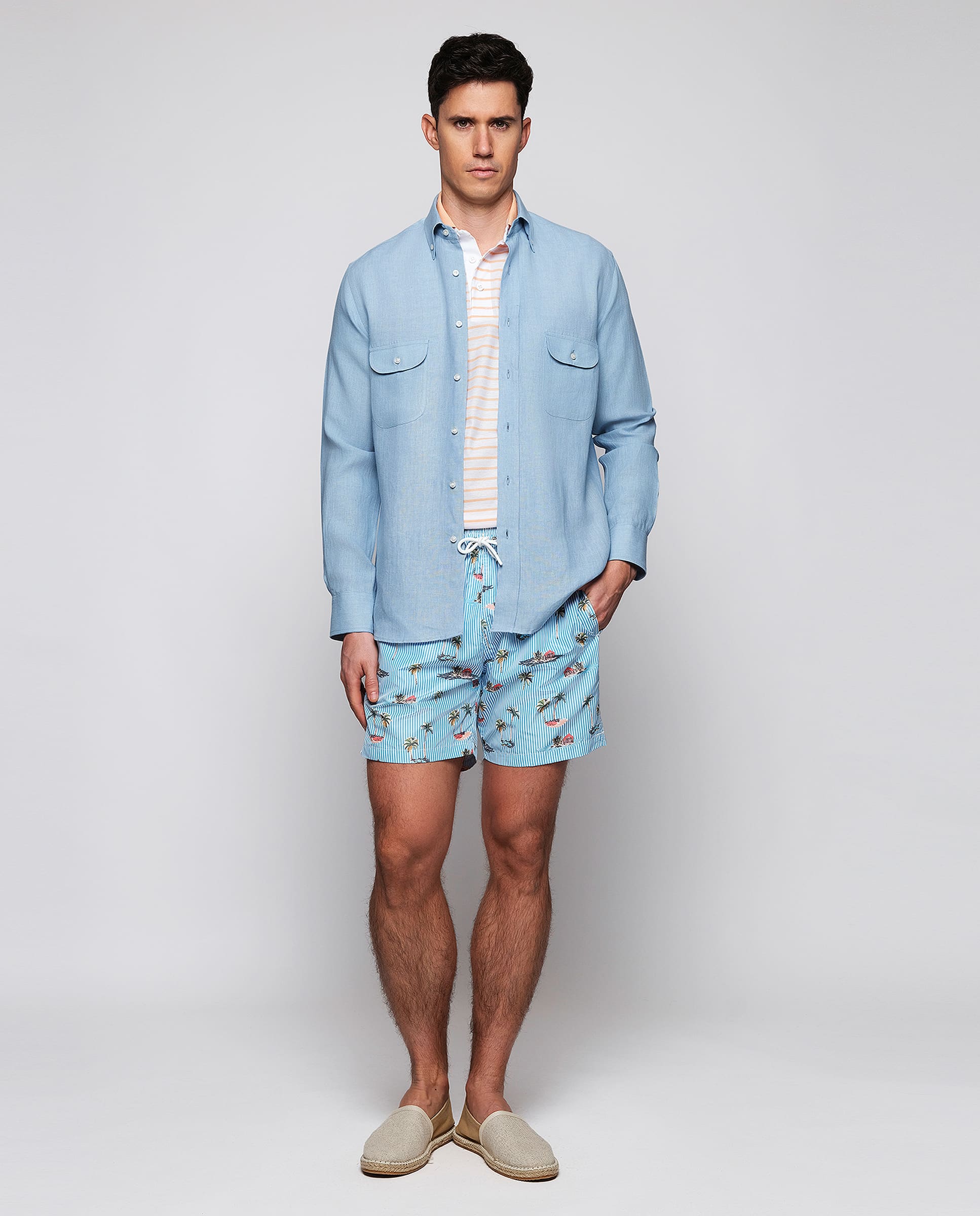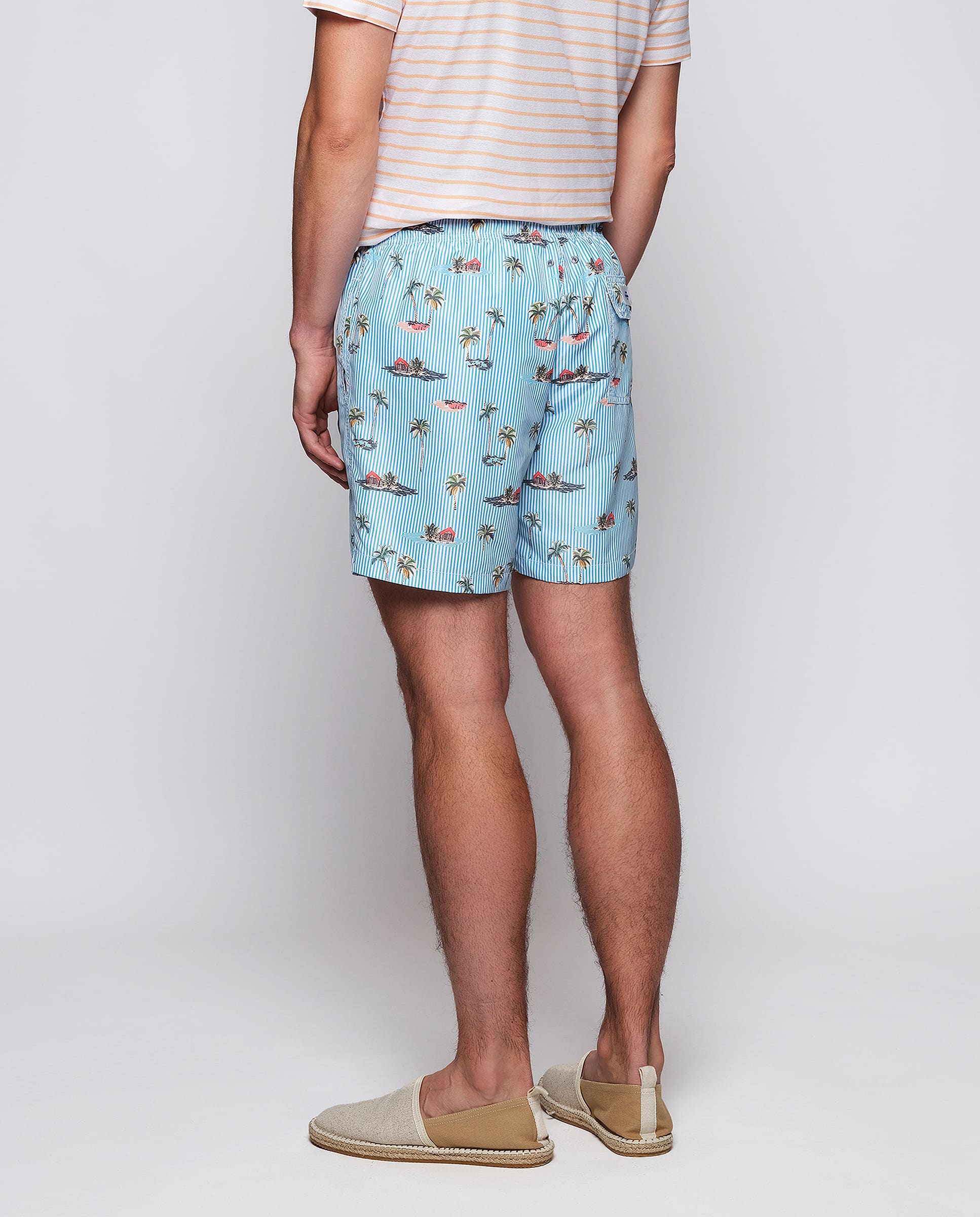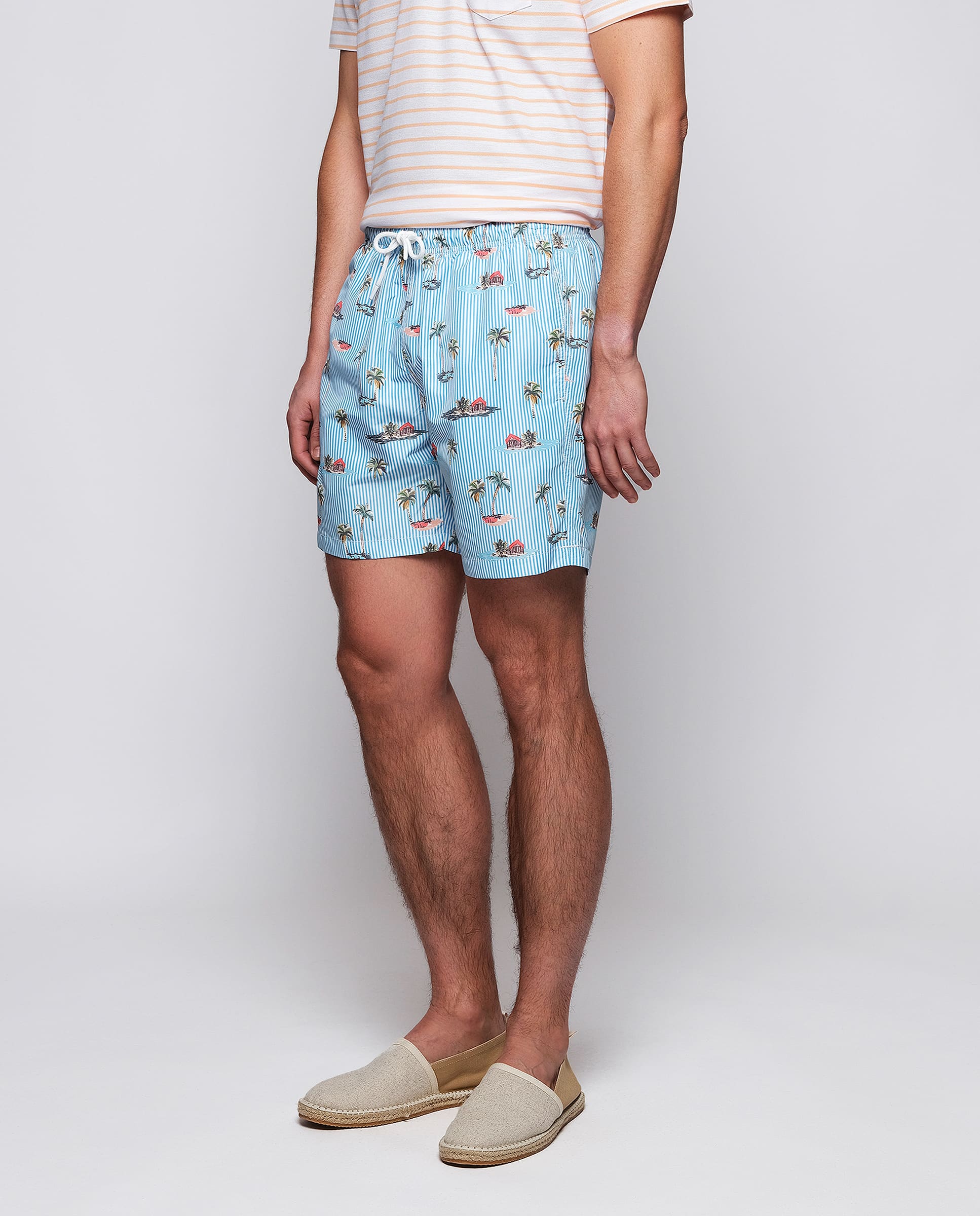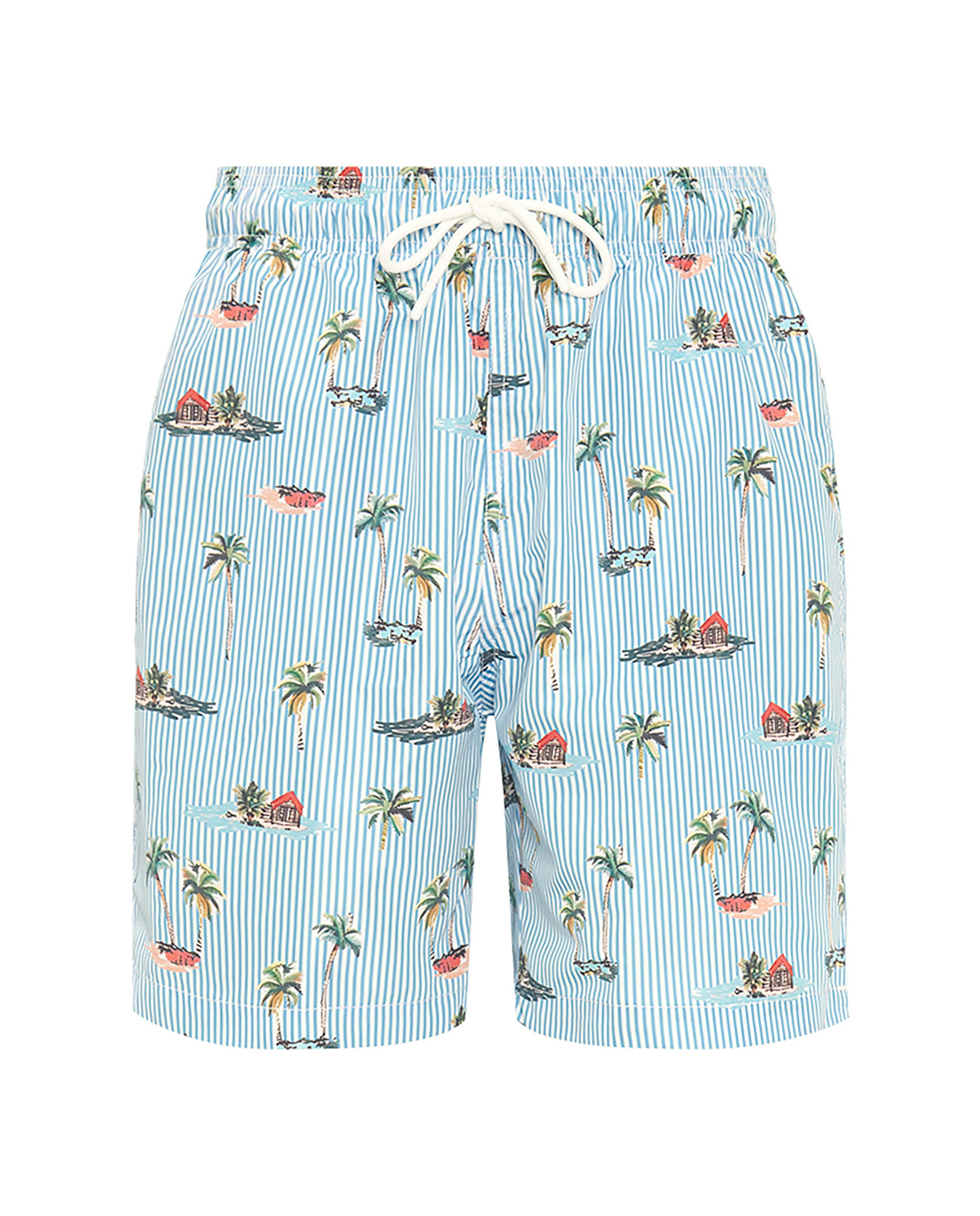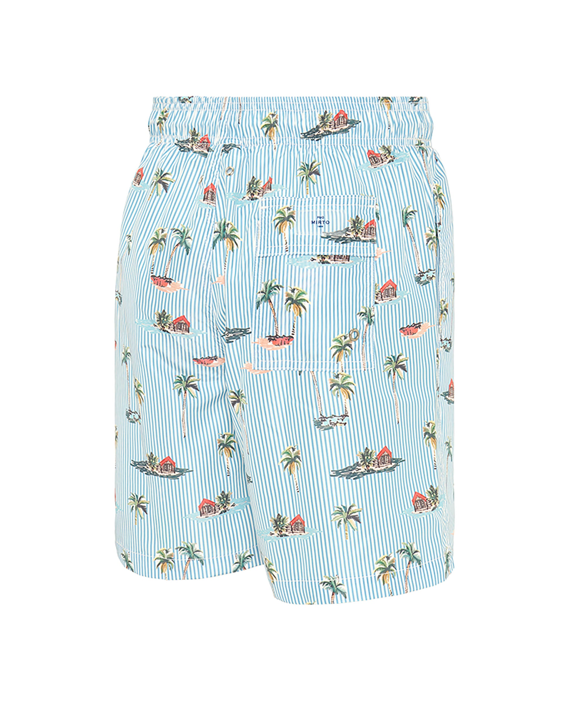 Bermuda style swim shorts, tropical print over stripes, made in 100% recycled waterproof, quick dry & soft feel fabric. Two side pockets, one back flap pocket. Elastic waistband with drawstring, lined with seamless mesh.