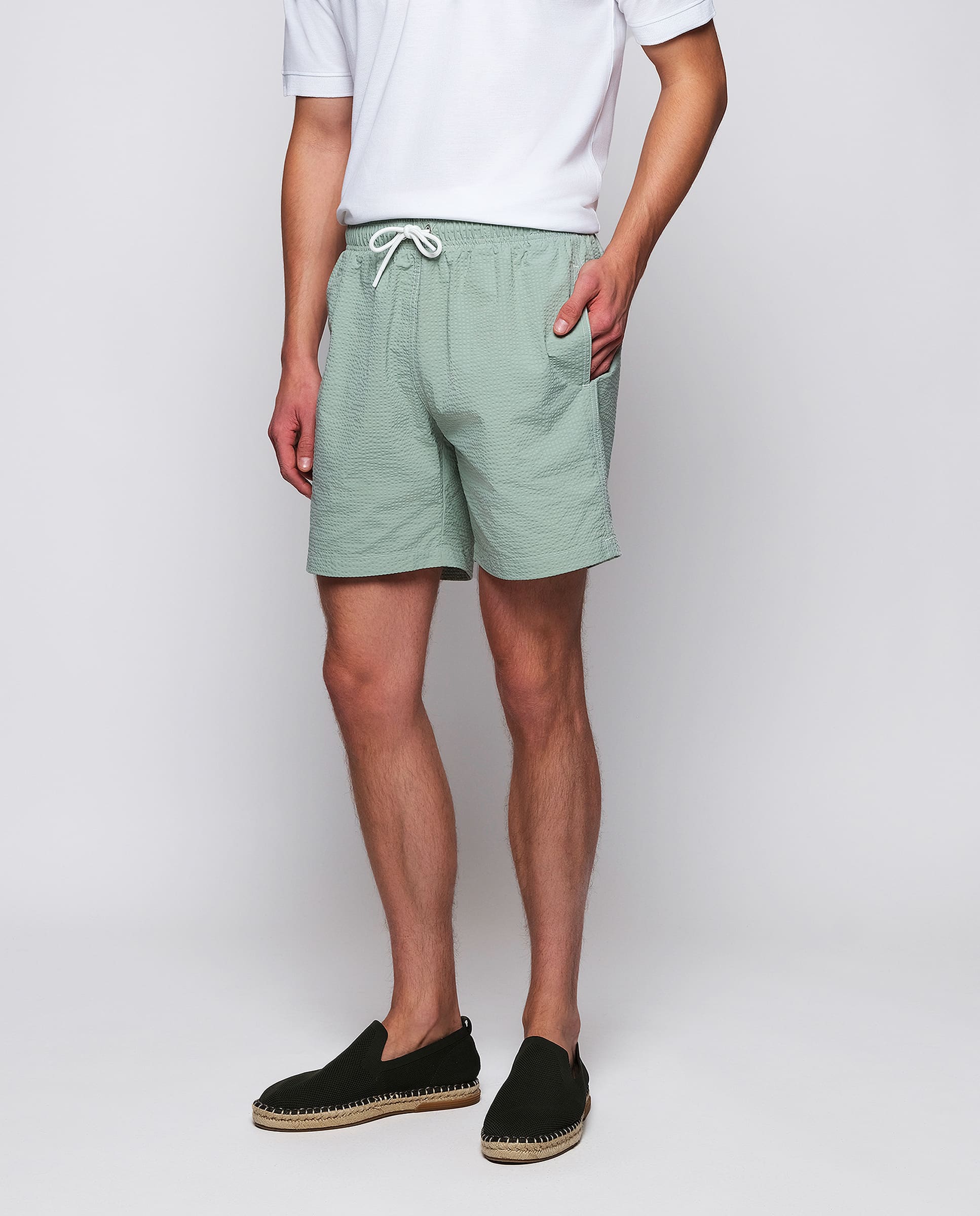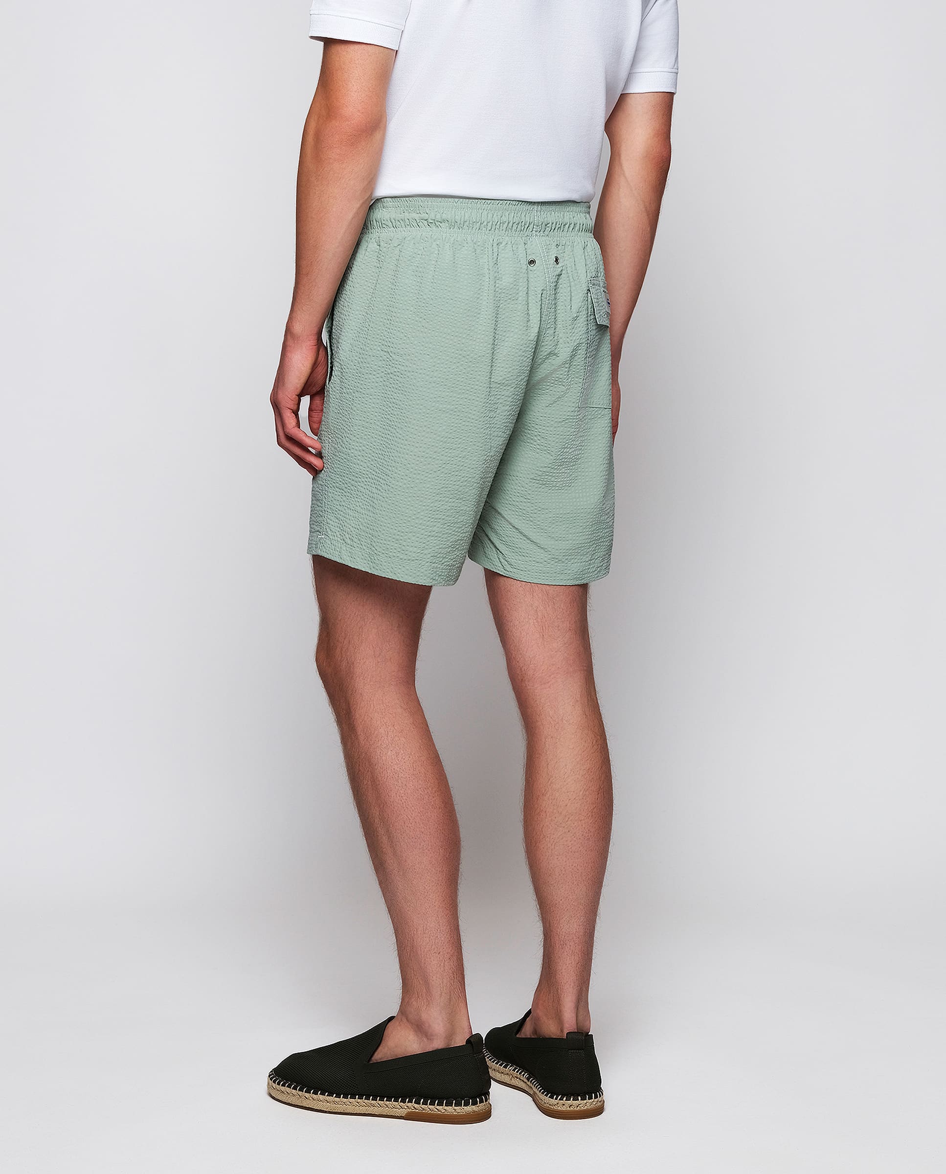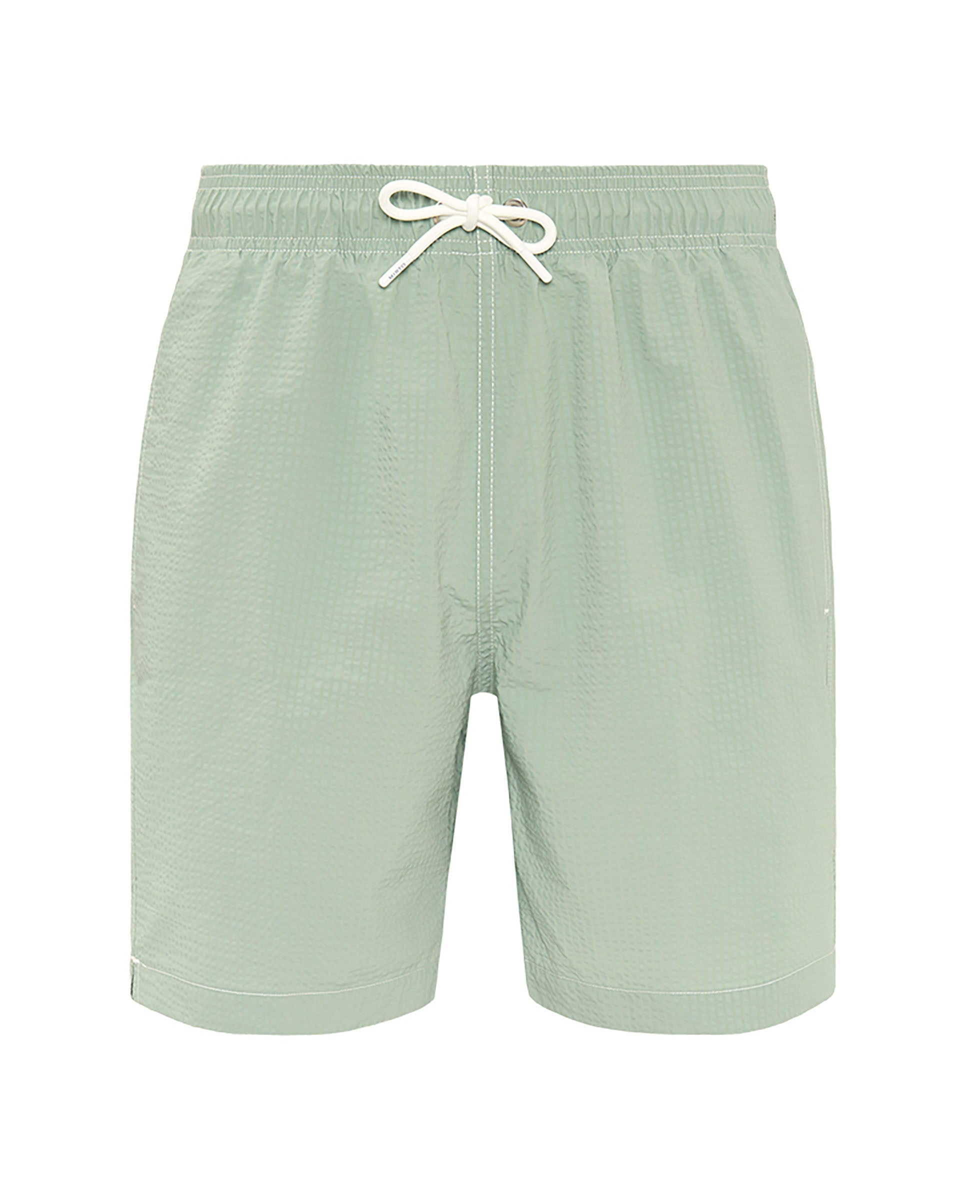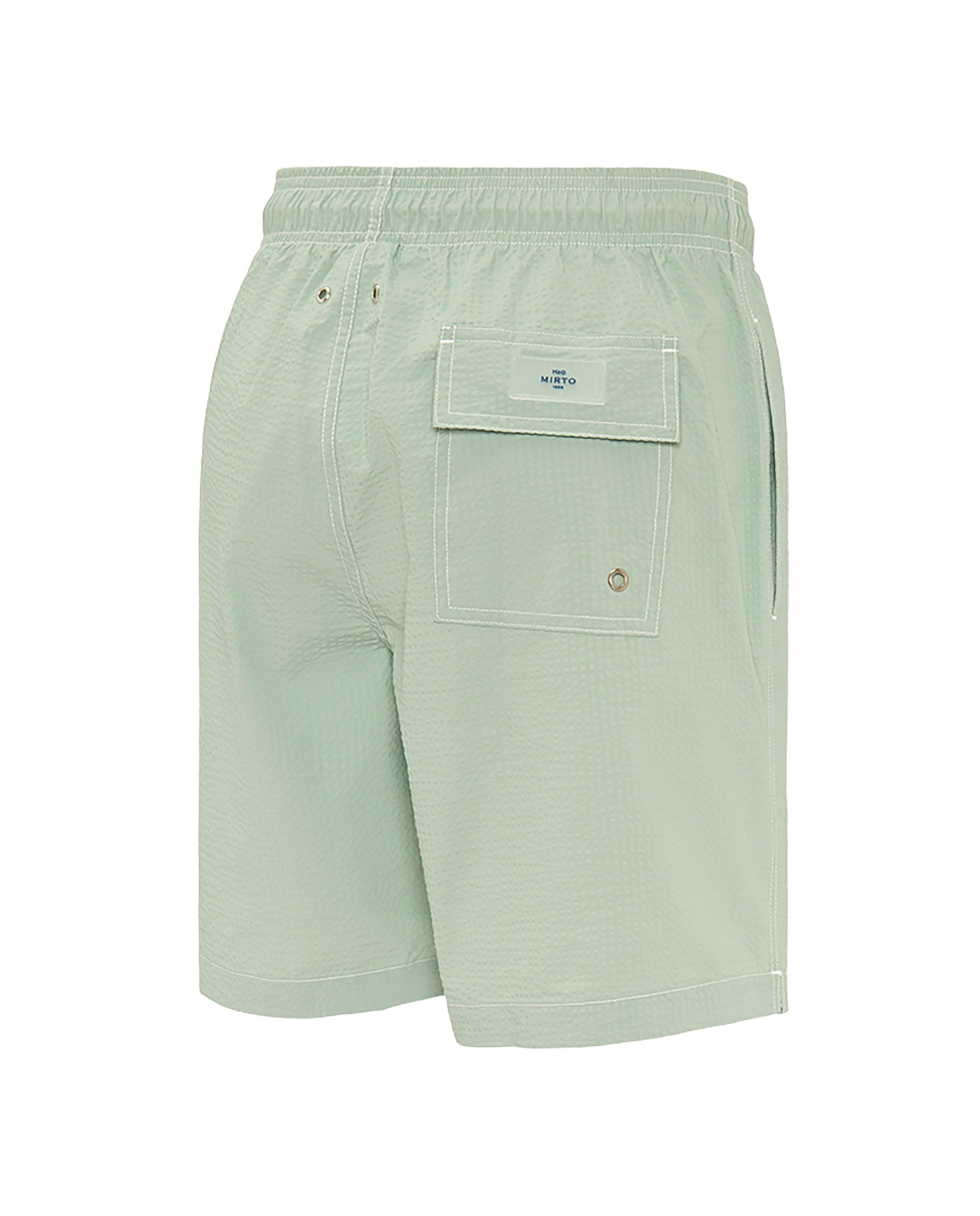 Bermuda style swim shorts, striped, made in recycled seersucker, waterproof, quick dry & soft feel fabric. Two side pockets, one back flap pocket. Elastic waistband with drawstring, lined with seamless mesh.