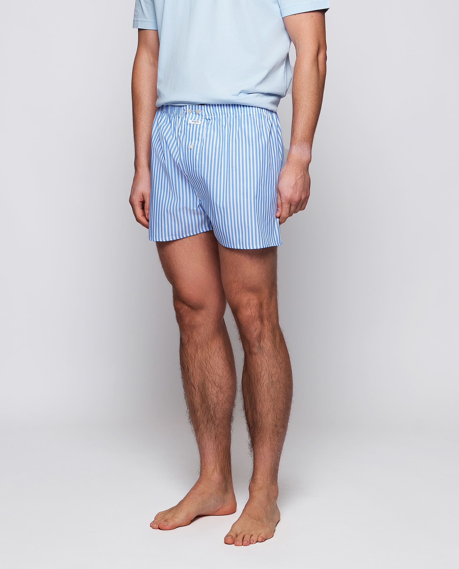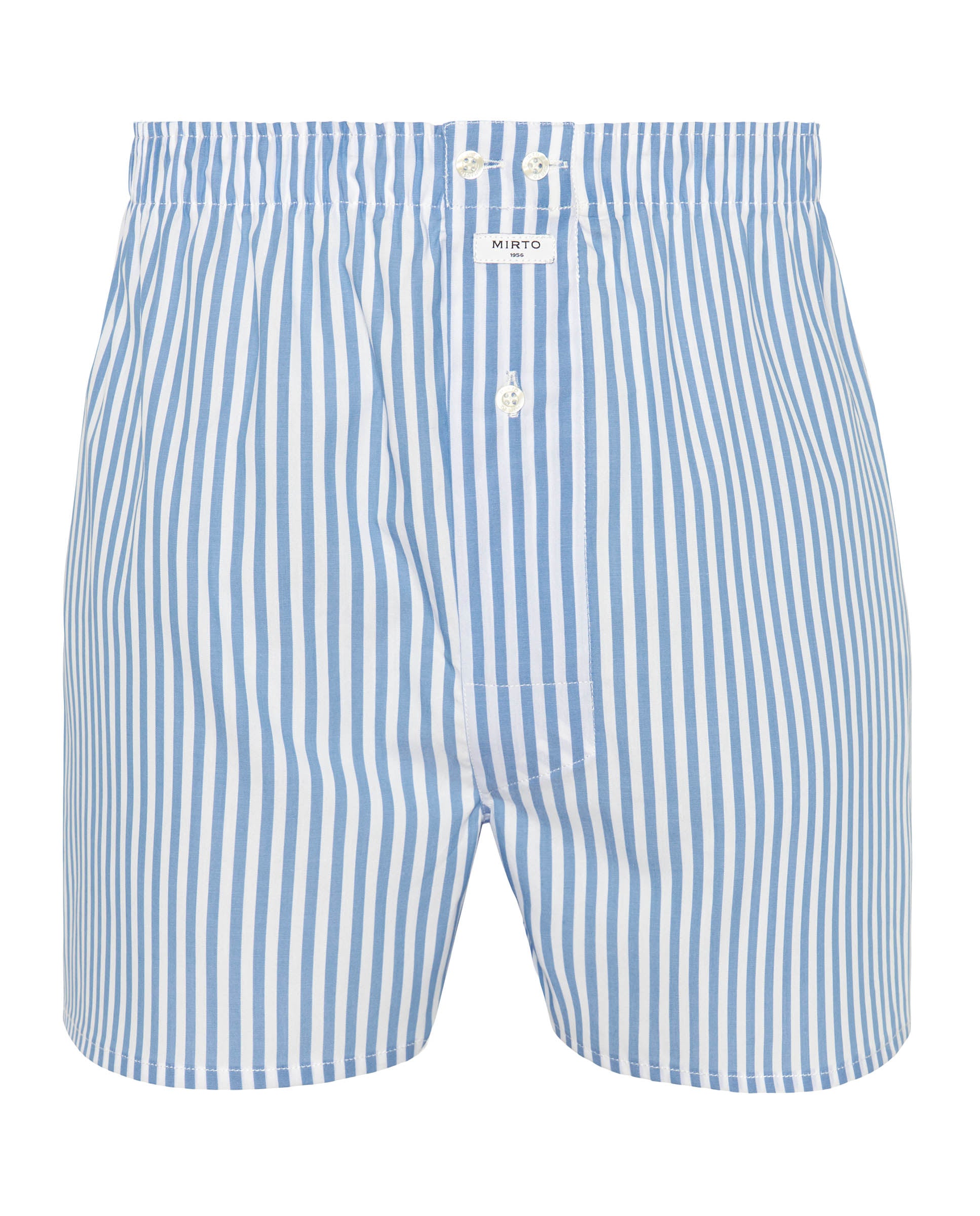 100% cotton striped boxer style underpants, elastic waistband with plush lining, button clousure, american seam with double french stitching at the back.
