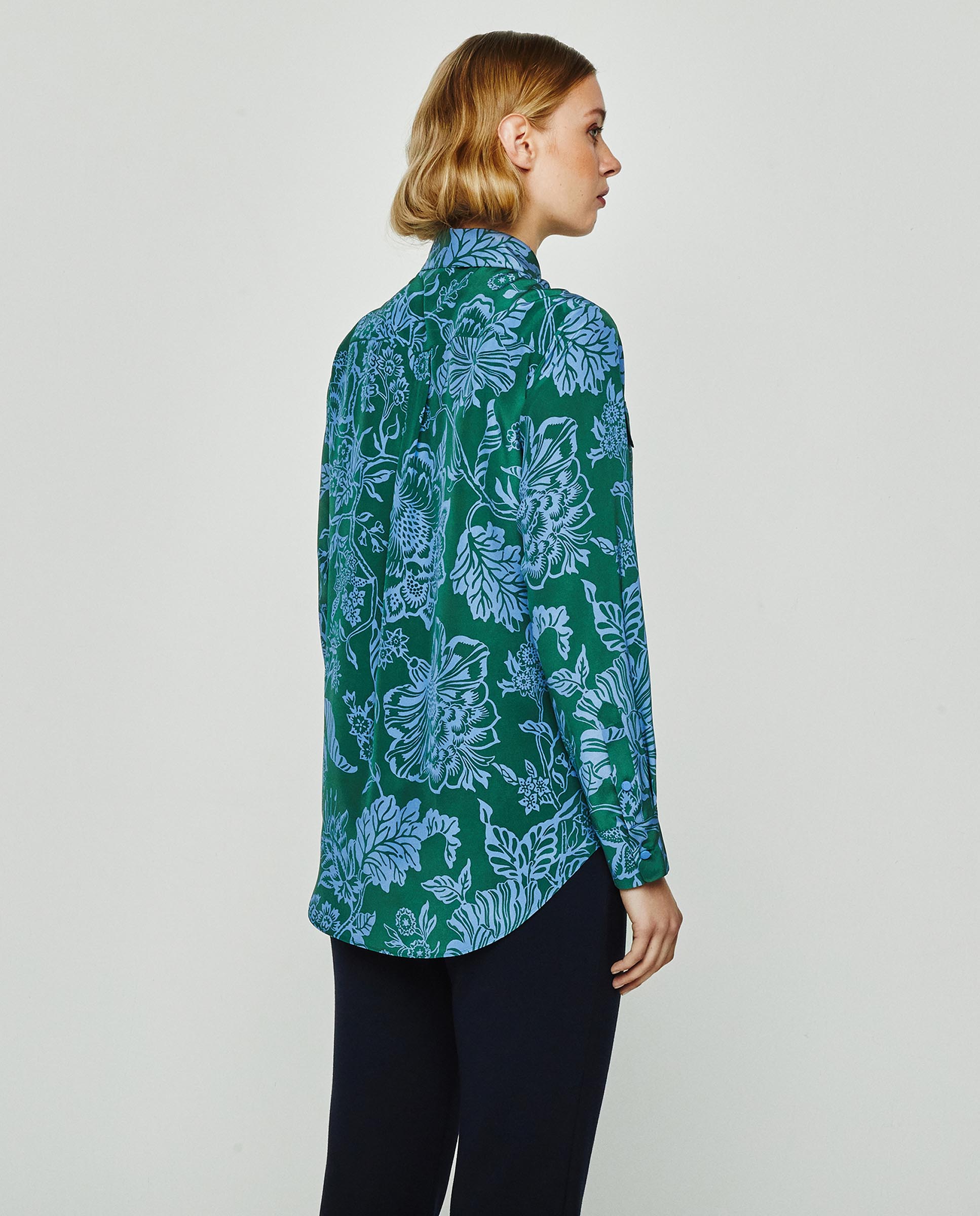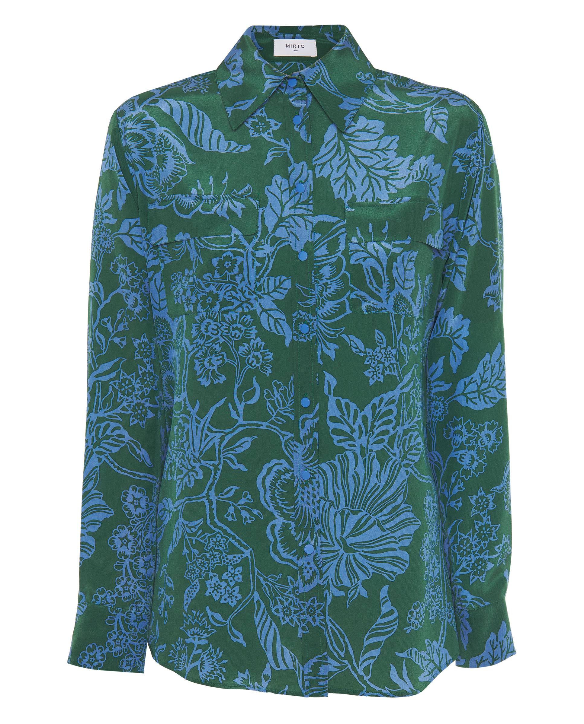 Liberty floral print 100% silk blouse, shirt collar, long sleeves. Two flap breast pockets. A timeless elegant blouse that combines with MIRTO fashion to upgrade your looks and add style.