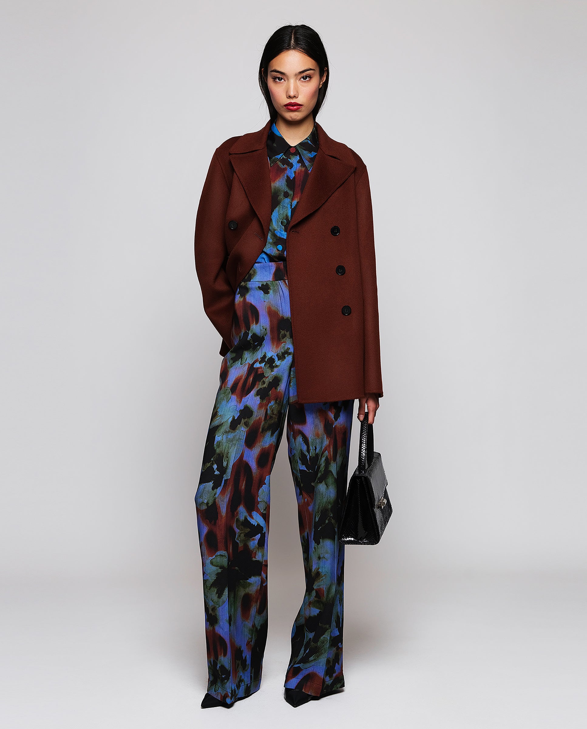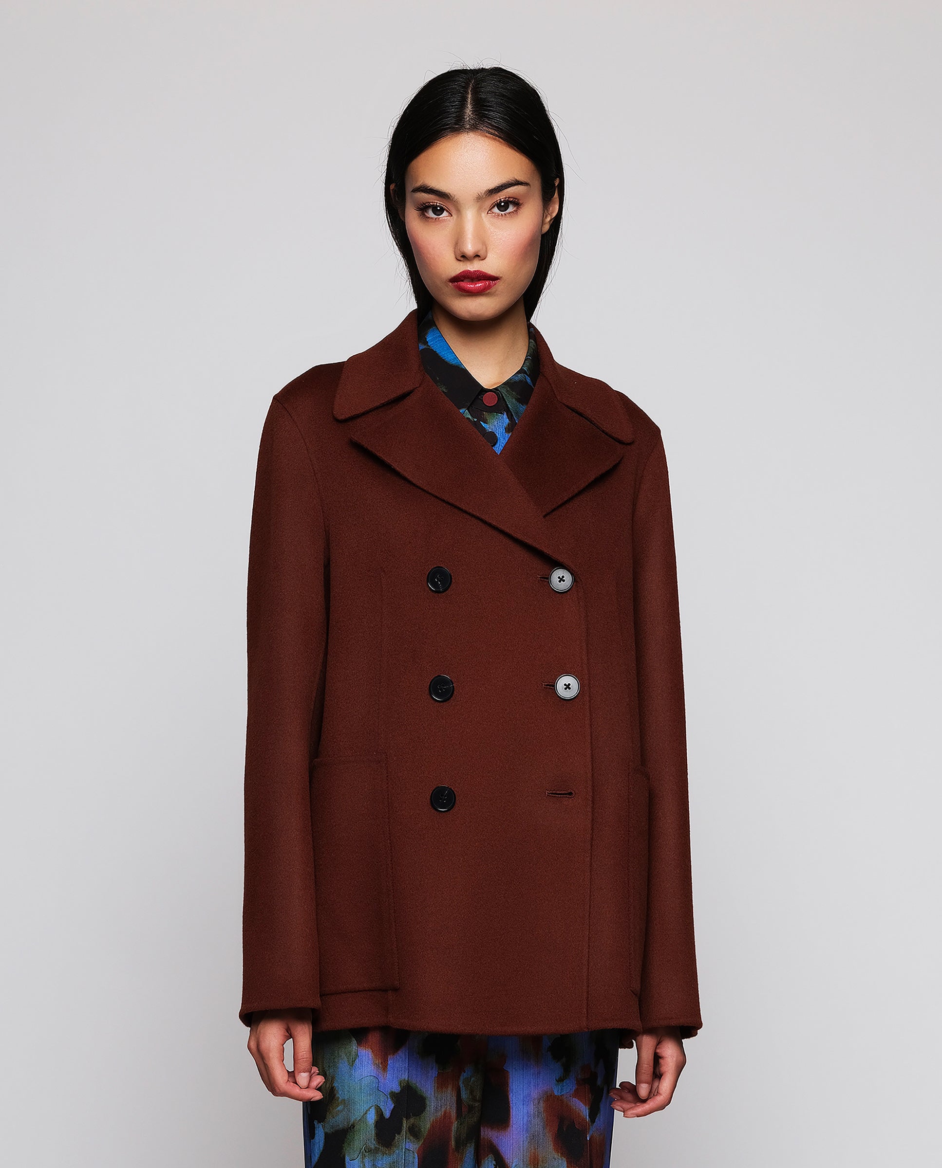 Double-face jacket in wool and cashmere, handcrafted artisanally. Collar, lapels, cross-over fastening, & two maxi front patch pockets. Straight fit. A refined, modern garment that defines fashion essentials: quality, functionality, and style.