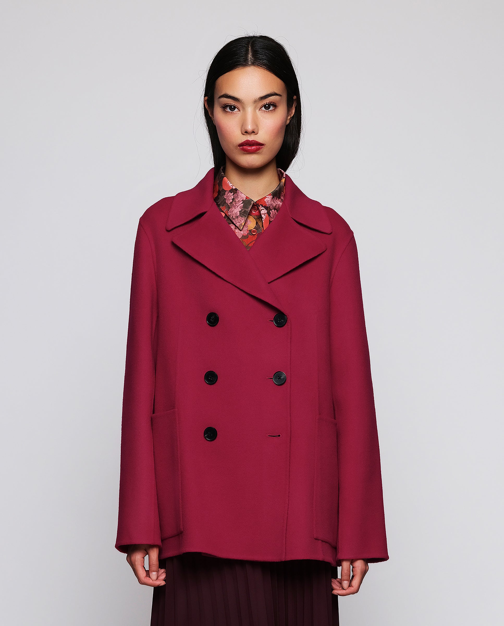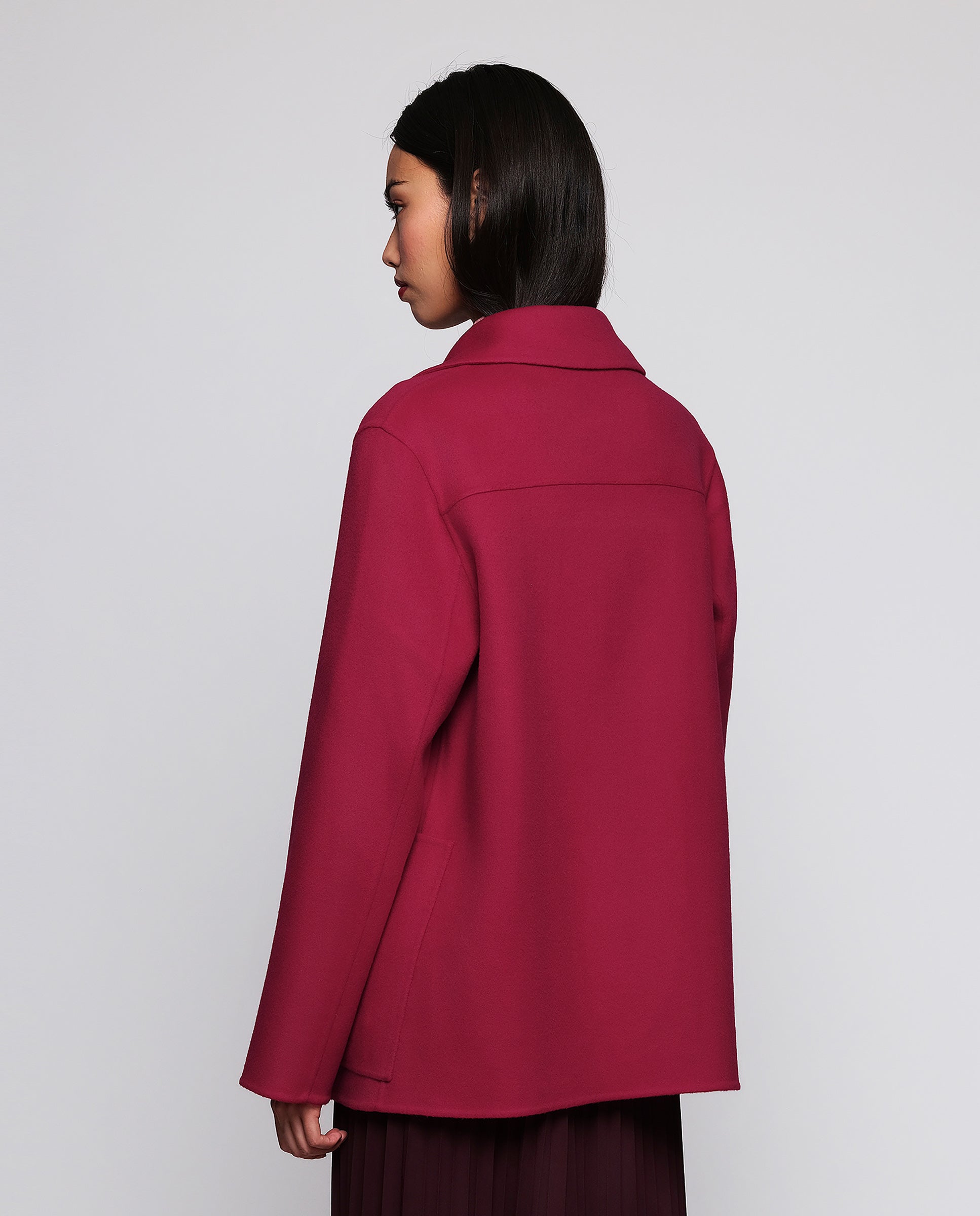 Double-face jacket in wool and cashmere, handcrafted artisanally. Collar, lapels, cross-over fastening, & two maxi front patch pockets. Straight fit. A refined, modern garment that defines fashion essentials: quality, functionality, and style.