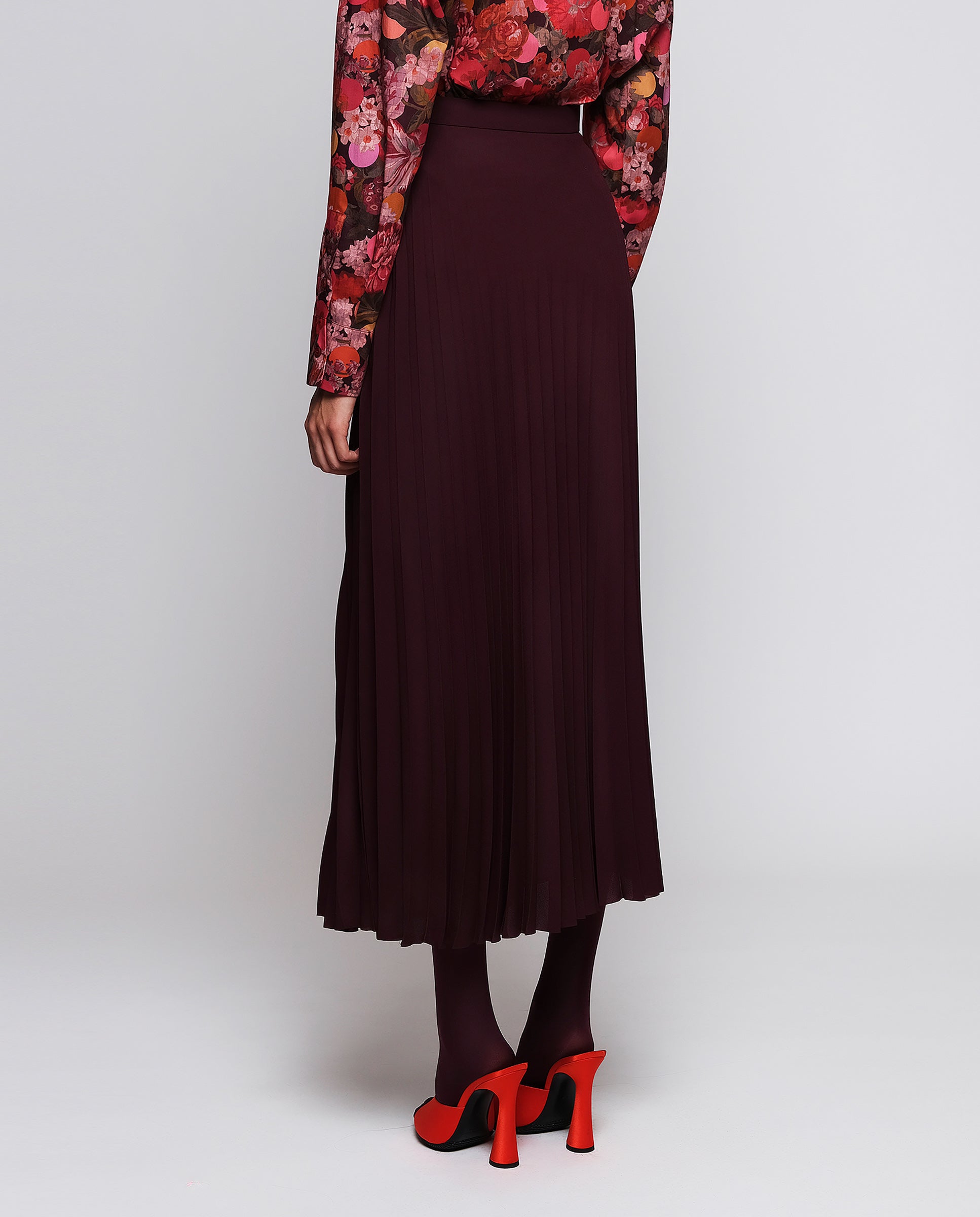 Burgundy midi pleated chiffon skirt. Waistband, invisible side zip fastening. Chiffon lining. A pleated skirt in a naturally sophisticated color that channels versatile elegance. Perfect to harmonise your daytime and evening looks.