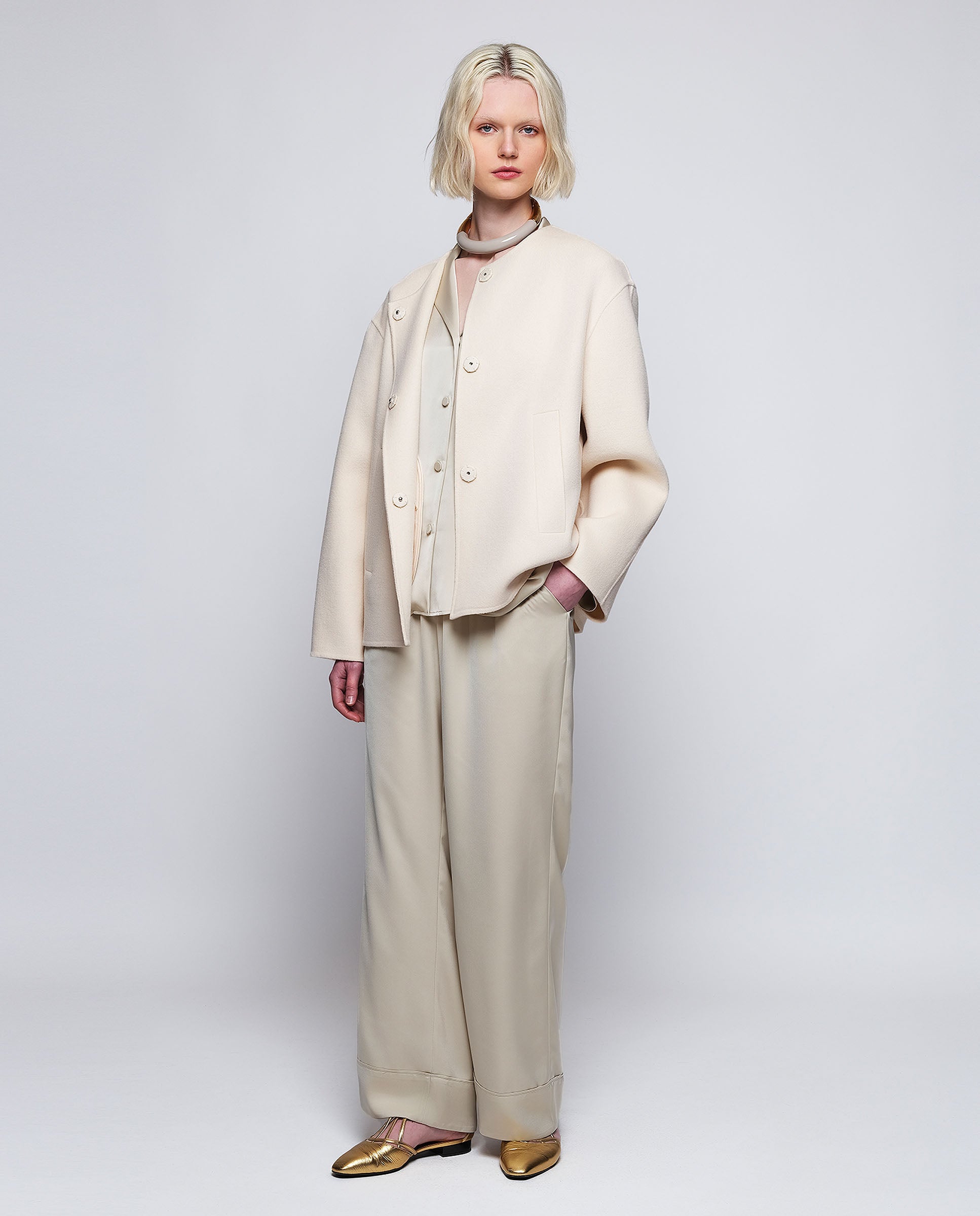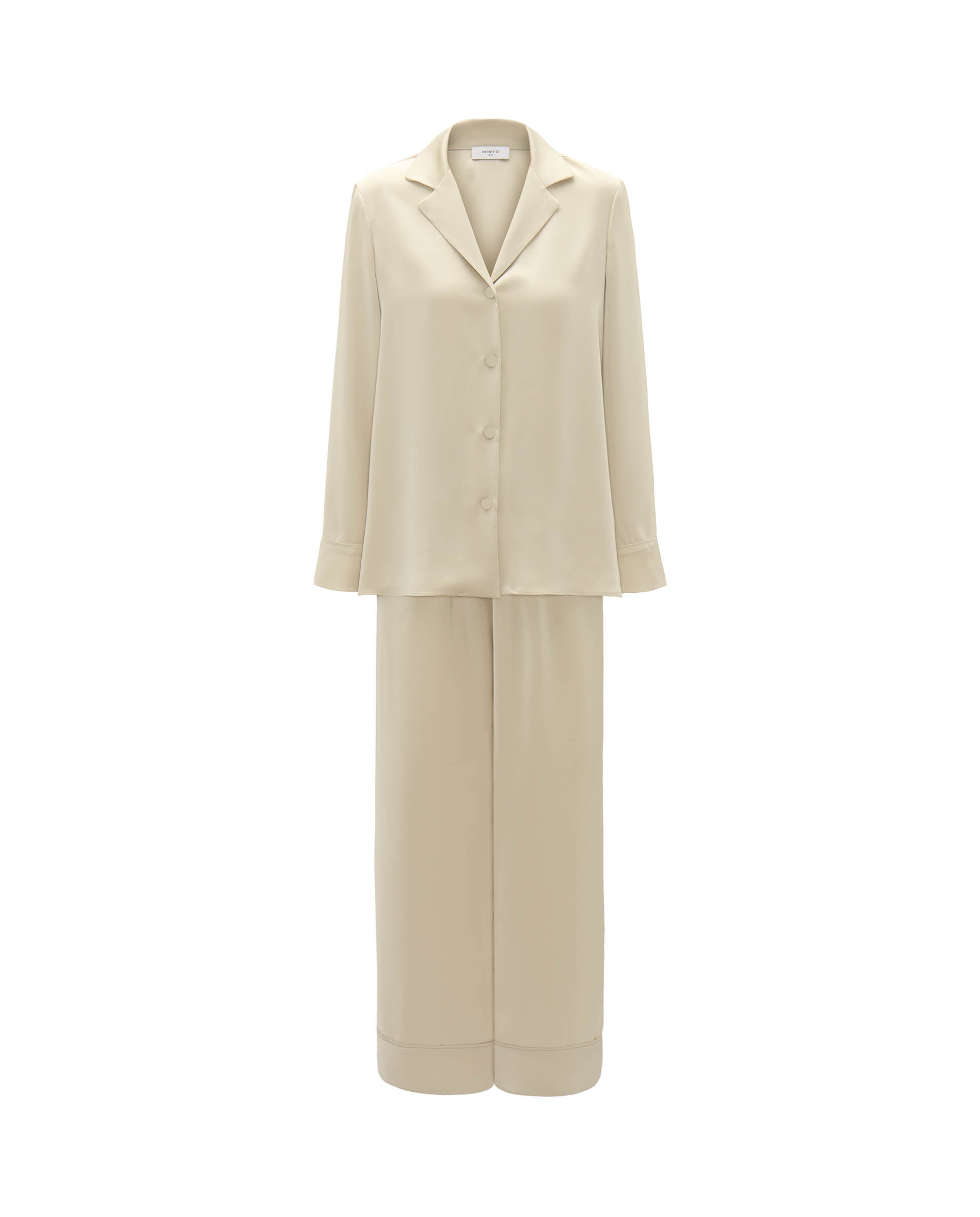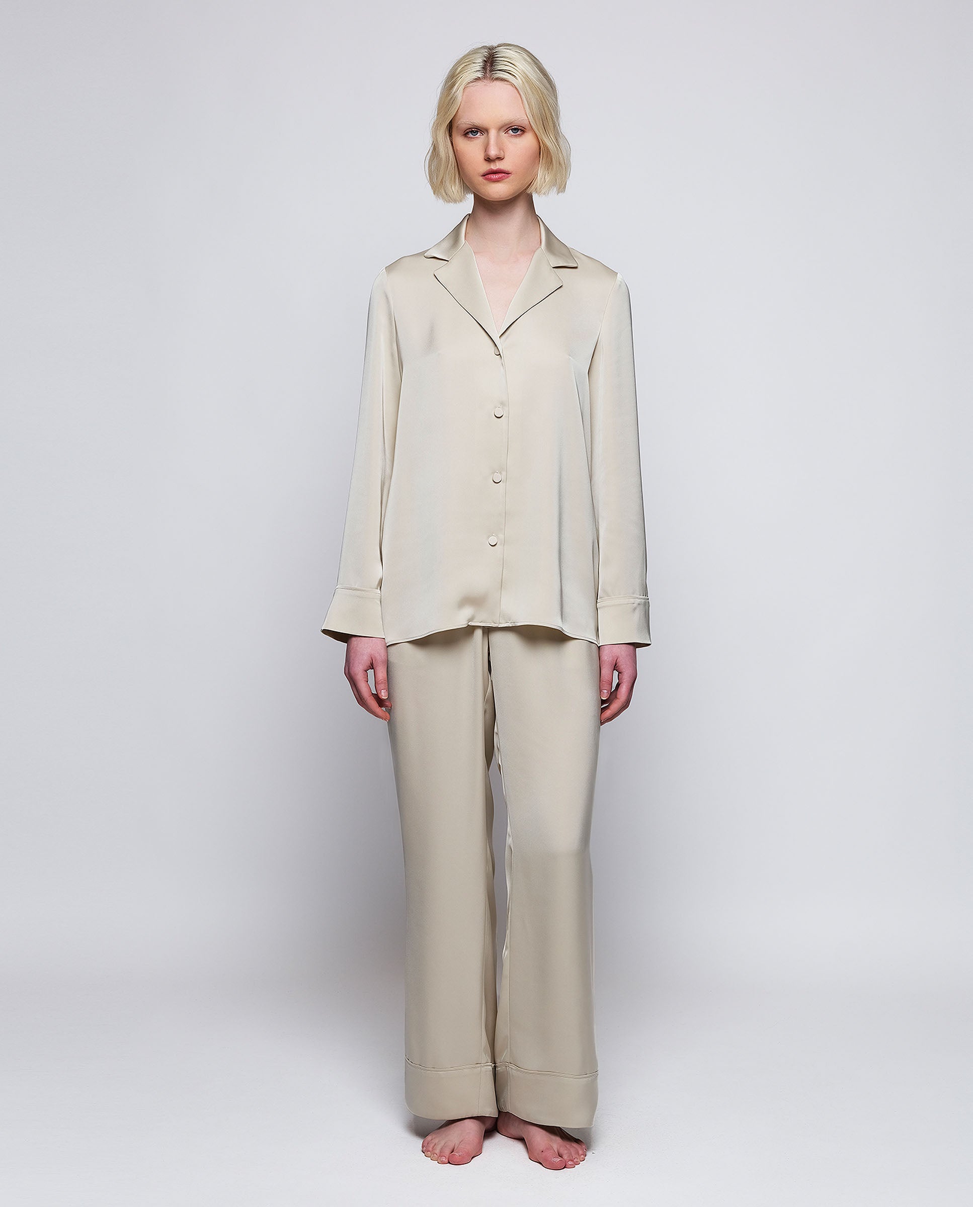 Long, flowing pajamas. Shirt with collar, lapels & central fastening with lined buttons. Pants with elastic waistband & side pockets. Piping details in same fabric. Upgrade your style level with maximum comfort. For home, for you.