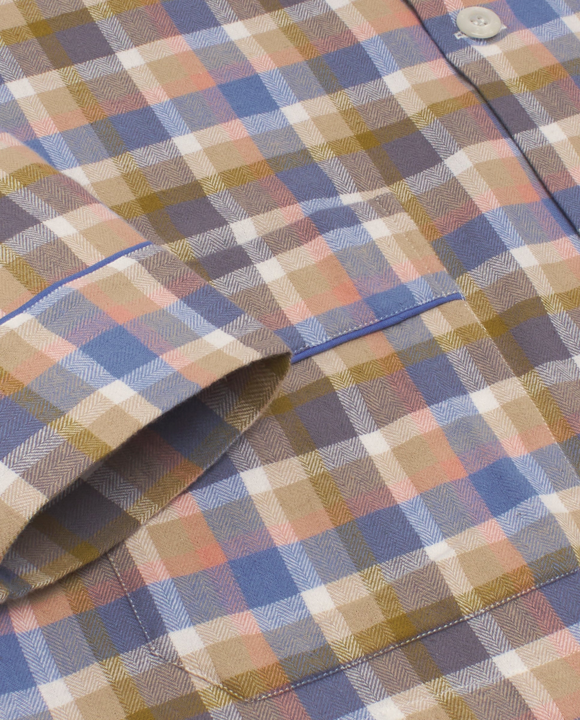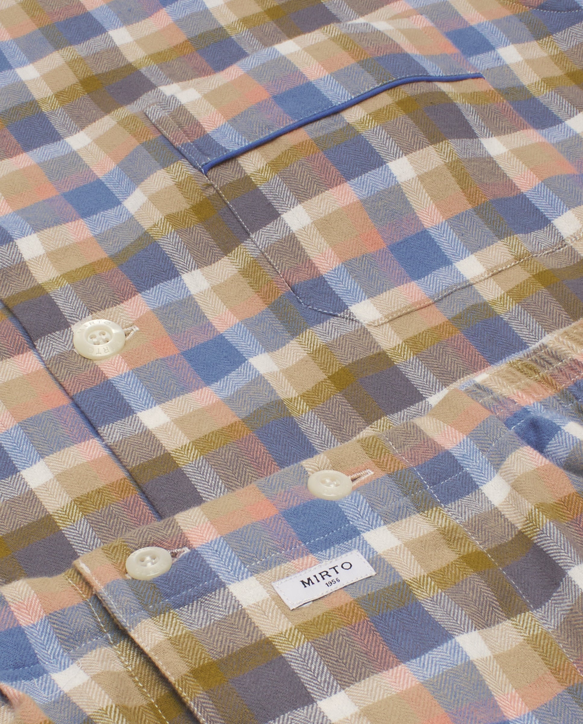 Long, plaid pajama set in 100% cotton flannel with herringbone structure. Open button-down jacket with collar, long sleeves, three pockets, and blue trims. Straight-cut long pants with an elastic waistband and button closure.