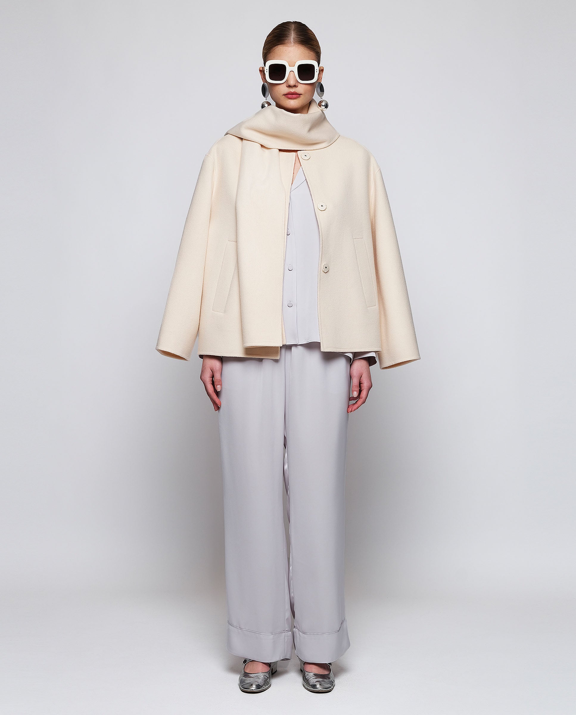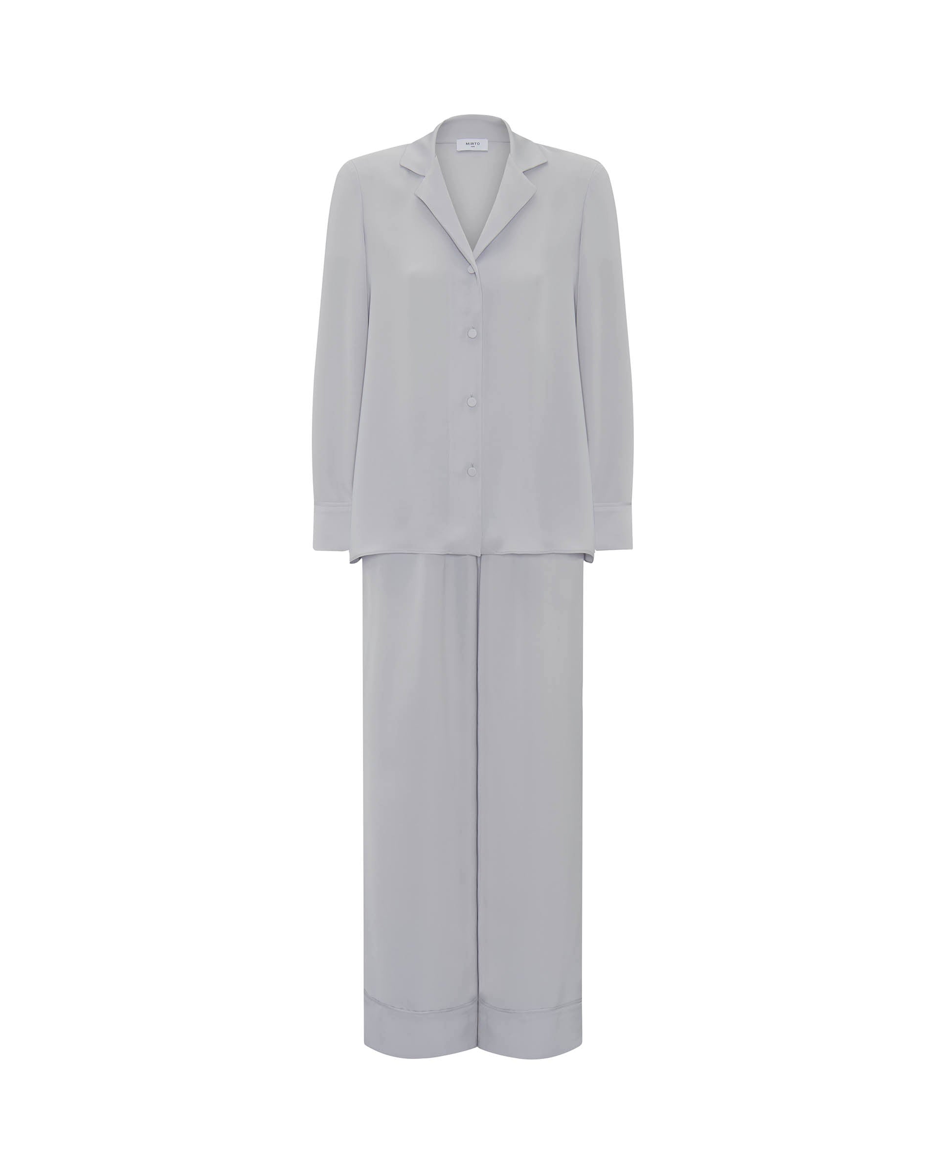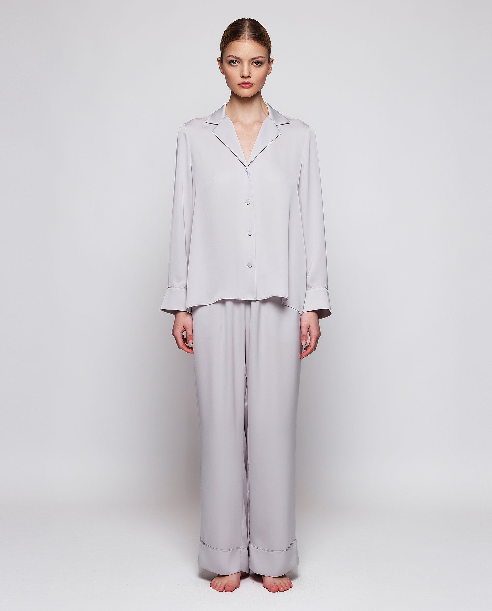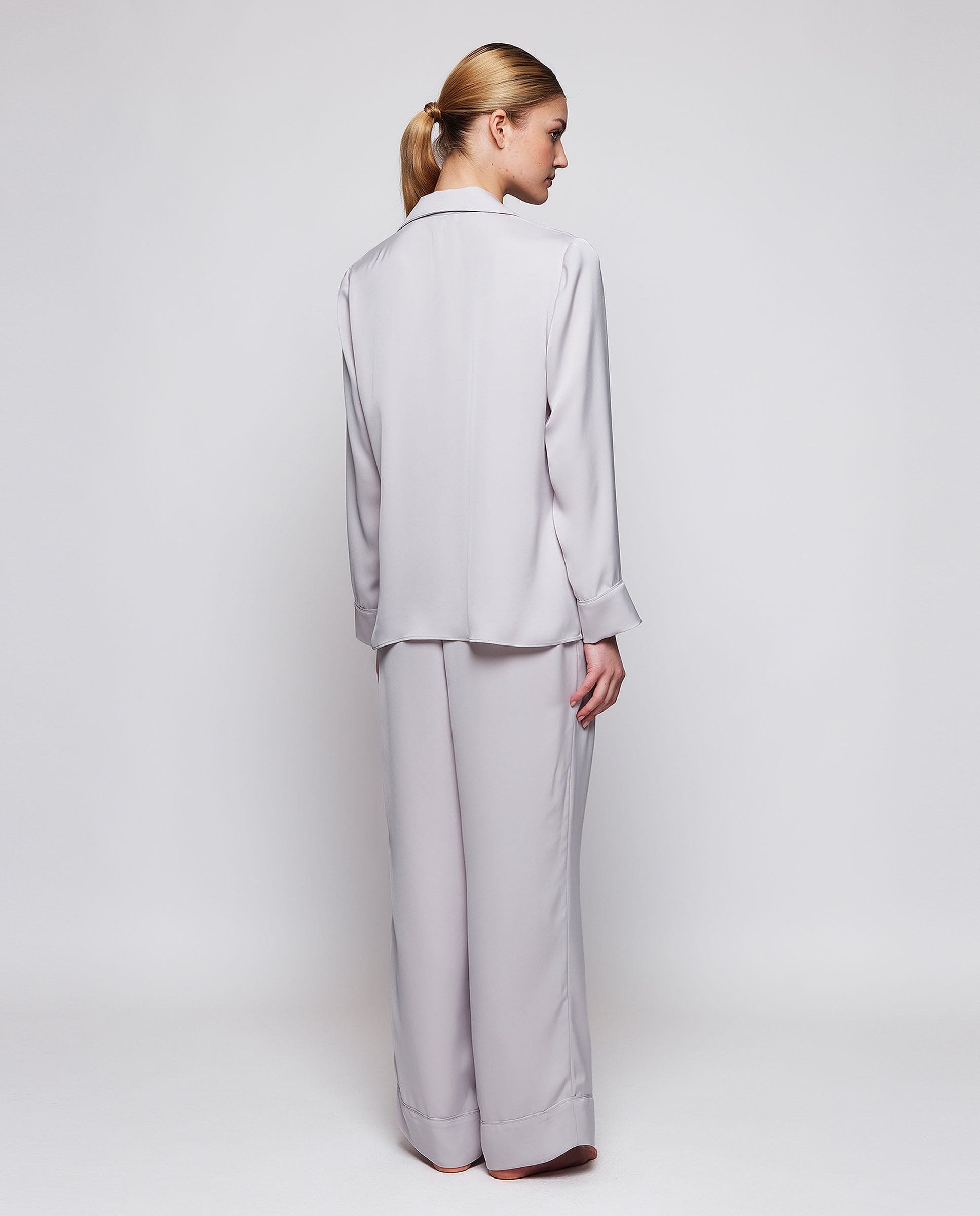 Long, flowing pajamas. Shirt with collar, lapels & central fastening with lined buttons. Pants with elastic waistband & side pockets. Piping details in same fabric. Upgrade your style level with maximum comfort. For home, for you.